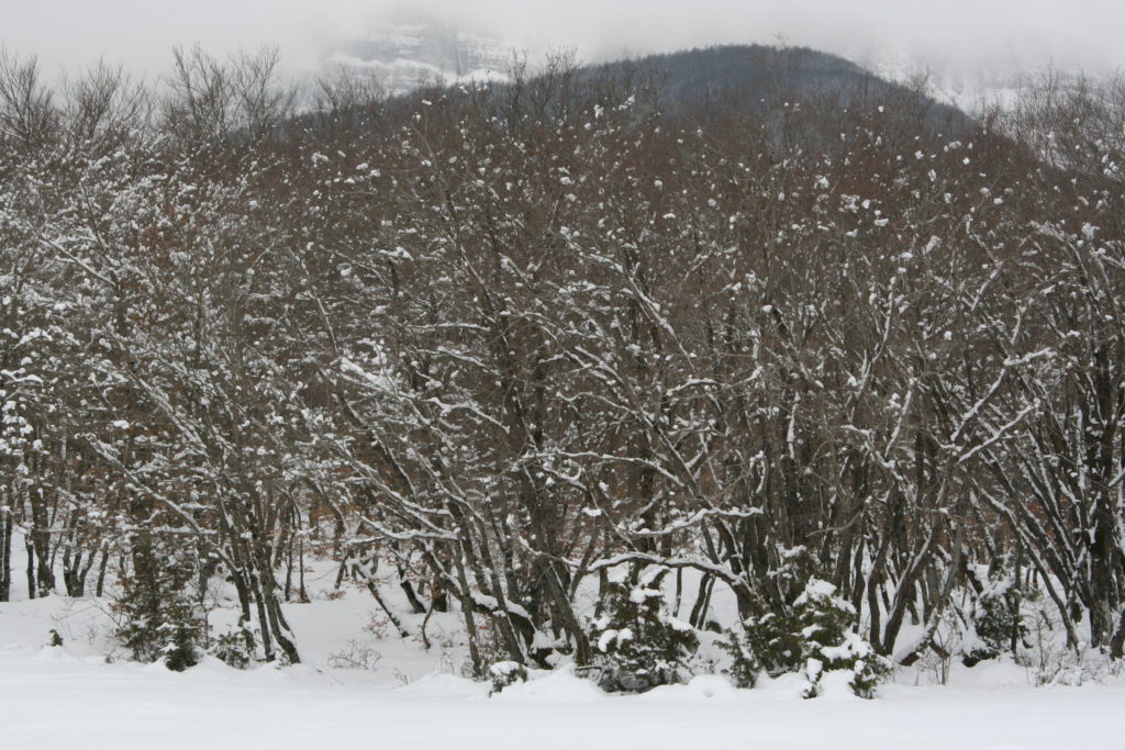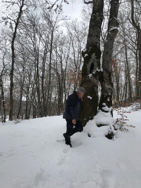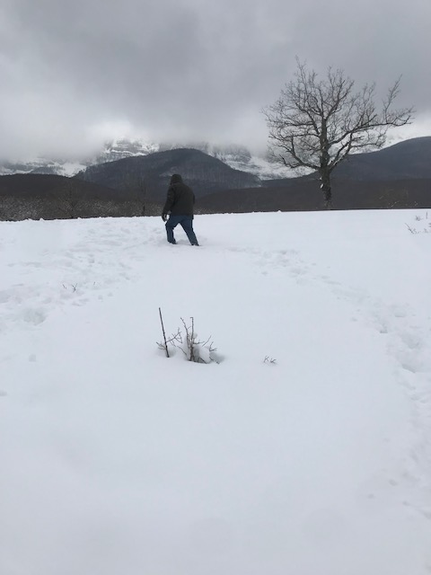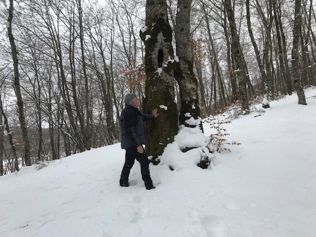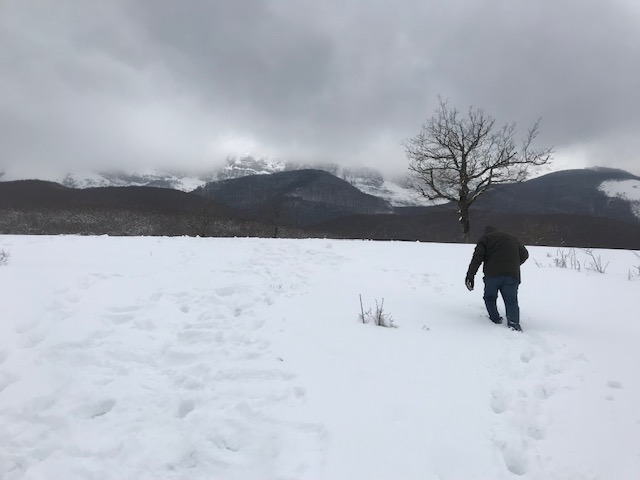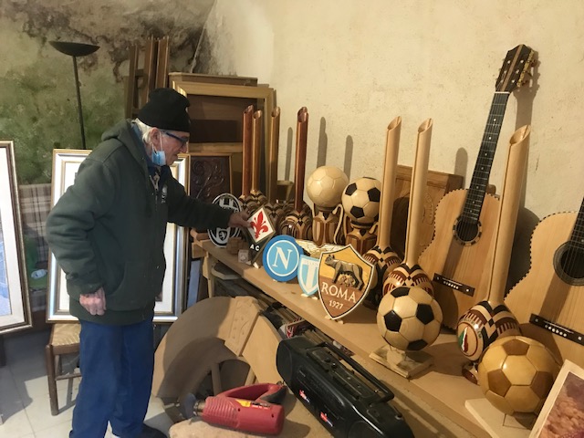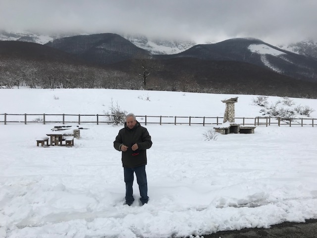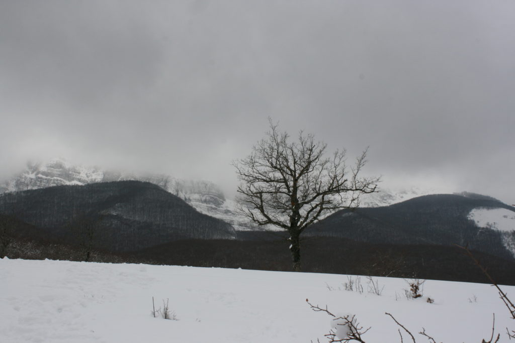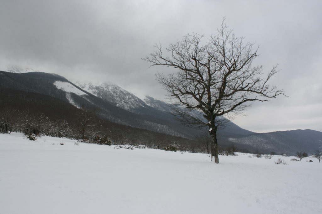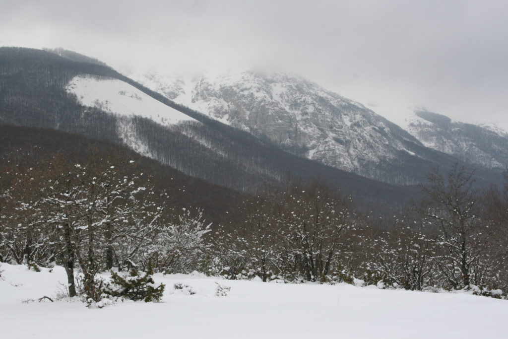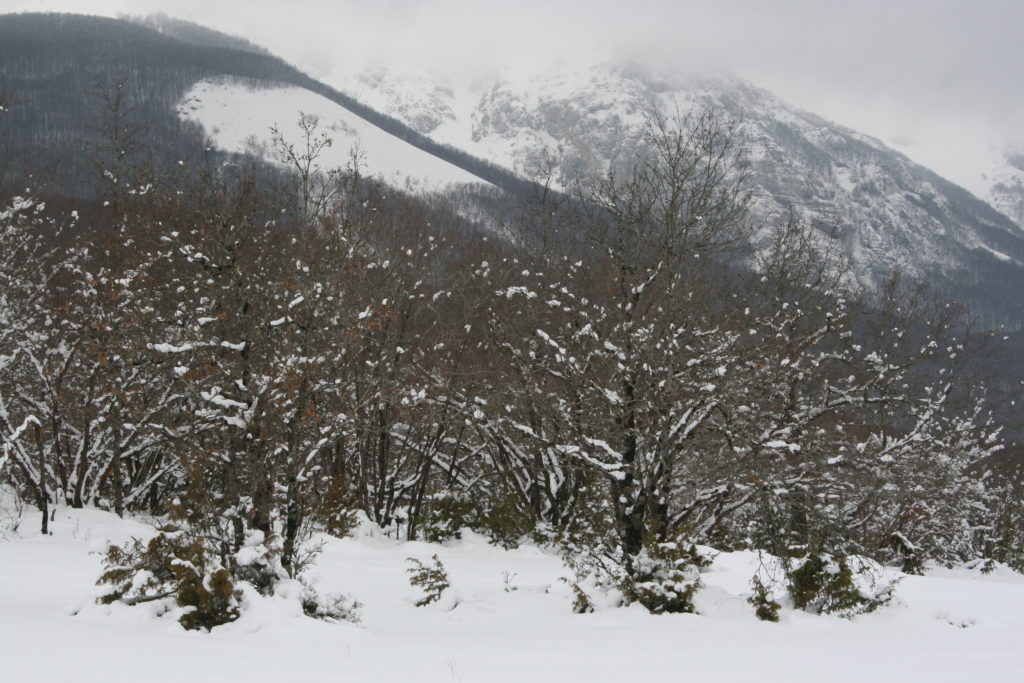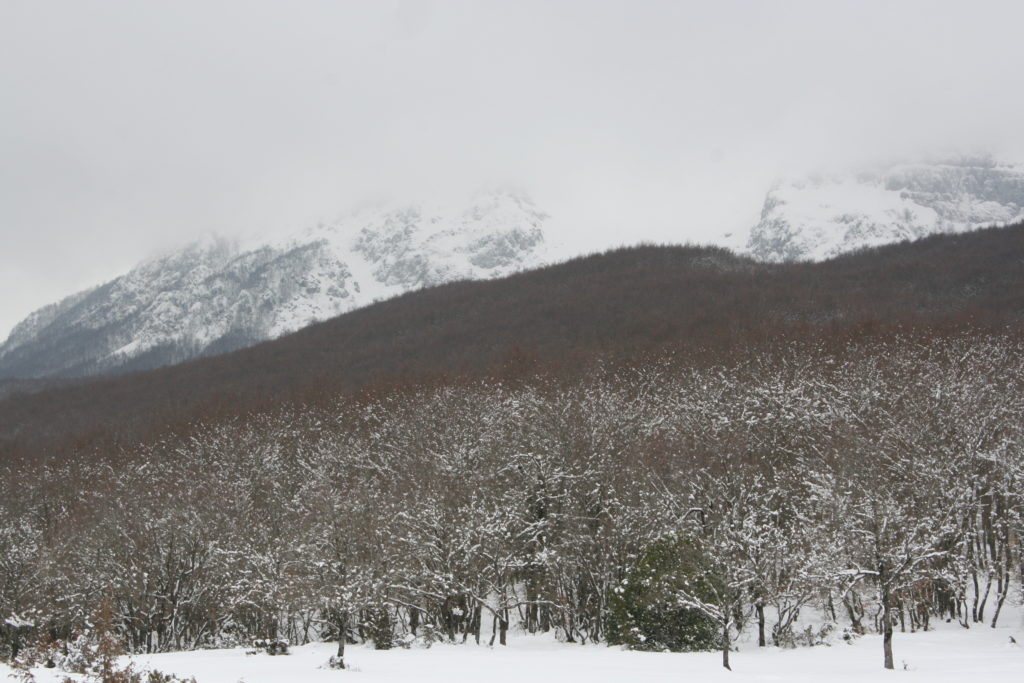 “Sono nato a pane e mazzocche a Secinaro. Si mangiava come meglio trovavi in giro: patate per esempio. Andavi in campagna, si raccoglieva tutto, anche le sorbe per sfamarsi. La polenta si preparava dentro il caldaio al camino. Si accendeva il fuoco. La farina di granturco si prendeva al mulino di Gagliano Aterno (elettrico). Anche a Molina lungo il fiume Aterno c’erano due mulini con le macine in pietra mosse dall’acqua che frantumavano grano e granturco. Il mugnaio voleva dieci chili per un quintale di farina di granturco. Con il setaccio la farina si doveva filtrare, ma molte famiglie la mangiavano anche con la crusca. La polenta si girava nel caldaio per farla impastare almeno per un’ora. Si metteva sopra la “spianatora” in legno, non c’erano i piatti, anche dentro il bacile smaltato. Si condiva con il grasso di maiale, la ventresca. Del maiale lavorato non si buttava niente. Nei pomodori la ventresca e si condiva così il sugo. Il giorno dopo di nuovo la polenta. Ogni famiglia aveva almeno dieci pecore, dieci capre, due o tre muli o somari per andare in montagna a prendere la legna. Le minestre erano preparate con i fagioli al fuoco del camino, si ammassava la pasta e si ammassavano le sagnette (sopra l’arca di legno) appunto con fagioli. Nella fiera di sant’Agata, il 5 febbraio, a Castelvecchio Subequo si comprava un maialino piccolo, si teneva l’estate e a novembre lo scannavi per la carne, per il fabbisogno della famiglia. Le rape, la cicoria, i finocchi, i cavoli si mettevano in fila, coltivati, per avere una grande produzione. Così i prodotti si vendevano a Rovere, andavi con il somaro e le ceste cariche di ortaggi. Si barattavano con le patate, non c’erano allora i soldi. Si partiva verso L’Aquila, a Fossa prendevamo le lenticchie, ceci, cicerchie e fagioli che si coltivavano lungo il fiume Aterno, e sempre con il baratto. Le pizze dolci si cuocevano sotto il “coppo” del camino con quello che avevi in casa. Allora la neve era tanta, il paese era completamente coperto, non uscivi per lavorare. Si usavano i sacconi come materassi, dentro le foglie di granturco. Le lenzuola in cotone dei sacconi tessuti al telaio in legno e si scaldavano con il ferro da stiro ( in ferro battuto) poggiato sulla brace del camino. In montagna si raccoglievano le fascine di faggio, si vendevano nei paesi. Si partiva verso l’una di notte e si arrivava a Pratola Peligna per barattare le stesse fascine con qualcosa da mangiare. Le famiglie avevano anche sei o sette figli a Secinaro. D’inverno dentro le case si scavava con il piccone per avere altri spazi. Anche i somari si usavano per portare via la rena che si toglieva dalla roccia. Caricata dentro le bigonce in legno si trasportava. La breccia più fine si passava con un setaccio e si utilizzava per sistemare gli intonaci della casa. Dentro le grotte così ricavate si metteva di tutto: patate, mele, maiale ad essiccare, pere, uva e mele cotogne. D’estate al Sirente si costruivano le capanne, al piano della Ghia e a Sacco Sirente. Si restava lì molte settimane per tagliare la legna e trasportarla con i muli. Si mangiavano le minestre con le patate, verdure, cicoria e tutte cotte al caldaio, oppure la zuppa con il pane secco, il pancotto con le foglie di lauro. Dentro le capanne ci dormivano fino a quattro persone”.