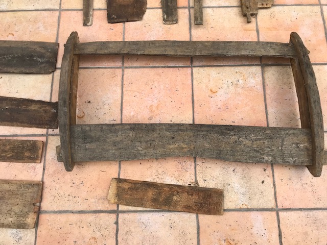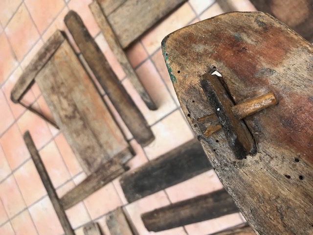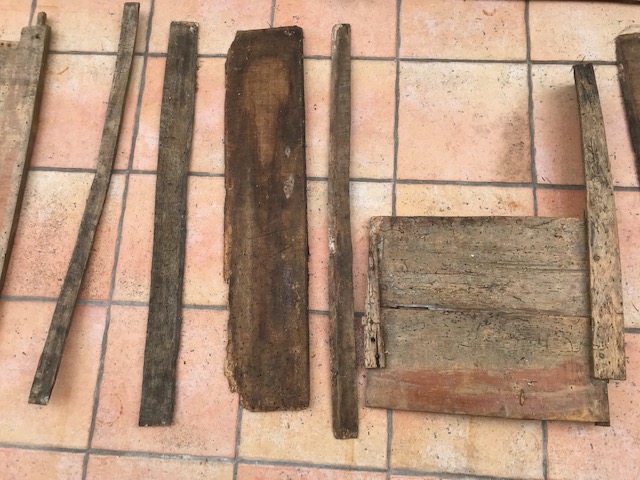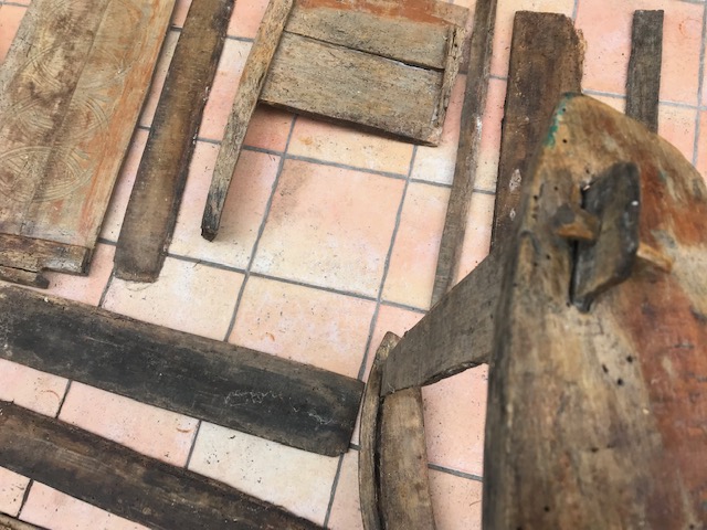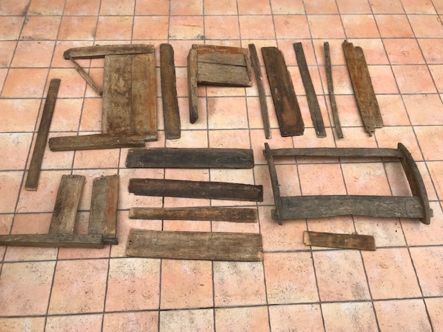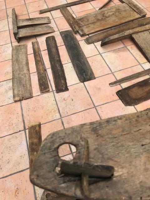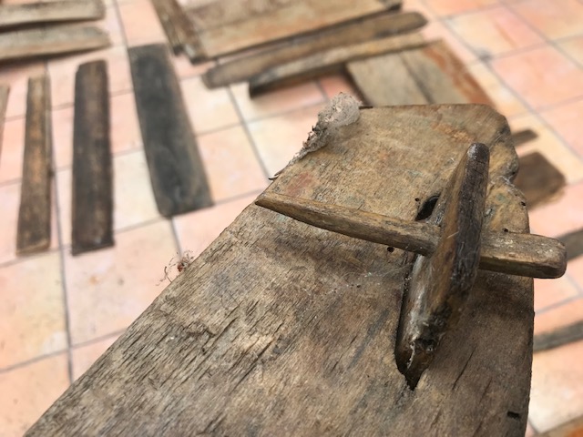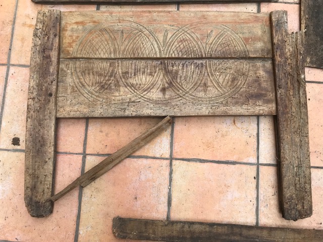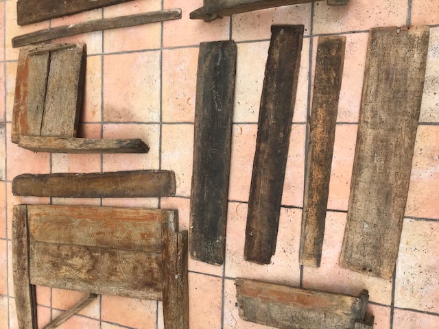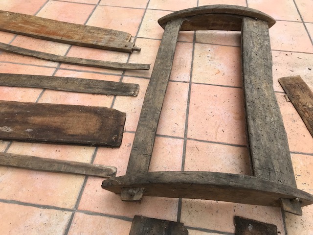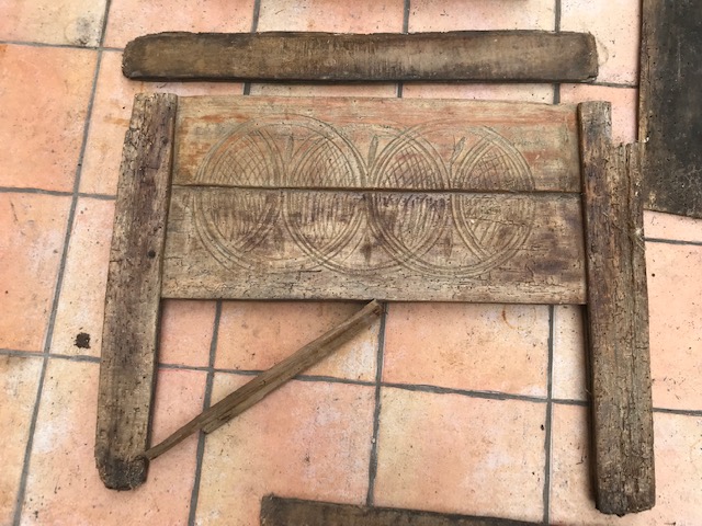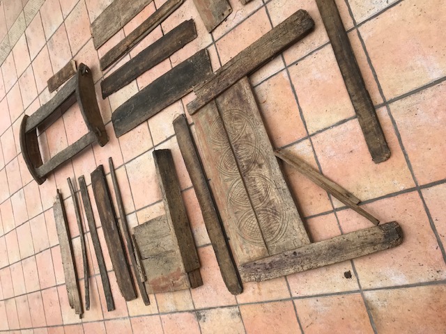 Nel piazzale della casa dei fratelli Barbari a Secinaro l’arca in legno di faggio aperta e scomposta in attesa del restauro. L’arca è stata costruita intorno al 1890.