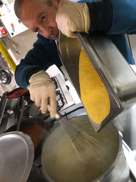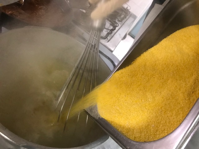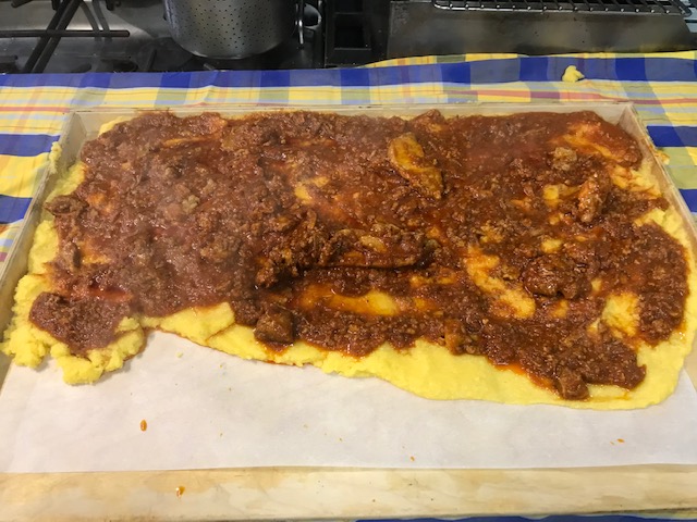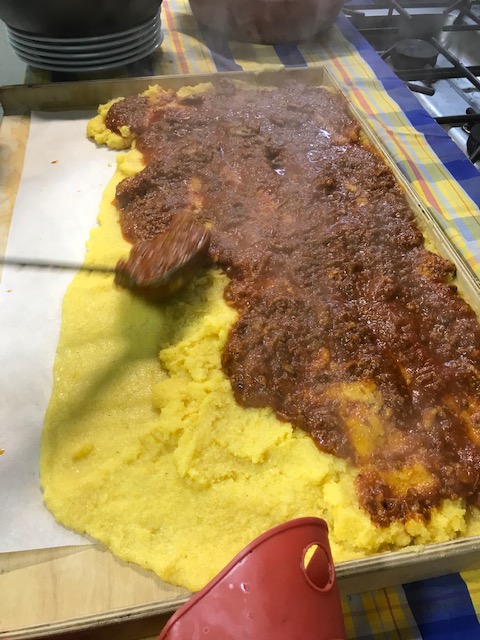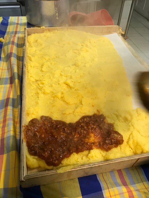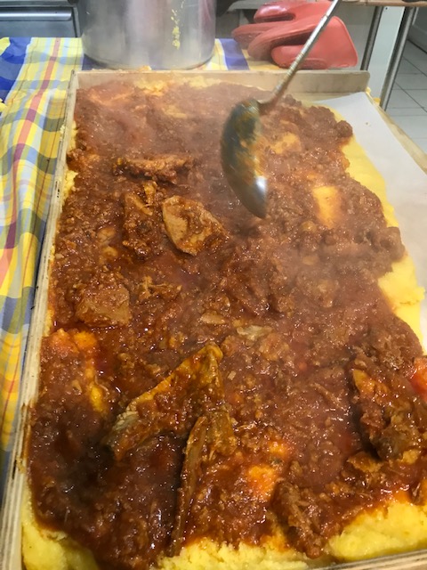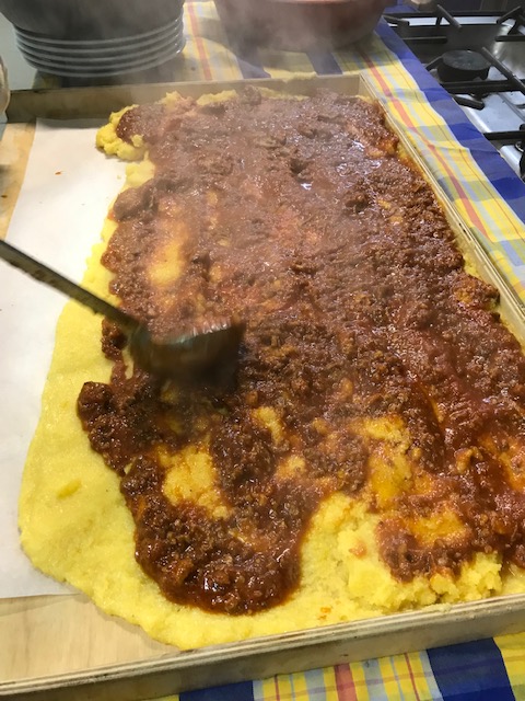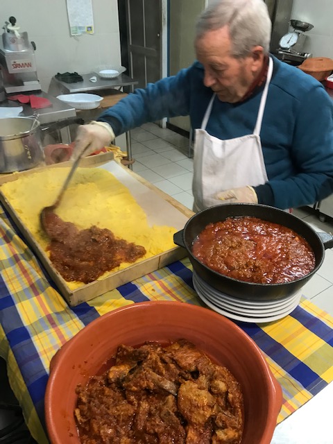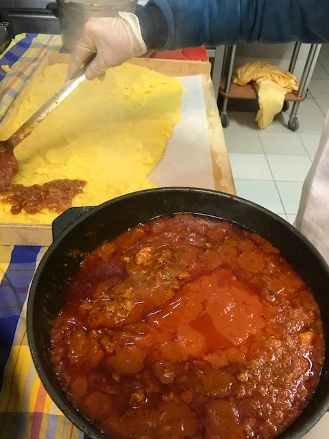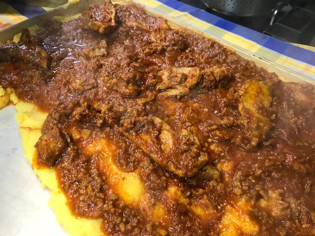 Polenta con il sugo, salsicce, spuntature di maiale, brodo con carote e cipolle.