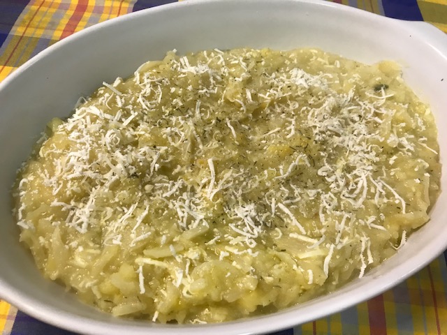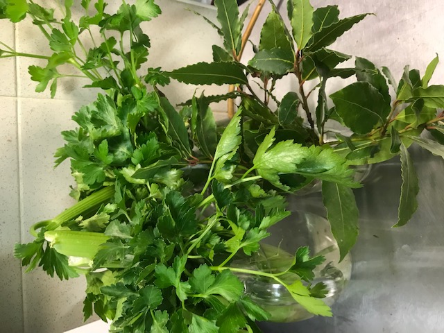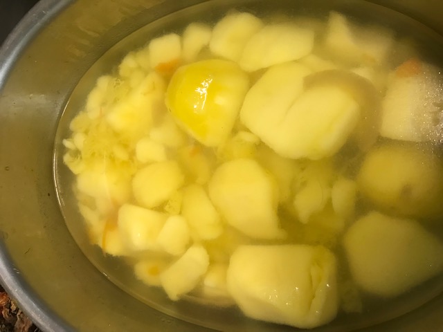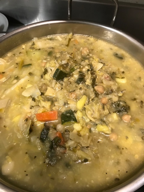Minestra con patate, cavoli, ceci, carote, cipolla, sedano, finocchio, e verdure varie.