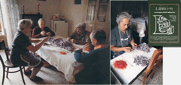 Mostra etnografica sull’Altopiano di Navelli e lo zafferano, presentata alla Rassegna Nazionale dell’Editoria. Biblioteca Nazionale, Roma, anno 1991. Nella foto, la separazione degli stimmi (di color rosso) di zafferano dal fiore.