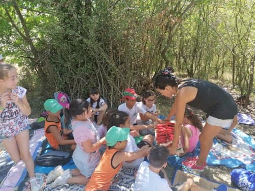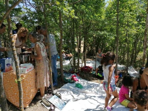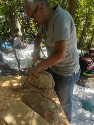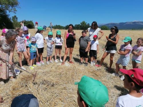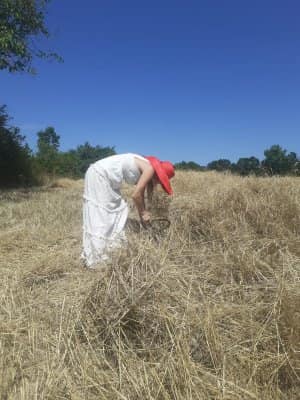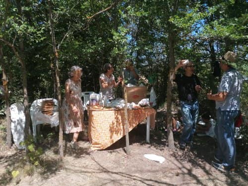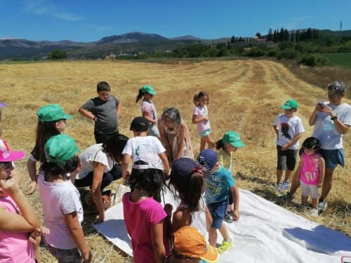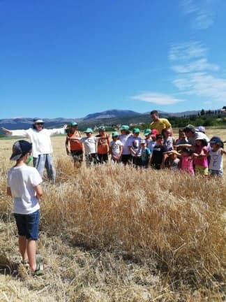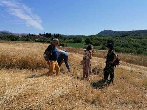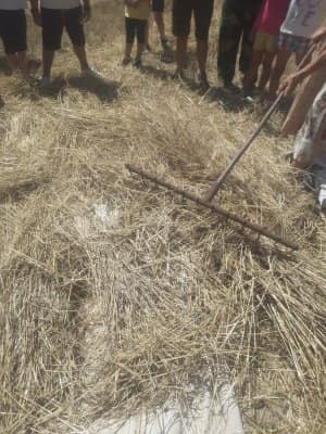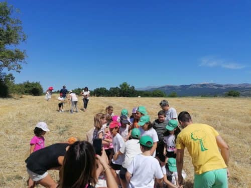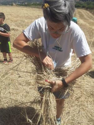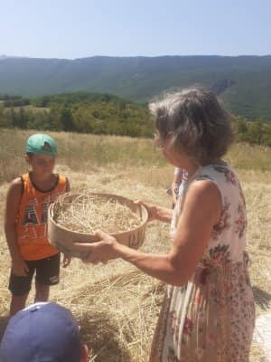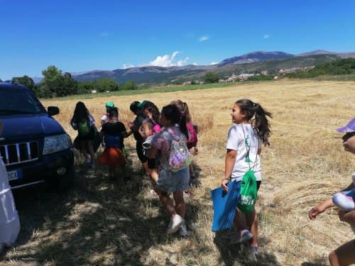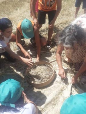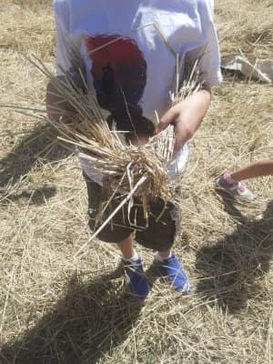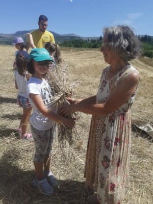 A poco più di una settimana dall’evento della MIETITURA, scrivo una breve cronaca illustrata dalle numerosissime foto inviatemi dagli amici intervenuti ad animare e rendere gioiosa questa giornata. Prima di tutto vorrei ringraziare Cristina De Matteis che per il secondo anno “porta “ qui a San Demetrio i bambinidella Scuola Estiva di Fagnano Alto con la Maestra Chiara Terenzi e Donato Porrelli, poi il Prof. Vincenzo Battista per la sua partecipazione all’evento con I suoi racconti e favole attinenti al grano ed alla tradizione della mietitura, Lucio Marinangeli che mi ha sempre spronata a continuare e infine per la prima volta, Alessandro Taddei portavoce della Fondazione Senatore Cappelli.Come lo scorso anno, i bambini della scuola estiva sono stati i veri protagonisti, abbiamo mostrato loro gli antichi attrezzi gentilmente concessi da Roberto Mirabella , da Quintino Ciccone che quest’anno aveva un impegno improrogabile che non gli ha permesso di intervenire e da Eleonora. Alle 10.00 puntualissimi erano sul campo. Guidati dagli adulti, hanno raccolto le spighe di grano tagliate con le sarrecchie (falcetti) e confezionati i manoppi (covoni) che sono stati legati con i vàvse ( legacci) fatti con gli steli di grano interi. Steso un pannozzo (panno di canapa tessuto al telaio), vi sono poi stati adagiati tutti i manoppi subito ricoperti con un altro pannozzo. A questo punto i bambini hanno avuto via libera di saltarci sopra con tutta la loro energia. Abbiamo così rievocato la “trescatura”, quell’operazione che serviva a liberare le cariossidi, i chicchi di grano, dalle loro spighe quando ancora non esistevano le grandi trebbie. Quindi, con un rastrellodi ferro fatto a mano, una volta era di legno, abbiamo spostato la paglia pestata ben bene e raccolto il grano con grande gioia e incredulità da parte dei bambini.Completato il lavoro abbiamo steso i pannozzi al riparo dal sole dentro una radura ombreggiata da olmi, noci e rami di biancospino. Qui prima del “pranzo del mietitore” ci siamo seduti ad ascoltare il Prof. Vincenzo Battista con il racconto della Madonna Nera che nelle storie popolari rappresentava le povere donne che, prive di un loro campo di grano, andavano a raccogliere I chicchi che rimanevano nei campi. Poi la favola del grano sul monte Cerro nella quale un ricco possidente viene punito per la sua avarizia. Il silenzio, la voce profonda del narratore, gli sguardi attenti sotto l’ombra e il verde della vegetazione, hanno creato momenti magici ed emozioni.Infine il “ pranzo del mietitore” a base di pane Senatore Cappelli e pomodori conditi con sale, olio, basilico e origano, pizza e mortadella portata da Lucio, una “fiorita” crostata di marmellata di zucchine fatta da Sonia Masulli e poi il cocomero fresco.