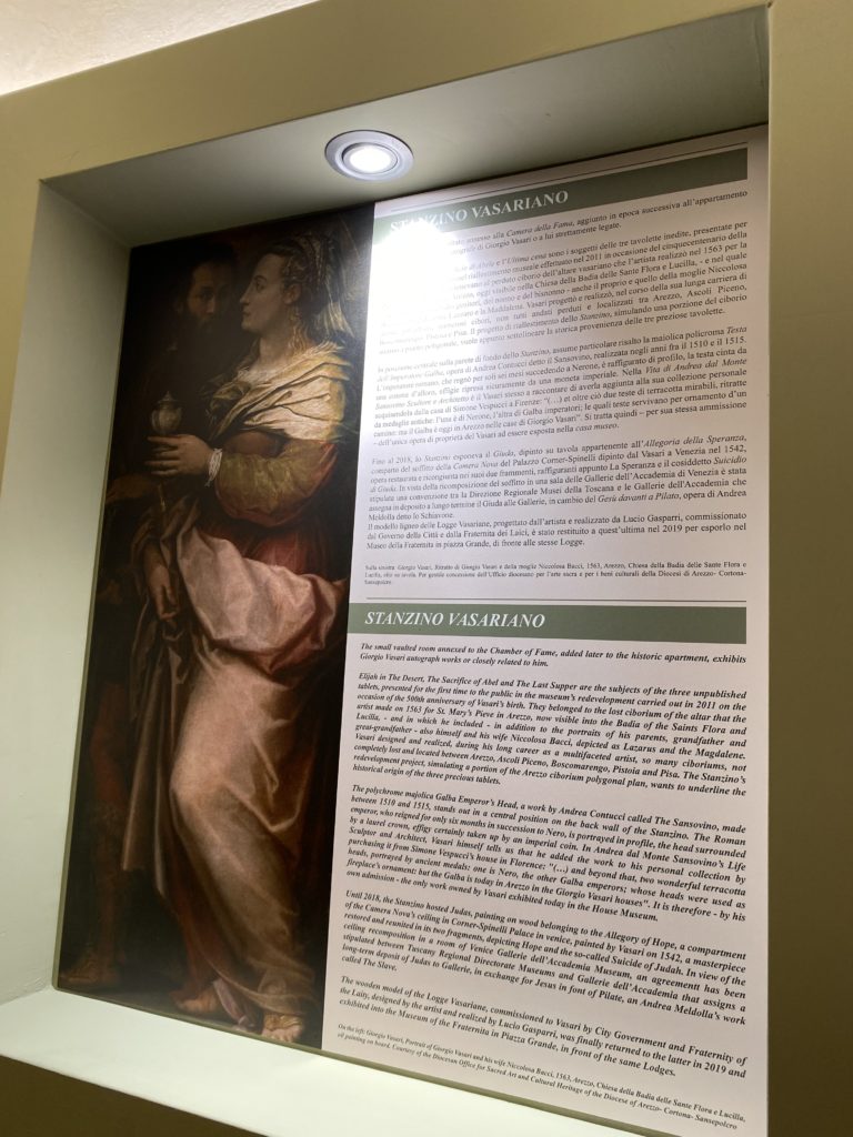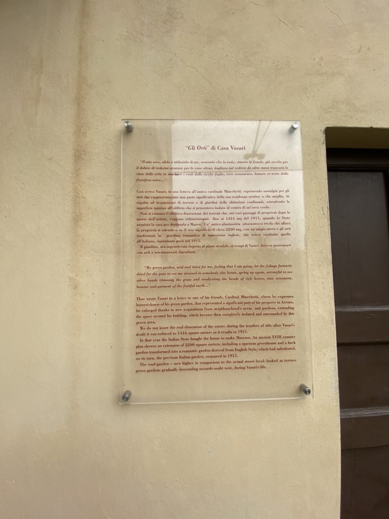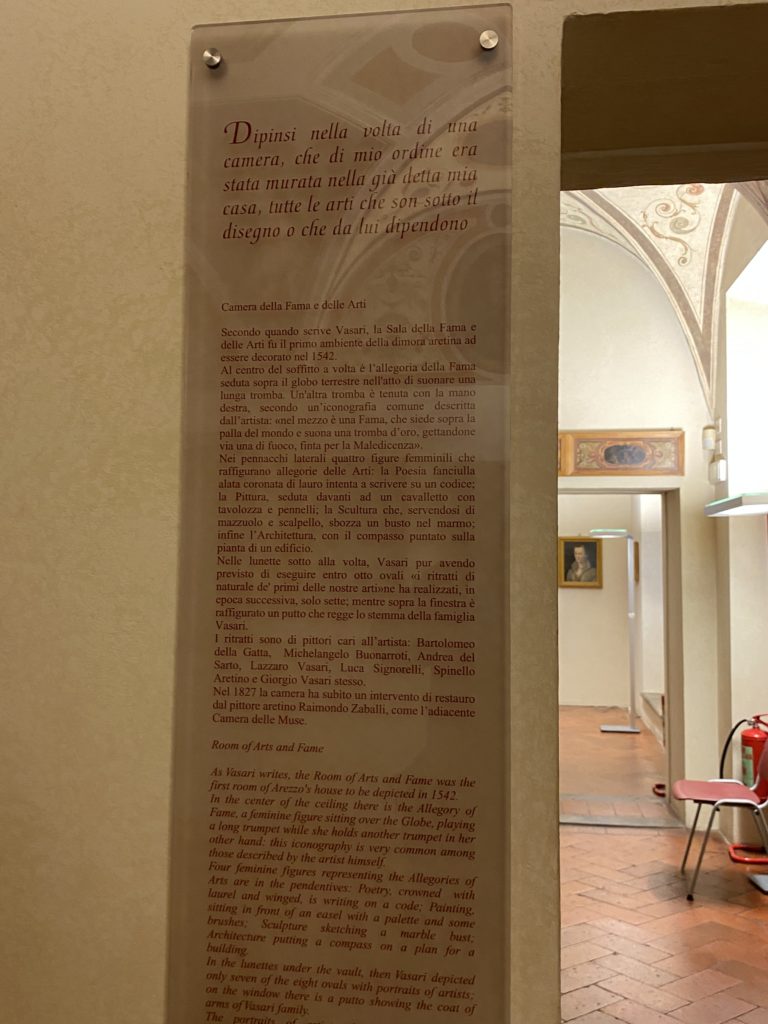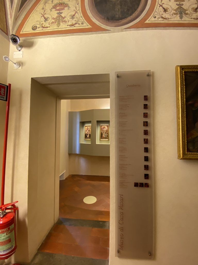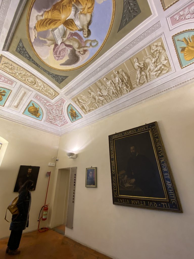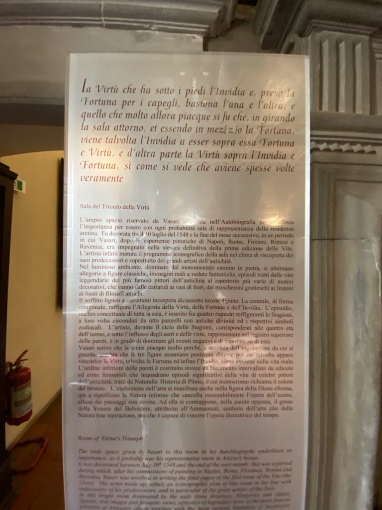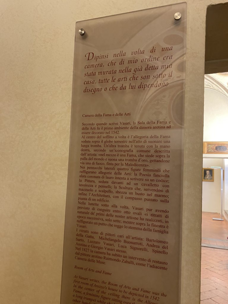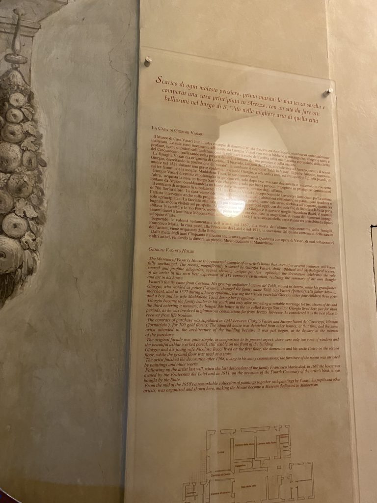 Nel borgo di San Vito la casa di Giorgio Vasari acquistata nel 1541, oggi sede museale dell’impronta visiva pittorica lasciata dall’artista. Costruita su tre piani la casa, organizzata per la servitù al primo e secondo piano. L’ultimo piano nobile la sua dimora privata. Intorno all’edificio un giardino all’italiana, rinascimentale, geometrico con siepi e una veduta sul borgo di Arezzo. Le decorazioni pittoriche della casa sono state realizzate da Vasari attento a celebrare e a evidenziare i simboli iconografici del proprio tempo con il contributo anche dei suoi amici aretini. Architetto, storico dell’arte e pittore, Giorgio Vasari affresca così le stanze a partire dal 1542. Il gusto manierista è visibile soprattutto nella quadreria con circa sessanta dipinti eseguiti da lui e dai suoi collaboratori. Al piano nobile, tramite una scalinata, con il busto di Vasari, si entra nella stanza del camino. L’artista affresca il luogo a partire dal 1548 con i temi: “Cacciata dell’Invidia” e della “Fortuna” da parte delle Virtù. La visione di questa pittura metafora della vita è nel soffitto a cassettone e nelle pareti appunto con figure allegoriche, paesaggi, storie eroiche dell’antichità, poi la “Cappellina” con la Madonna e Fra Paolino e il pavimento in maiolica del XVI secolo. Il tardo manierismo è presente nel corridoio con le sue visioni apocalittiche. La camera nuziale con il soffitto decorato da Vasari di Abramo tra le immagini del mondo, della “Pace”, la “Concordia”, le “Virtù” e la “Modestia”. La “Camera di Apollo” fu affrescata dall’artista è rappresenta Apollo e le nove muse con l’allegoria dell’amore, il ritratto della moglie Nicolosa Bacci. Nella camera della “Fama”, Vasari dipinse nel soffitto appunto il suo intendimento sulla “Fama” e nei peducci e lunette le quattro arti, il suo ritratto e degli artisti aretini: Signorelli, Della Gatta, Spinello, Aretino con Michelangelo e Andrea del Sarto. I contenuti allegorici e pittorici, la consistente visione continua e avvolgente della cosmologia dei miti antichi attualizzati, la narrazione insita dell’affresco, la visione manierista di un mondo bucolico e possibile per averlo vicino e condividerlo, fanno di Vasari un attento studioso e documentarista che attinge le sue conoscenze ai testi antichi per realizzare uno scenario così inedito e dettagliato nelle ragioni che afferma, esclusivo di una pittura commemorative e manierista che non ha eguali. Pitture murali sulle volte e sulle pareti, dipinti su tavola che Vasari realizza a più riprese nella sua abitazione decorata che vivacizza il suo pensiero e lo tiene costantemente aperto alla bellezza e al sogno dell’arte senza barriere.