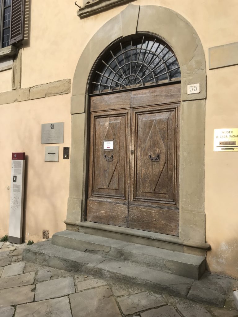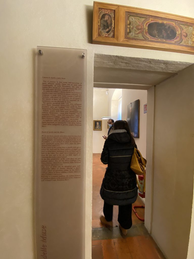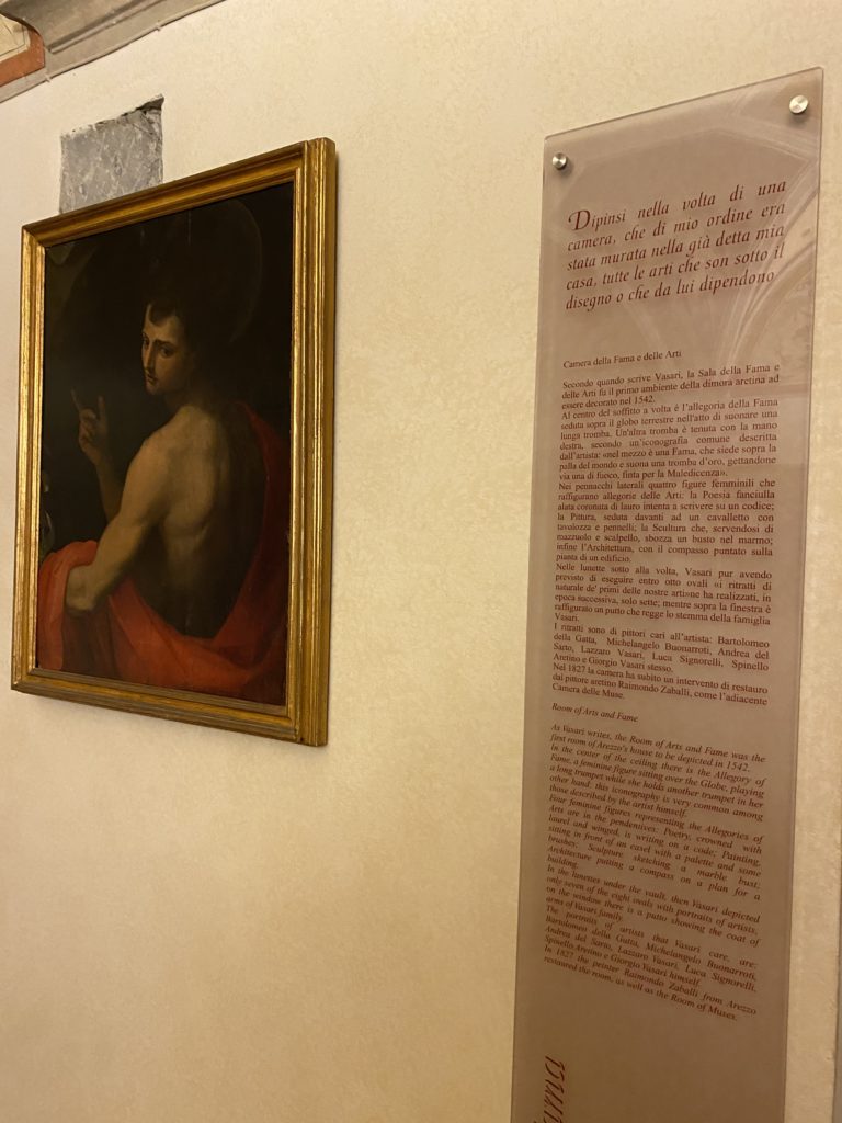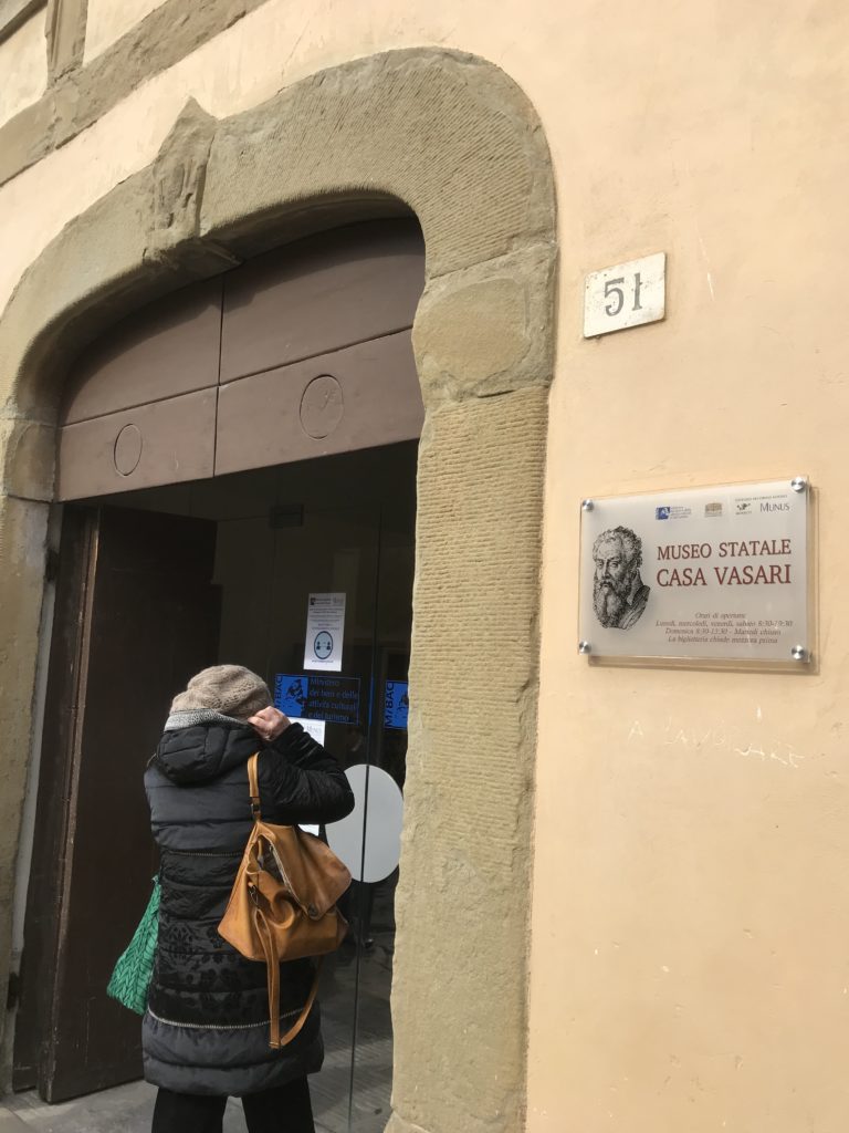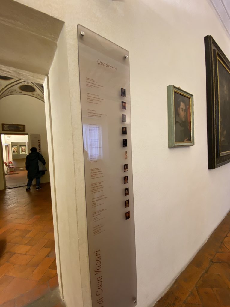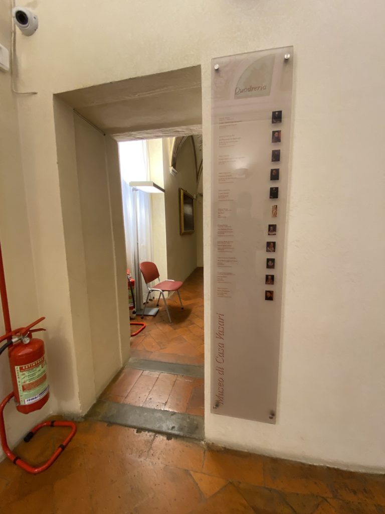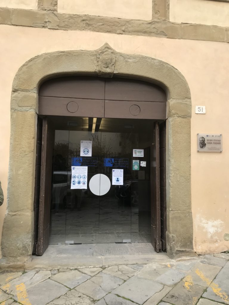 Nel borgo di San Vito la casa di Giorgio Vasari acquistata nel 1541, oggi sede museale dell’impronta visiva pittorica lasciata dall’artista. Costruita su tre piani la casa, organizzata per la servitù al primo e secondo piano. L’ultimo piano nobile la sua dimora privata. Intorno all’edificio un giardino all’italiana, rinascimentale, geometrico con siepi e una veduta sul borgo di Arezzo. Le decorazioni pittoriche della casa sono state realizzate da Vasari attento a celebrare e a evidenziare i simboli iconografici del proprio tempo con il contributo anche dei suoi amici aretini. Architetto, storico dell’arte e pittore, Giorgio Vasari affresca così le stanze a partire dal 1542. Il gusto manierista è visibile soprattutto nella quadreria con circa sessanta dipinti eseguiti da lui e dai suoi collaboratori. Al piano nobile, tramite una scalinata, con il busto di Vasari, si entra nella stanza del camino. L’artista affresca il luogo a partire dal 1548 con i temi: “Cacciata dell’Invidia” e della “Fortuna” da parte delle Virtù. La visione di questa pittura metafora della vita è nel soffitto a cassettone e nelle pareti appunto con figure allegoriche, paesaggi, storie eroiche dell’antichità, poi la “Cappellina” con la Madonna e Fra Paolino e il pavimento in maiolica del XVI secolo. Il tardo manierismo è presente nel corridoio con le sue visioni apocalittiche. La camera nuziale con il soffitto decorato da Vasari di Abramo tra le immagini del mondo, della “Pace”, la “Concordia”, le “Virtù” e la “Modestia”. La “Camera di Apollo” fu affrescata dall’artista è rappresenta Apollo e le nove muse con l’allegoria dell’amore, il ritratto della moglie Nicolosa Bacci. Nella camera della “Fama”, Vasari dipinse nel soffitto appunto il suo intendimento sulla “Fama” e nei peducci e lunette le quattro arti, il suo ritratto e degli artisti aretini: Signorelli, Della Gatta, Spinello, Aretino con Michelangelo e Andrea del Sarto. I contenuti allegorici e pittorici, la consistente visione continua e avvolgente della cosmologia dei miti antichi attualizzati, la narrazione insita dell’affresco, la visione manierista di un mondo bucolico e possibile per averlo vicino e condividerlo, fanno di Vasari un attento studioso e documentarista che attinge le sue conoscenze ai testi antichi per realizzare uno scenario così inedito e dettagliato nelle ragioni che afferma, esclusivo di una pittura commemorative e manierista che non ha eguali. Pitture murali sulle volte e sulle pareti, dipinti su tavola che Vasari realizza a più riprese nella sua abitazione decorata che vivacizza il suo pensiero e lo tiene costantemente aperto alla bellezza e al sogno dell’arte senza barriere.