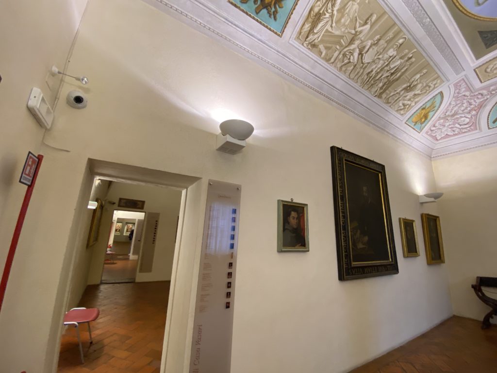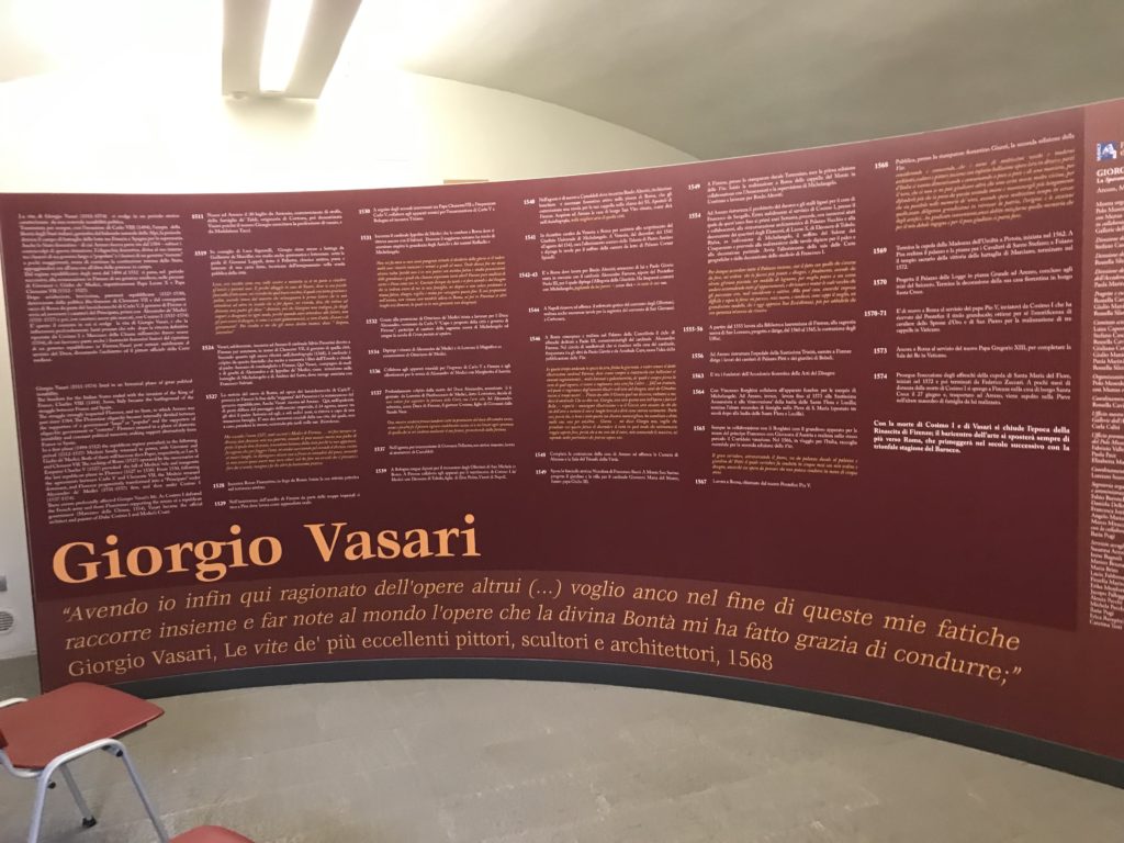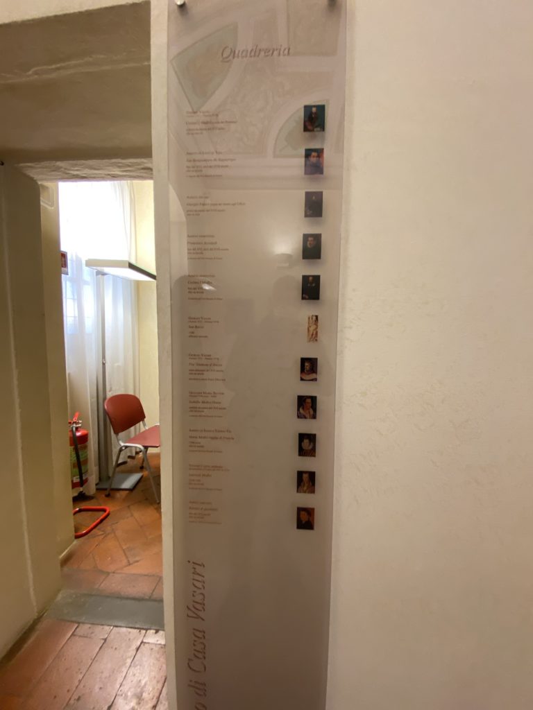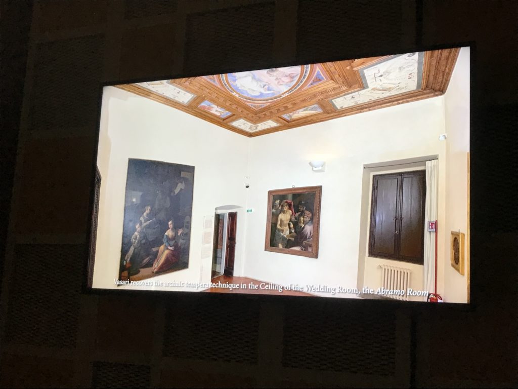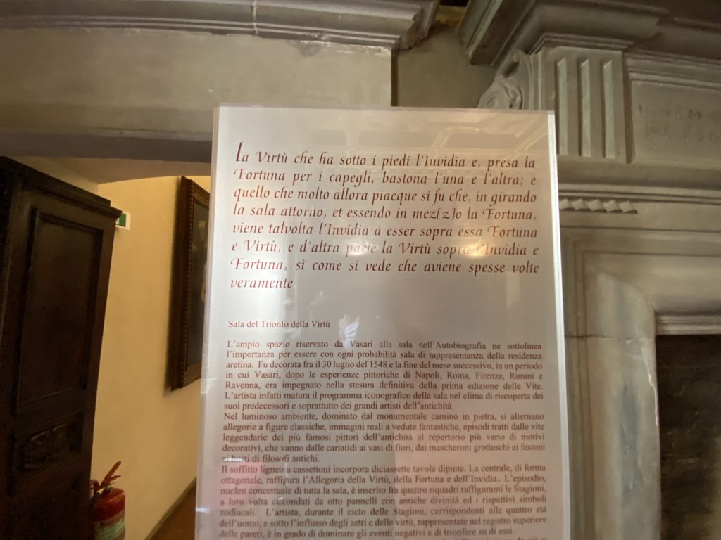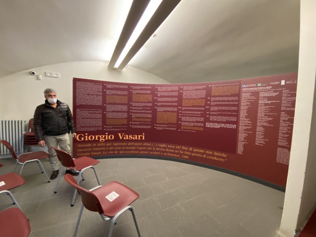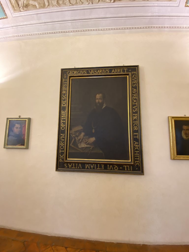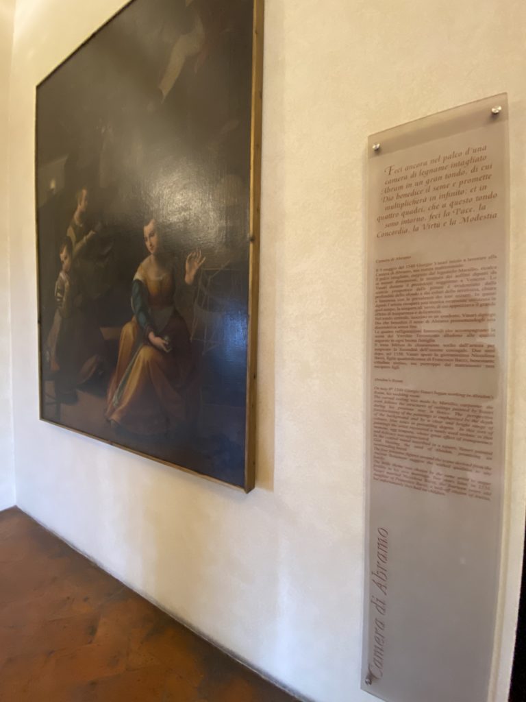 Nel borgo di San Vito la casa di Giorgio Vasari acquistata nel 1541, oggi sede museale dell’impronta visiva pittorica lasciata dall’artista. Costruita su tre piani la casa, organizzata per la servitù al primo e secondo piano. L’ultimo piano nobile la sua dimora privata. Intorno all’edificio un giardino all’italiana, rinascimentale, geometrico con siepi e una veduta sul borgo di Arezzo. Le decorazioni pittoriche della casa sono state realizzate da Vasari attento a celebrare e a evidenziare i simboli iconografici del proprio tempo con il contributo anche dei suoi amici aretini. Architetto, storico dell’arte e pittore, Giorgio Vasari affresca così le stanze a partire dal 1542. Il gusto manierista è visibile soprattutto nella quadreria con circa sessanta dipinti eseguiti da lui e dai suoi collaboratori. Al piano nobile, tramite una scalinata, con il busto di Vasari, si entra nella stanza del camino. L’artista affresca il luogo a partire dal 1548 con i temi: “Cacciata dell’Invidia” e della “Fortuna” da parte delle Virtù. La visione di questa pittura metafora della vita è nel soffitto a cassettone e nelle pareti appunto con figure allegoriche, paesaggi, storie eroiche dell’antichità, poi la “Cappellina” con la Madonna e Fra Paolino e il pavimento in maiolica del XVI secolo. Il tardo manierismo è presente nel corridoio con le sue visioni apocalittiche. La camera nuziale con il soffitto decorato da Vasari di Abramo tra le immagini del mondo, della “Pace”, la “Concordia”, le “Virtù” e la “Modestia”. La “Camera di Apollo” fu affrescata dall’artista è rappresenta Apollo e le nove muse con l’allegoria dell’amore, il ritratto della moglie Nicolosa Bacci. Nella camera della “Fama”, Vasari dipinse nel soffitto appunto il suo intendimento sulla “Fama” e nei peducci e lunette le quattro arti, il suo ritratto e degli artisti aretini: Signorelli, Della Gatta, Spinello, Aretino con Michelangelo e Andrea del Sarto. I contenuti allegorici e pittorici, la consistente visione continua e avvolgente della cosmologia dei miti antichi attualizzati, la narrazione insita dell’affresco, la visione manierista di un mondo bucolico e possibile per averlo vicino e condividerlo, fanno di Vasari un attento studioso e documentarista che attinge le sue conoscenze ai testi antichi per realizzare uno scenario così inedito e dettagliato nelle ragioni che afferma, esclusivo di una pittura commemorative e manierista che non ha eguali. Pitture murali sulle volte e sulle pareti, dipinti su tavola che Vasari realizza a più riprese nella sua abitazione decorata che vivacizza il suo pensiero e lo tiene costantemente aperto alla bellezza e al sogno dell’arte senza barriere.
