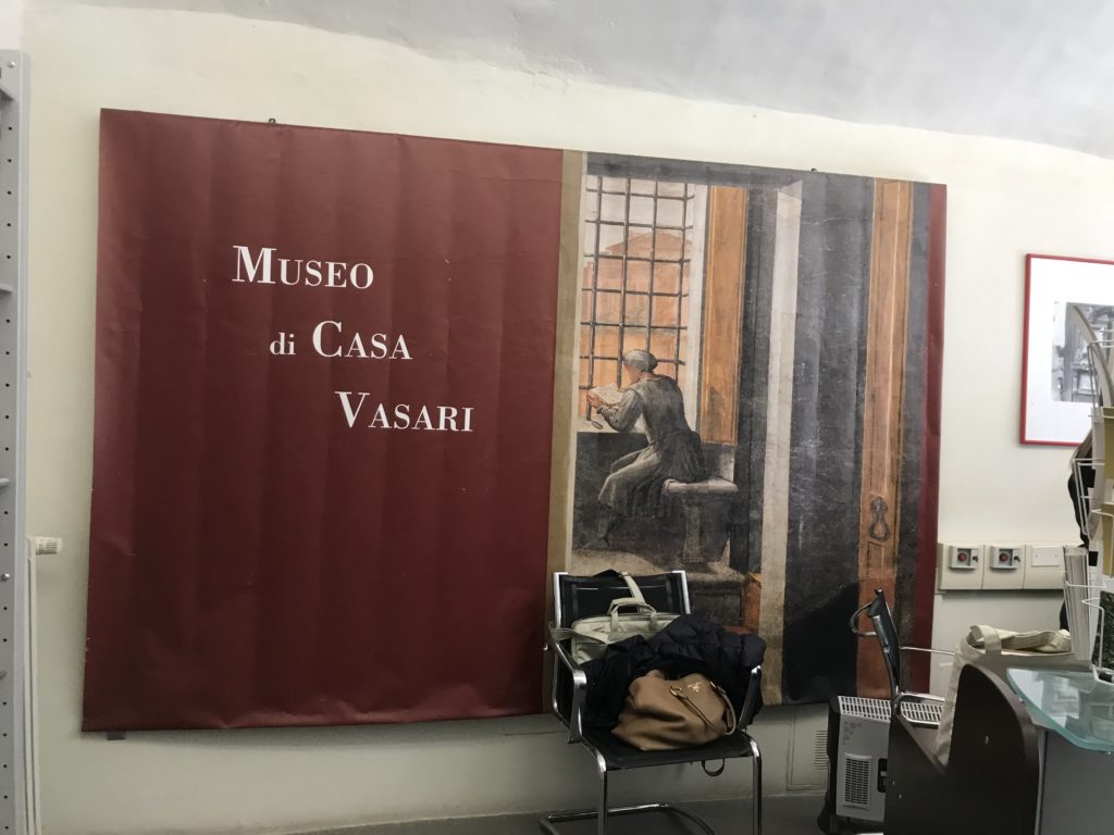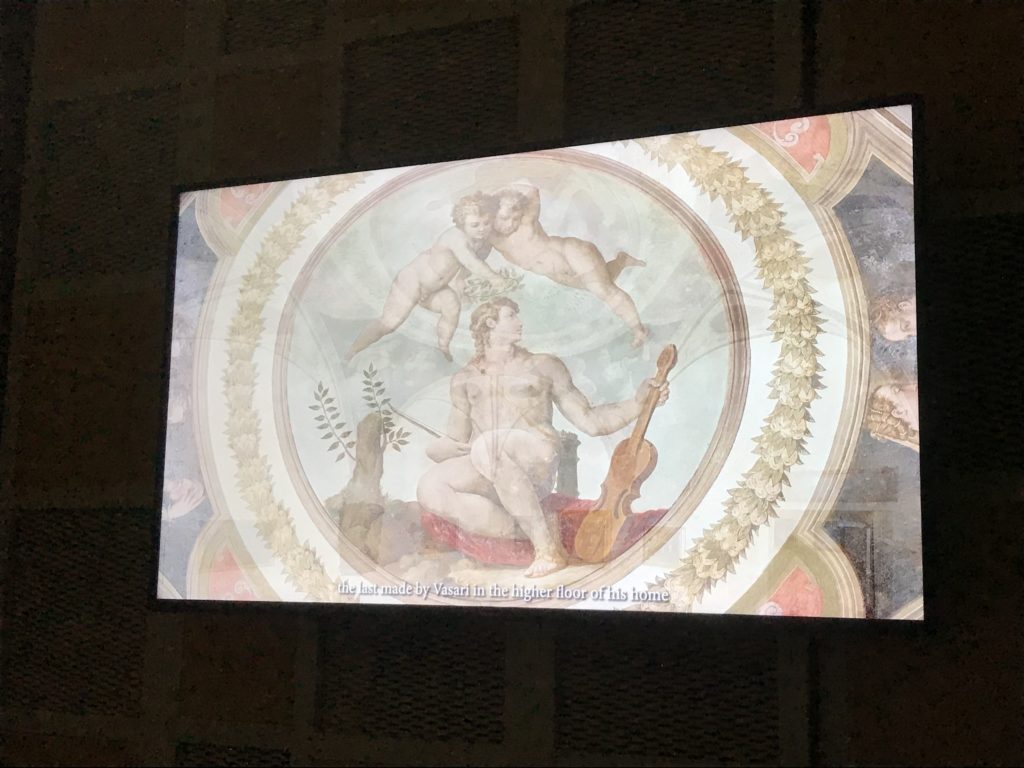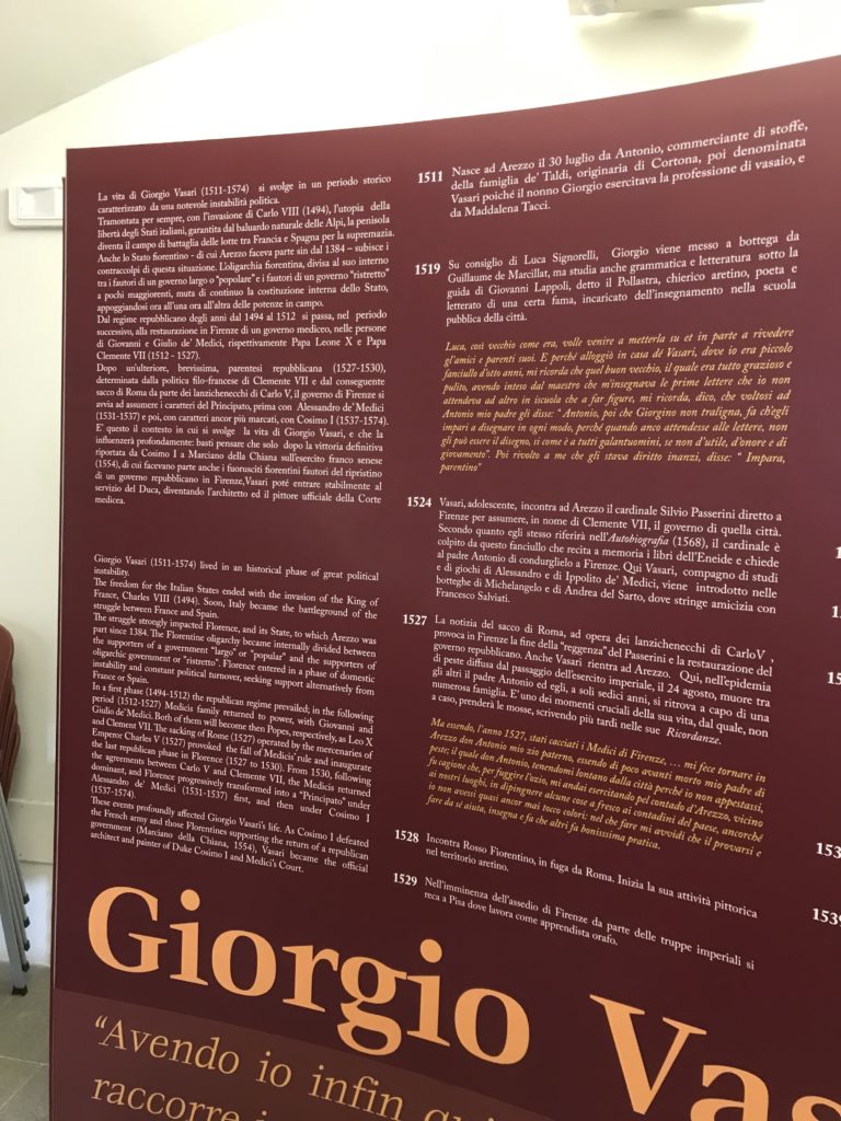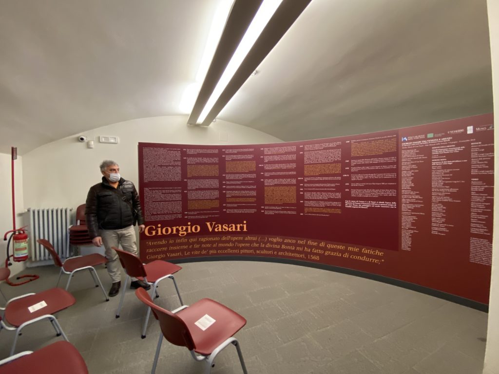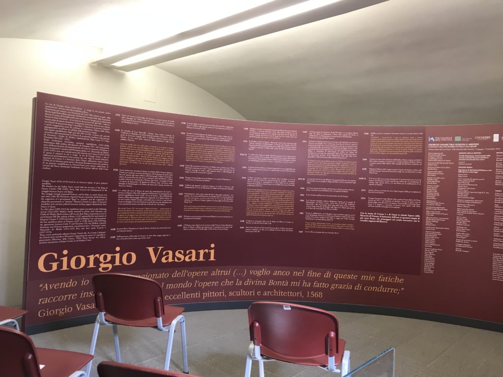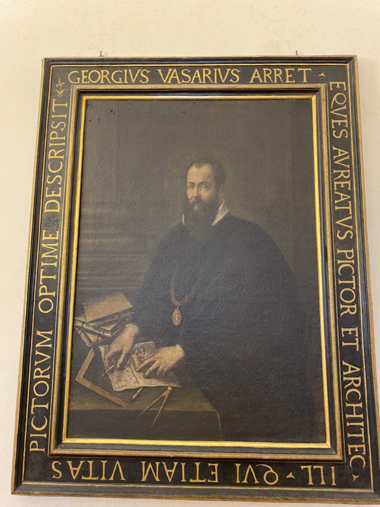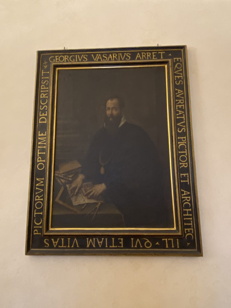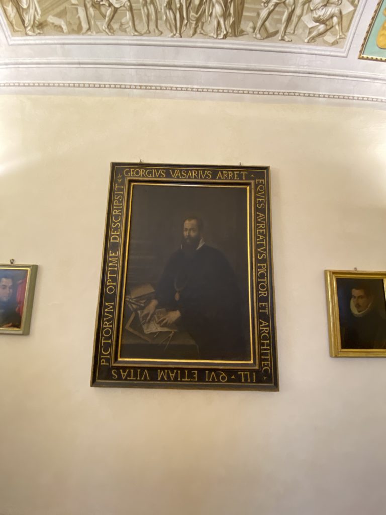 Nel borgo di San Vito la casa di Giorgio Vasari acquistata nel 1541, oggi sede museale dell’impronta visiva pittorica lasciata dall’artista. Costruita su tre piani la casa, organizzata per la servitù al primo e secondo piano. L’ultimo piano nobile la sua dimora privata. Intorno all’edificio un giardino all’italiana, rinascimentale, geometrico con siepi e una veduta sul borgo di Arezzo. Le decorazioni pittoriche della casa sono state realizzate da Vasari attento a celebrare e a evidenziare i simboli iconografici del proprio tempo con il contributo anche dei suoi amici aretini. Architetto, storico dell’arte e pittore, Giorgio Vasari affresca così le stanze a partire dal 1542. Il gusto manierista è visibile soprattutto nella quadreria con circa sessanta dipinti eseguiti da lui e dai suoi collaboratori. Al piano nobile, tramite una scalinata, con il busto di Vasari, si entra nella stanza del camino. L’artista affresca il luogo a partire dal 1548 con i temi: “Cacciata dell’Invidia” e della “Fortuna” da parte delle Virtù. La visione di questa pittura metafora della vita è nel soffitto a cassettone e nelle pareti appunto con figure allegoriche, paesaggi, storie eroiche dell’antichità, poi la “Cappellina” con la Madonna e Fra Paolino e il pavimento in maiolica del XVI secolo. Il tardo manierismo è presente nel corridoio con le sue visioni apocalittiche. La camera nuziale con il soffitto decorato da Vasari di Abramo tra le immagini del mondo, della “Pace”, la “Concordia”, le “Virtù” e la “Modestia”. La “Camera di Apollo” fu affrescata dall’artista è rappresenta Apollo e le nove muse con l’allegoria dell’amore, il ritratto della moglie Nicolosa Bacci. Nella camera della “Fama”, Vasari dipinse nel soffitto appunto il suo intendimento sulla “Fama” e nei peducci e lunette le quattro arti, il suo ritratto e degli artisti aretini: Signorelli, Della Gatta, Spinello, Aretino con Michelangelo e Andrea del Sarto. I contenuti allegorici e pittorici, la consistente visione continua e avvolgente della cosmologia dei miti antichi attualizzati, la narrazione insita dell’affresco, la visione manierista di un mondo bucolico e possibile per averlo vicino e condividerlo, fanno di Vasari un attento studioso e documentarista che attinge le sue conoscenze ai testi antichi per realizzare uno scenario così inedito e dettagliato nelle ragioni che afferma, esclusivo di una pittura commemorative e manierista che non ha eguali. Pitture murali sulle volte e sulle pareti, dipinti su tavola che Vasari realizza a più riprese nella sua abitazione decorata che vivacizza il suo pensiero e lo tiene costantemente aperto alla bellezza e al sogno dell’arte senza barriere.
