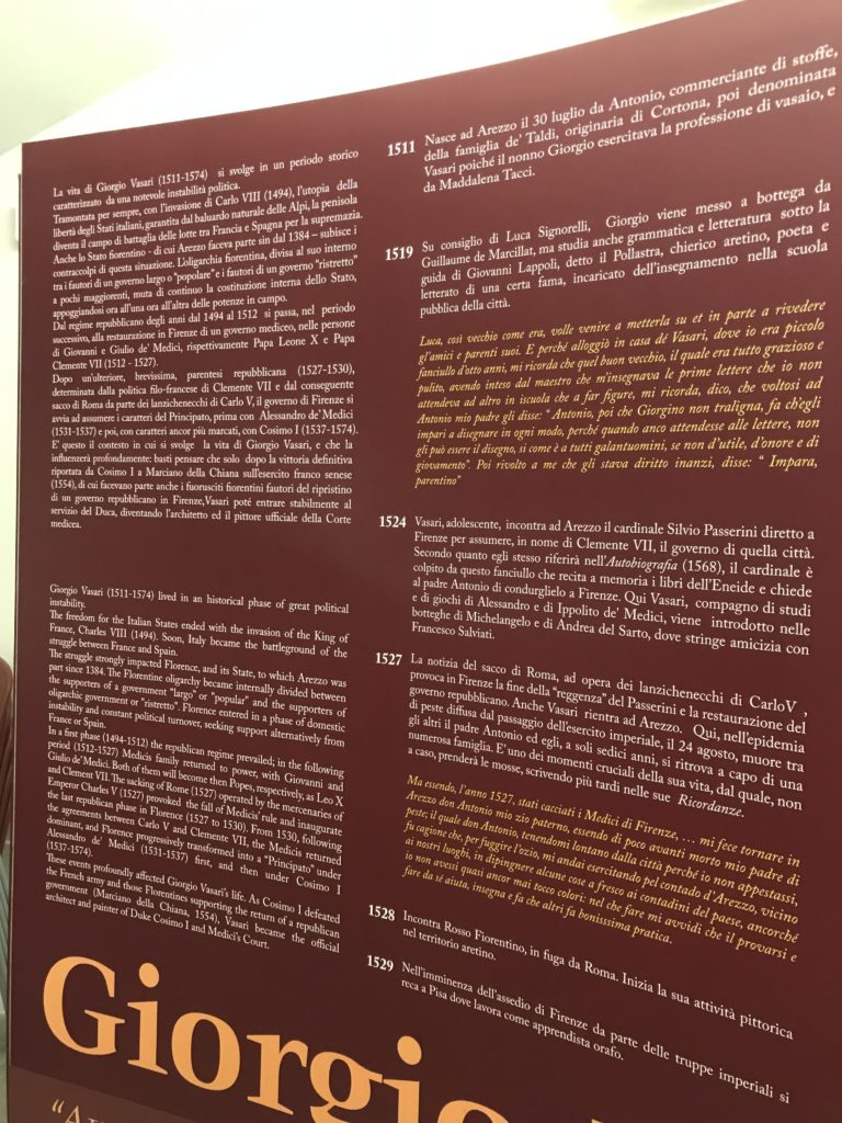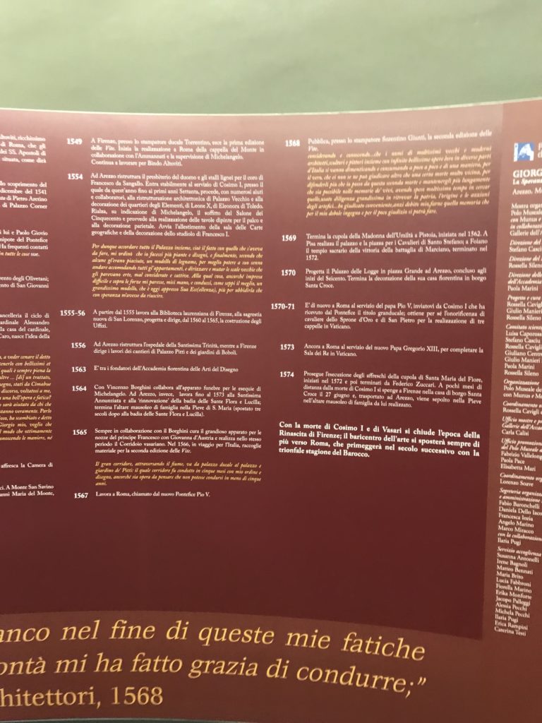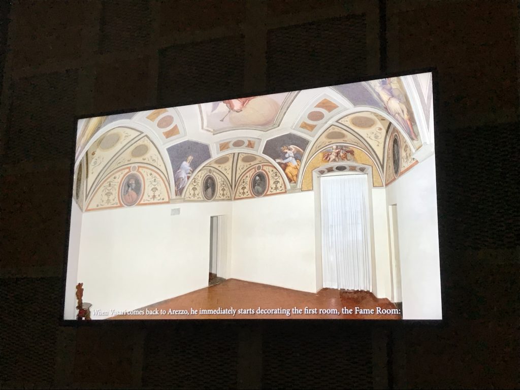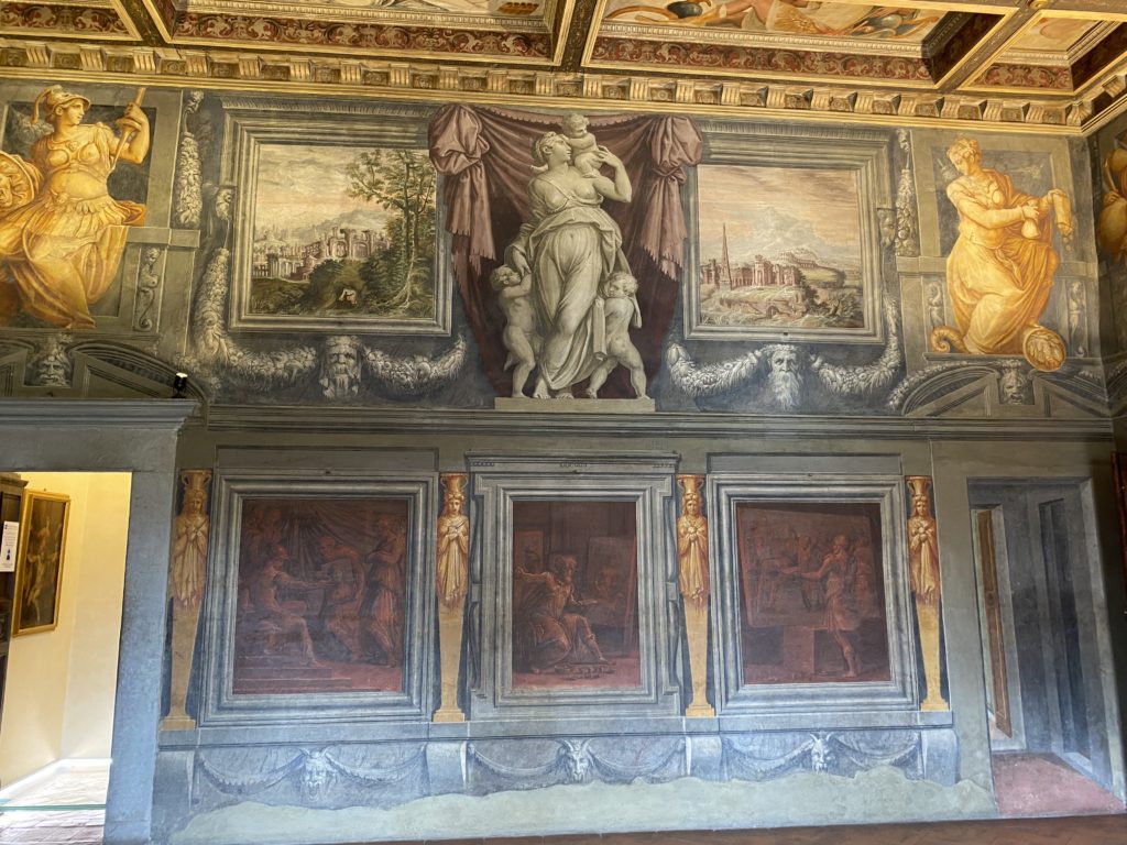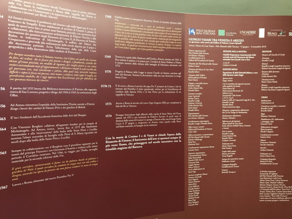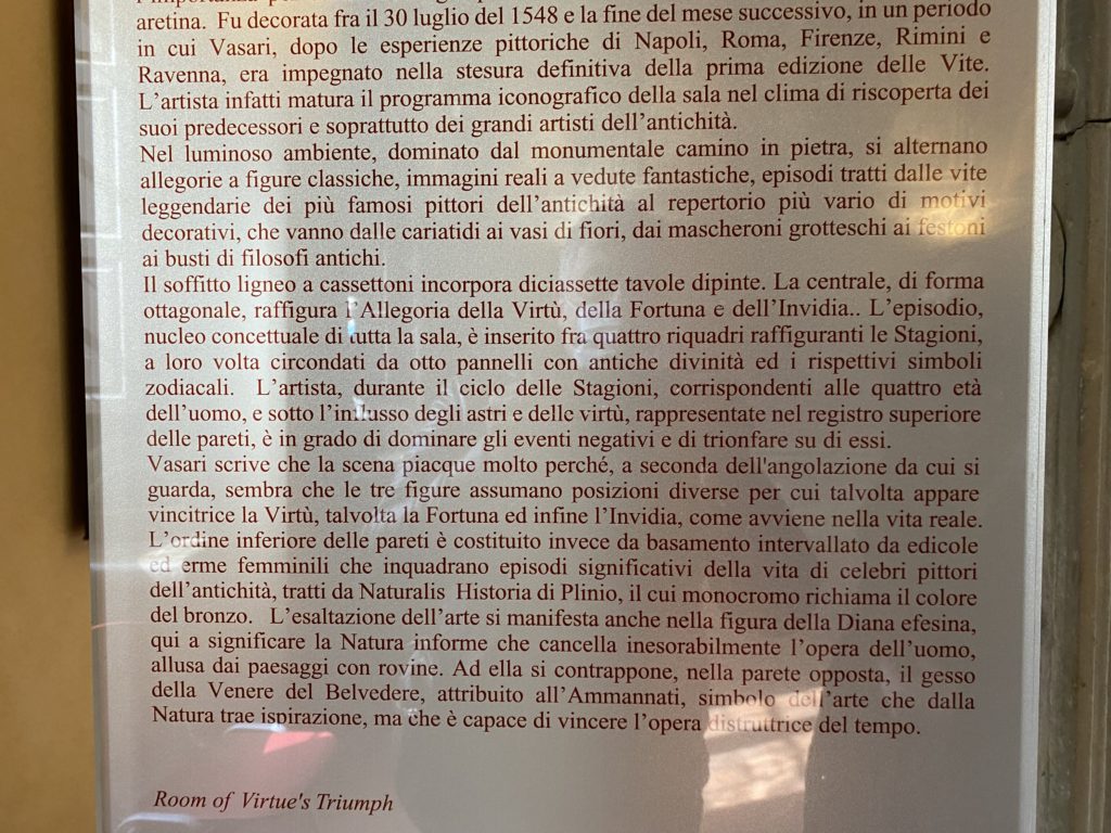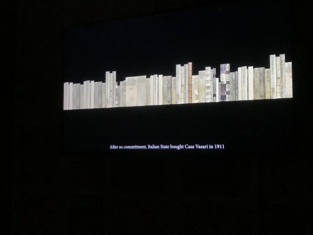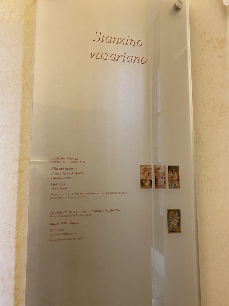 Nel borgo di San Vito la casa di Giorgio Vasari acquistata nel 1541, oggi sede museale dell’impronta visiva pittorica lasciata dall’artista. Costruita su tre piani la casa, organizzata per la servitù al primo e secondo piano. L’ultimo piano nobile la sua dimora privata. Intorno all’edificio un giardino all’italiana, rinascimentale, geometrico con siepi e una veduta sul borgo di Arezzo. Le decorazioni pittoriche della casa sono state realizzate da Vasari attento a celebrare e a evidenziare i simboli iconografici del proprio tempo con il contributo anche dei suoi amici aretini. Architetto, storico dell’arte e pittore, Giorgio Vasari affresca così le stanze a partire dal 1542. Il gusto manierista è visibile soprattutto nella quadreria con circa sessanta dipinti eseguiti da lui e dai suoi collaboratori. Al piano nobile, tramite una scalinata, con il busto di Vasari, si entra nella stanza del camino. L’artista affresca il luogo a partire dal 1548 con i temi: “Cacciata dell’Invidia” e della “Fortuna” da parte delle Virtù. La visione di questa pittura metafora della vita è nel soffitto a cassettone e nelle pareti appunto con figure allegoriche, paesaggi, storie eroiche dell’antichità, poi la “Cappellina” con la Madonna e Fra Paolino e il pavimento in maiolica del XVI secolo. Il tardo manierismo è presente nel corridoio con le sue visioni apocalittiche. La camera nuziale con il soffitto decorato da Vasari di Abramo tra le immagini del mondo, della “Pace”, la “Concordia”, le “Virtù” e la “Modestia”. La “Camera di Apollo” fu affrescata dall’artista è rappresenta Apollo e le nove muse con l’allegoria dell’amore, il ritratto della moglie Nicolosa Bacci. Nella camera della “Fama”, Vasari dipinse nel soffitto appunto il suo intendimento sulla “Fama” e nei peducci e lunette le quattro arti, il suo ritratto e degli artisti aretini: Signorelli, Della Gatta, Spinello, Aretino con Michelangelo e Andrea del Sarto. I contenuti allegorici e pittorici, la consistente visione continua e avvolgente della cosmologia dei miti antichi attualizzati, la narrazione insita dell’affresco, la visione manierista di un mondo bucolico e possibile per averlo vicino e condividerlo, fanno di Vasari un attento studioso e documentarista che attinge le sue conoscenze ai testi antichi per realizzare uno scenario così inedito e dettagliato nelle ragioni che afferma, esclusivo di una pittura commemorative e manierista che non ha eguali. Pitture murali sulle volte e sulle pareti, dipinti su tavola che Vasari realizza a più riprese nella sua abitazione decorata che vivacizza il suo pensiero e lo tiene costantemente aperto alla bellezza e al sogno dell’arte senza barriere.