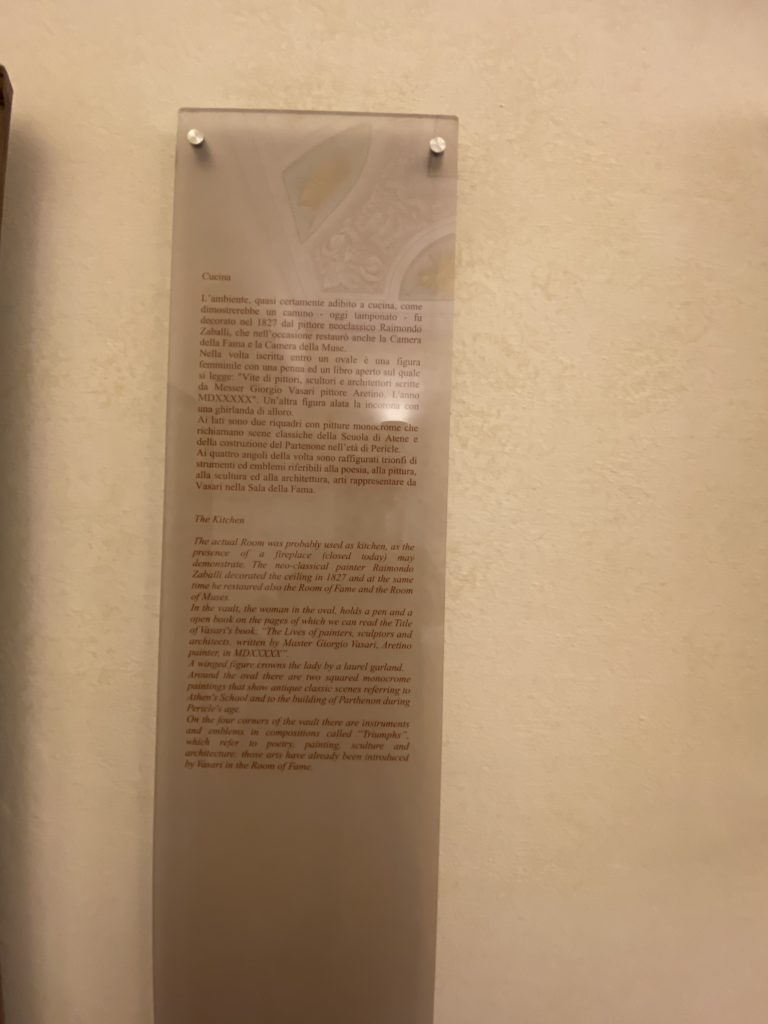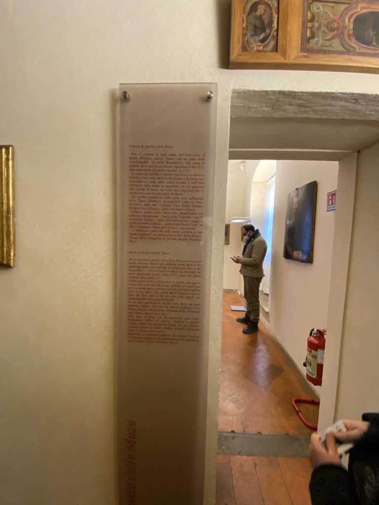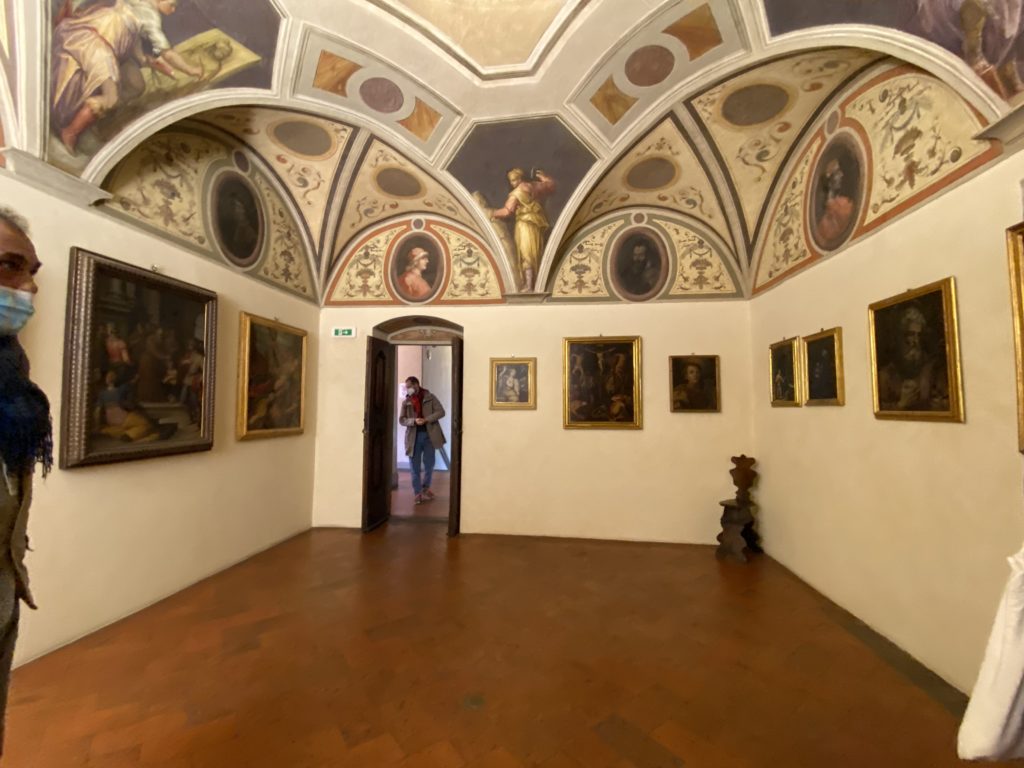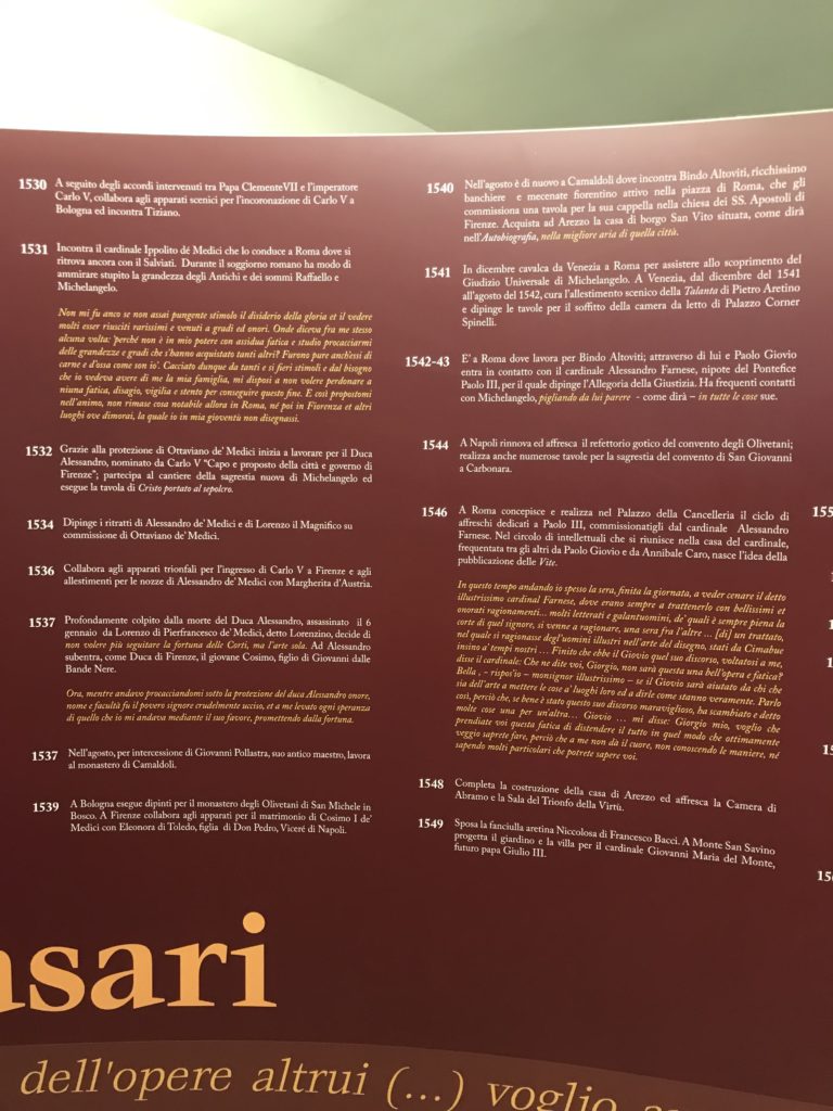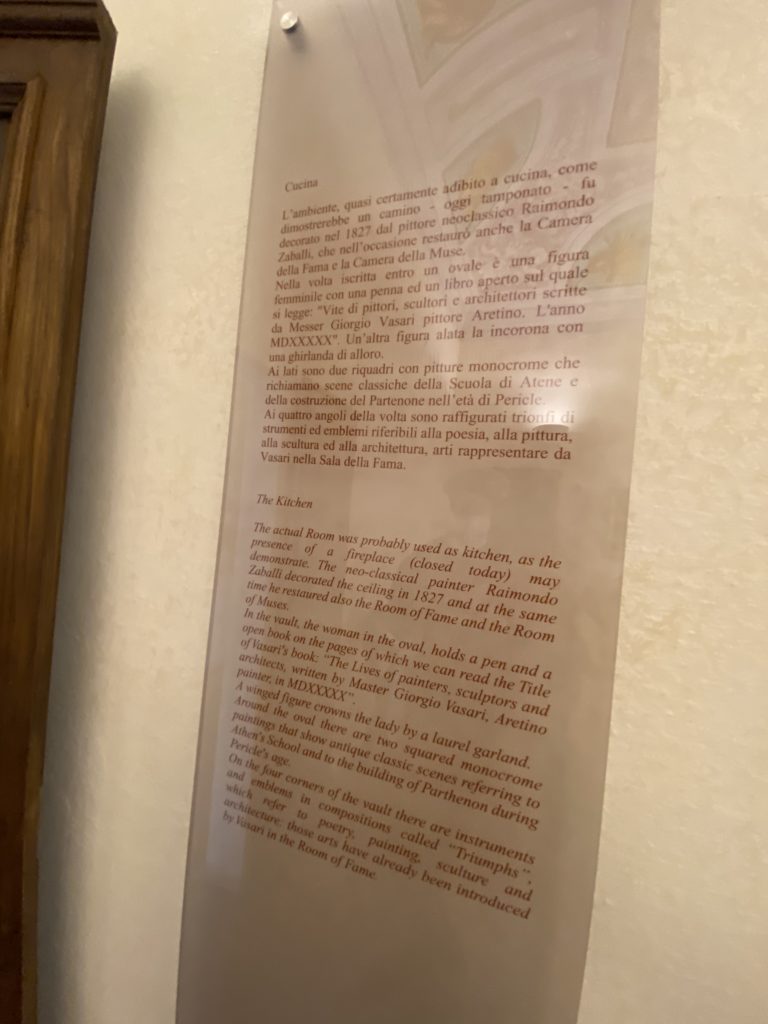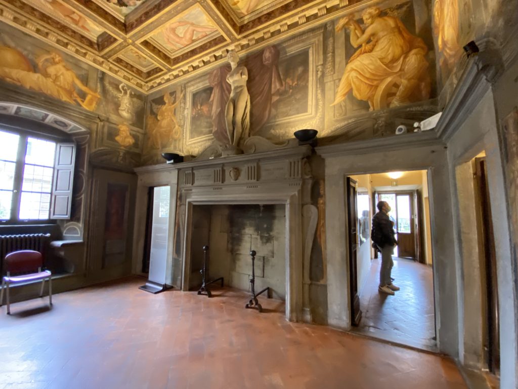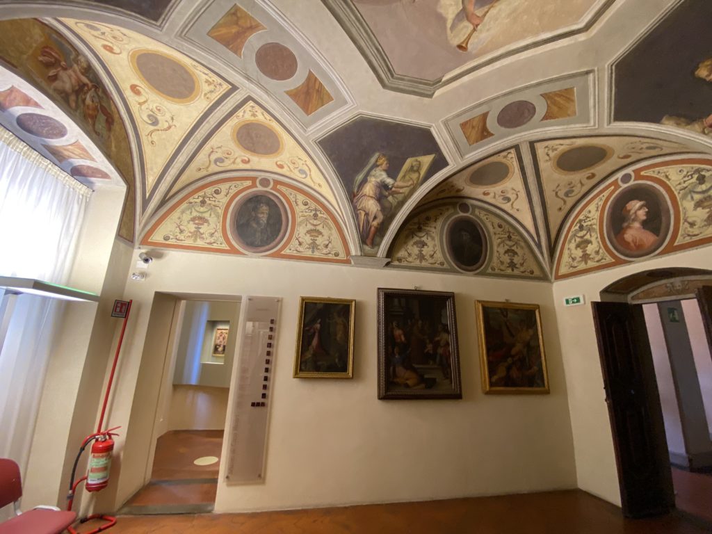 Nel borgo di San Vito la casa di Giorgio Vasari acquistata nel 1541, oggi sede museale dell’impronta visiva pittorica lasciata dall’artista. Costruita su tre piani la casa, organizzata per la servitù al primo e secondo piano. L’ultimo piano nobile la sua dimora privata. Intorno all’edificio un giardino all’italiana, rinascimentale, geometrico con siepi e una veduta sul borgo di Arezzo. Le decorazioni pittoriche della casa sono state realizzate da Vasari attento a celebrare e a evidenziare i simboli iconografici del proprio tempo con il contributo anche dei suoi amici aretini. Architetto, storico dell’arte e pittore, Giorgio Vasari affresca così le stanze a partire dal 1542. Il gusto manierista è visibile soprattutto nella quadreria con circa sessanta dipinti eseguiti da lui e dai suoi collaboratori. Al piano nobile, tramite una scalinata, con il busto di Vasari, si entra nella stanza del camino. L’artista affresca il luogo a partire dal 1548 con i temi: “Cacciata dell’Invidia” e della “Fortuna” da parte delle Virtù. La visione di questa pittura metafora della vita è nel soffitto a cassettone e nelle pareti appunto con figure allegoriche, paesaggi, storie eroiche dell’antichità, poi la “Cappellina” con la Madonna e Fra Paolino e il pavimento in maiolica del XVI secolo. Il tardo manierismo è presente nel corridoio con le sue visioni apocalittiche. La camera nuziale con il soffitto decorato da Vasari di Abramo tra le immagini del mondo, della “Pace”, la “Concordia”, le “Virtù” e la “Modestia”. La “Camera di Apollo” fu affrescata dall’artista è rappresenta Apollo e le nove muse con l’allegoria dell’amore, il ritratto della moglie Nicolosa Bacci. Nella camera della “Fama”, Vasari dipinse nel soffitto appunto il suo intendimento sulla “Fama” e nei peducci e lunette le quattro arti, il suo ritratto e degli artisti aretini: Signorelli, Della Gatta, Spinello, Aretino con Michelangelo e Andrea del Sarto. I contenuti allegorici e pittorici, la consistente visione continua e avvolgente della cosmologia dei miti antichi attualizzati, la narrazione insita dell’affresco, la visione manierista di un mondo bucolico e possibile per averlo vicino e condividerlo, fanno di Vasari un attento studioso e documentarista che attinge le sue conoscenze ai testi antichi per realizzare uno scenario così inedito e dettagliato nelle ragioni che afferma, esclusivo di una pittura commemorative e manierista che non ha eguali. Pitture murali sulle volte e sulle pareti, dipinti su tavola che Vasari realizza a più riprese nella sua abitazione decorata che vivacizza il suo pensiero e lo tiene costantemente aperto alla bellezza e al sogno dell’arte senza barriere.