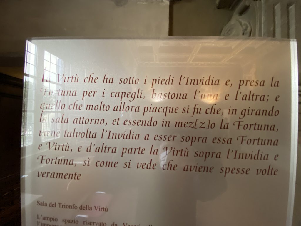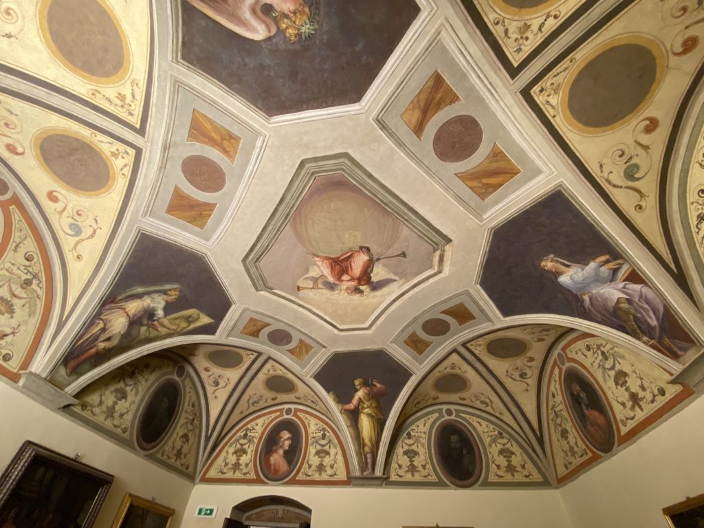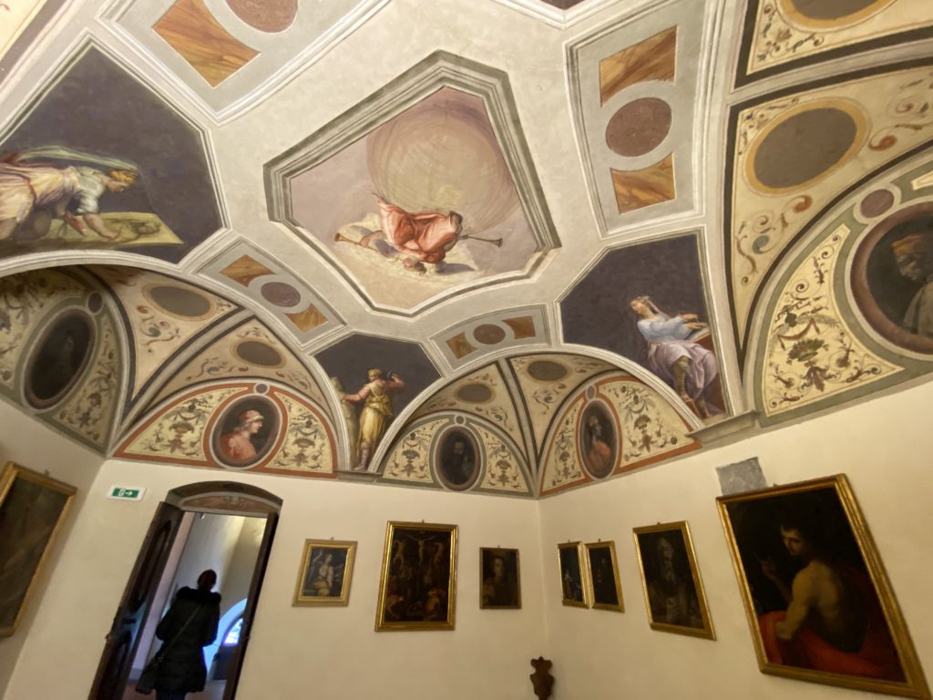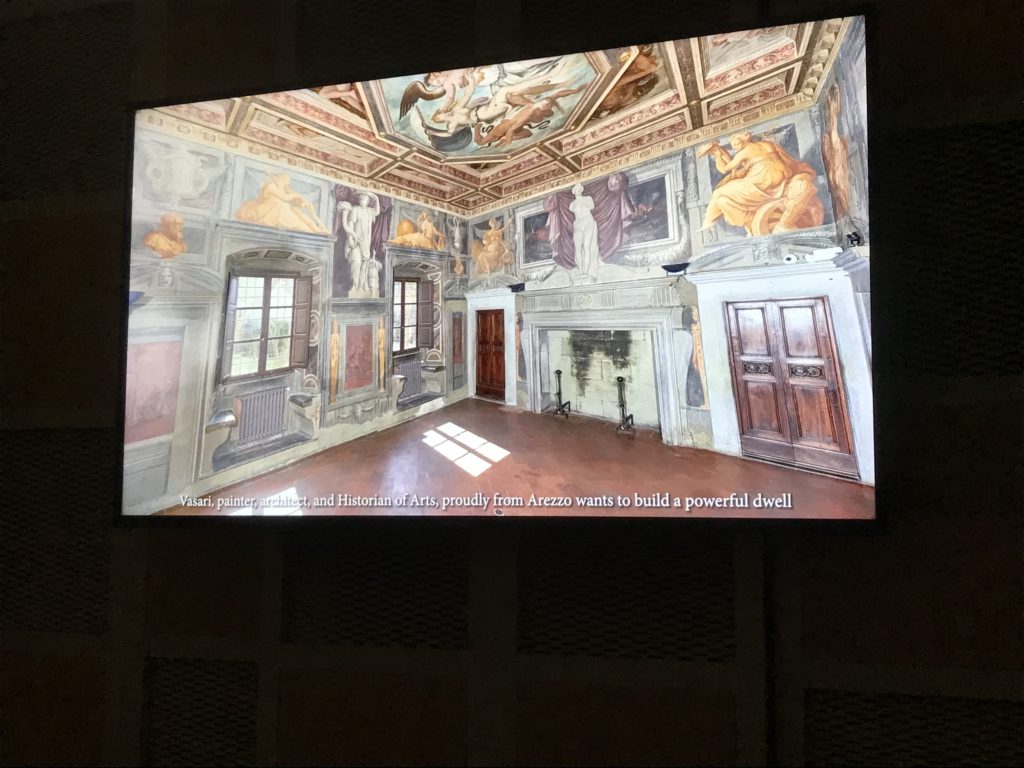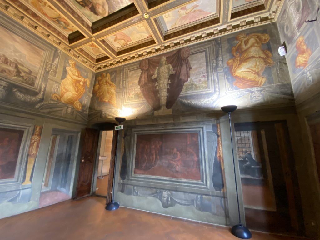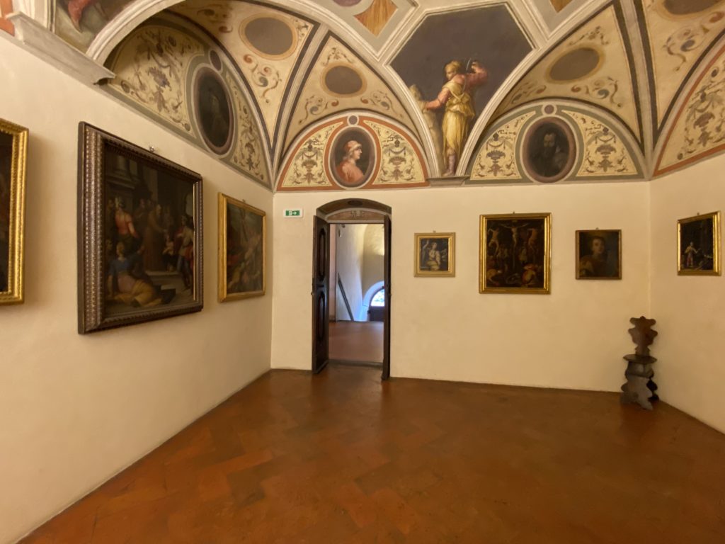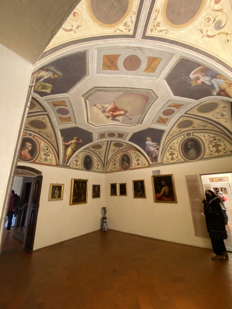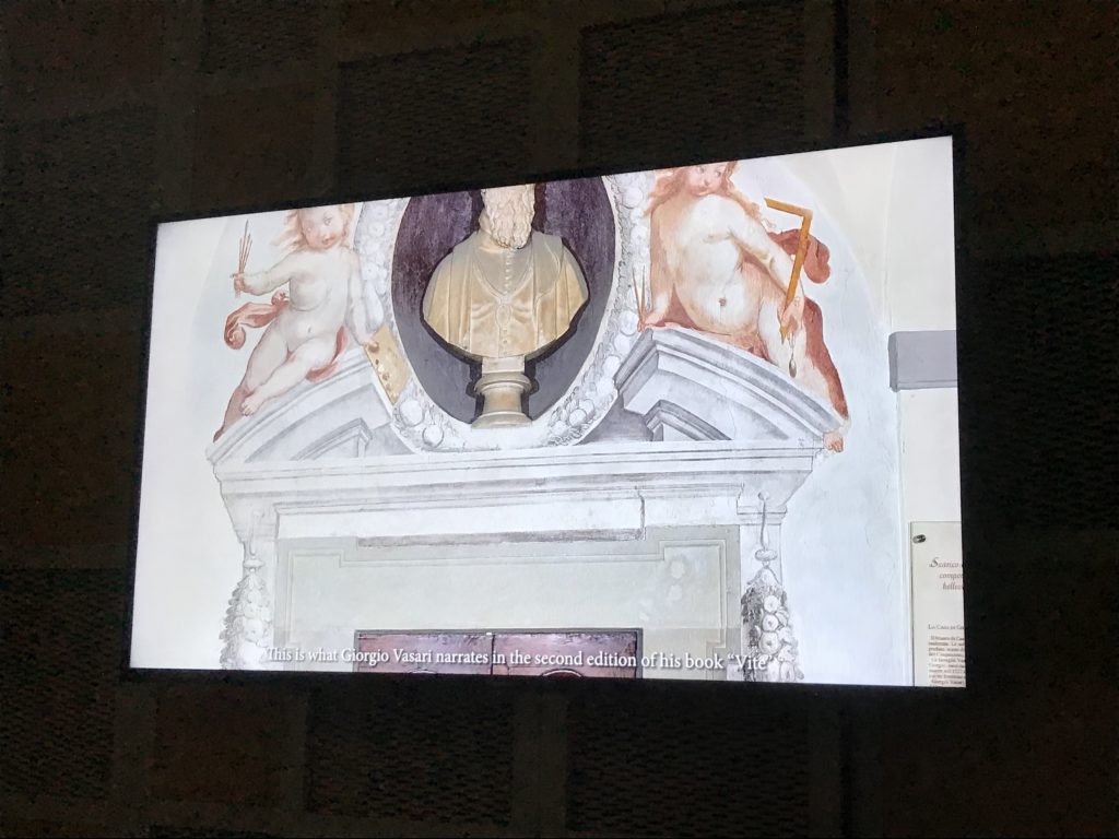 Nel borgo di San Vito la casa di Giorgio Vasari acquistata nel 1541, oggi sede museale dell’impronta visiva pittorica lasciata dall’artista. Costruita su tre piani la casa, organizzata per la servitù al primo e secondo piano. L’ultimo piano nobile la sua dimora privata. Intorno all’edificio un giardino all’italiana, rinascimentale, geometrico con siepi e una veduta sul borgo di Arezzo. Le decorazioni pittoriche della casa sono state realizzate da Vasari attento a celebrare e a evidenziare i simboli iconografici del proprio tempo con il contributo anche dei suoi amici aretini. Architetto, storico dell’arte e pittore, Giorgio Vasari affresca così le stanze a partire dal 1542. Il gusto manierista è visibile soprattutto nella quadreria con circa sessanta dipinti eseguiti da lui e dai suoi collaboratori. Al piano nobile, tramite una scalinata, con il busto di Vasari, si entra nella stanza del camino. L’artista affresca il luogo a partire dal 1548 con i temi: “Cacciata dell’Invidia” e della “Fortuna” da parte delle Virtù. La visione di questa pittura metafora della vita è nel soffitto a cassettone e nelle pareti appunto con figure allegoriche, paesaggi, storie eroiche dell’antichità, poi la “Cappellina” con la Madonna e Fra Paolino e il pavimento in maiolica del XVI secolo. Il tardo manierismo è presente nel corridoio con le sue visioni apocalittiche. La camera nuziale con il soffitto decorato da Vasari di Abramo tra le immagini del mondo, della “Pace”, la “Concordia”, le “Virtù” e la “Modestia”. La “Camera di Apollo” fu affrescata dall’artista è rappresenta Apollo e le nove muse con l’allegoria dell’amore, il ritratto della moglie Nicolosa Bacci. Nella camera della “Fama”, Vasari dipinse nel soffitto appunto il suo intendimento sulla “Fama” e nei peducci e lunette le quattro arti, il suo ritratto e degli artisti aretini: Signorelli, Della Gatta, Spinello, Aretino con Michelangelo e Andrea del Sarto. I contenuti allegorici e pittorici, la consistente visione continua e avvolgente della cosmologia dei miti antichi attualizzati, la narrazione insita dell’affresco, la visione manierista di un mondo bucolico e possibile per averlo vicino e condividerlo, fanno di Vasari un attento studioso e documentarista che attinge le sue conoscenze ai testi antichi per realizzare uno scenario così inedito e dettagliato nelle ragioni che afferma, esclusivo di una pittura commemorative e manierista che non ha eguali. Pitture murali sulle volte e sulle pareti, dipinti su tavola che Vasari realizza a più riprese nella sua abitazione decorata che vivacizza il suo pensiero e lo tiene costantemente aperto alla bellezza e al sogno dell’arte senza barriere.