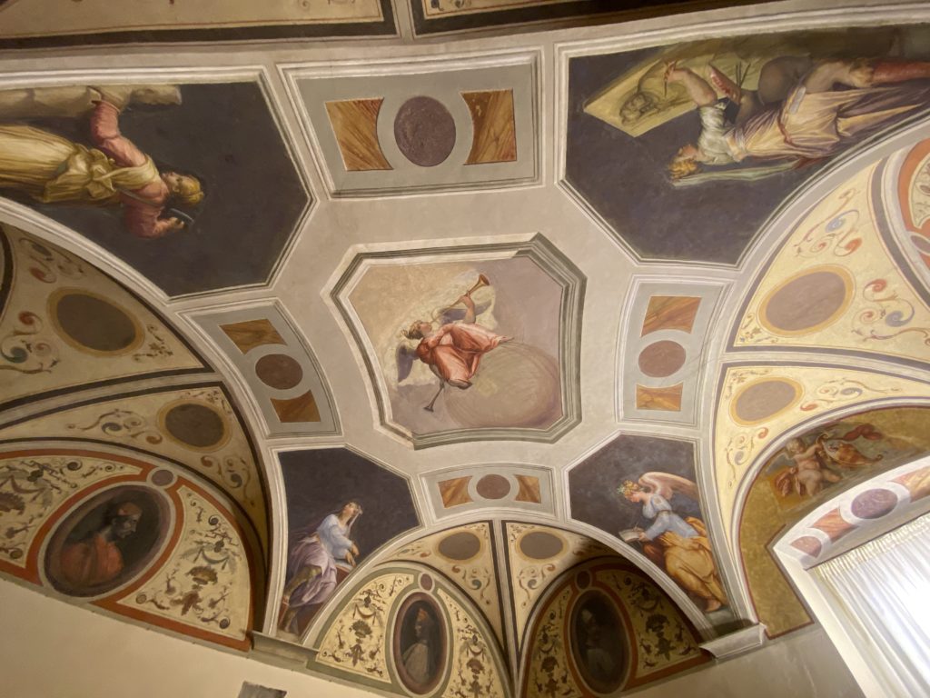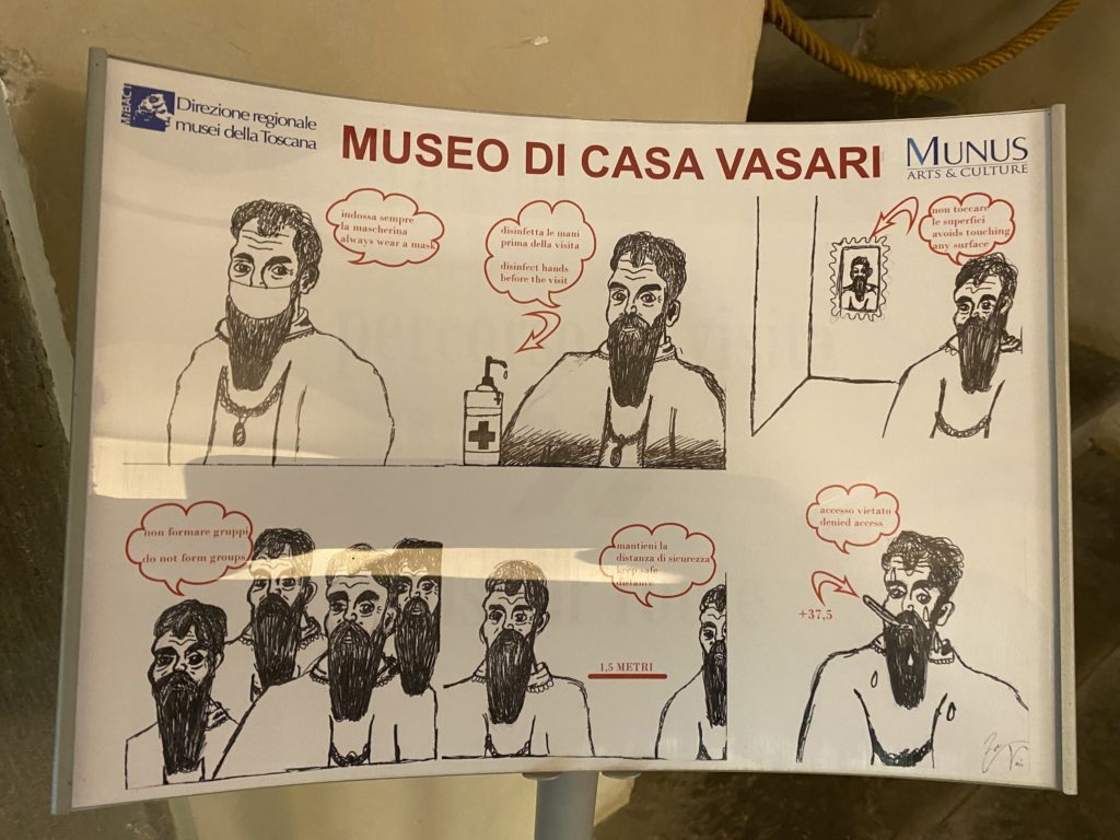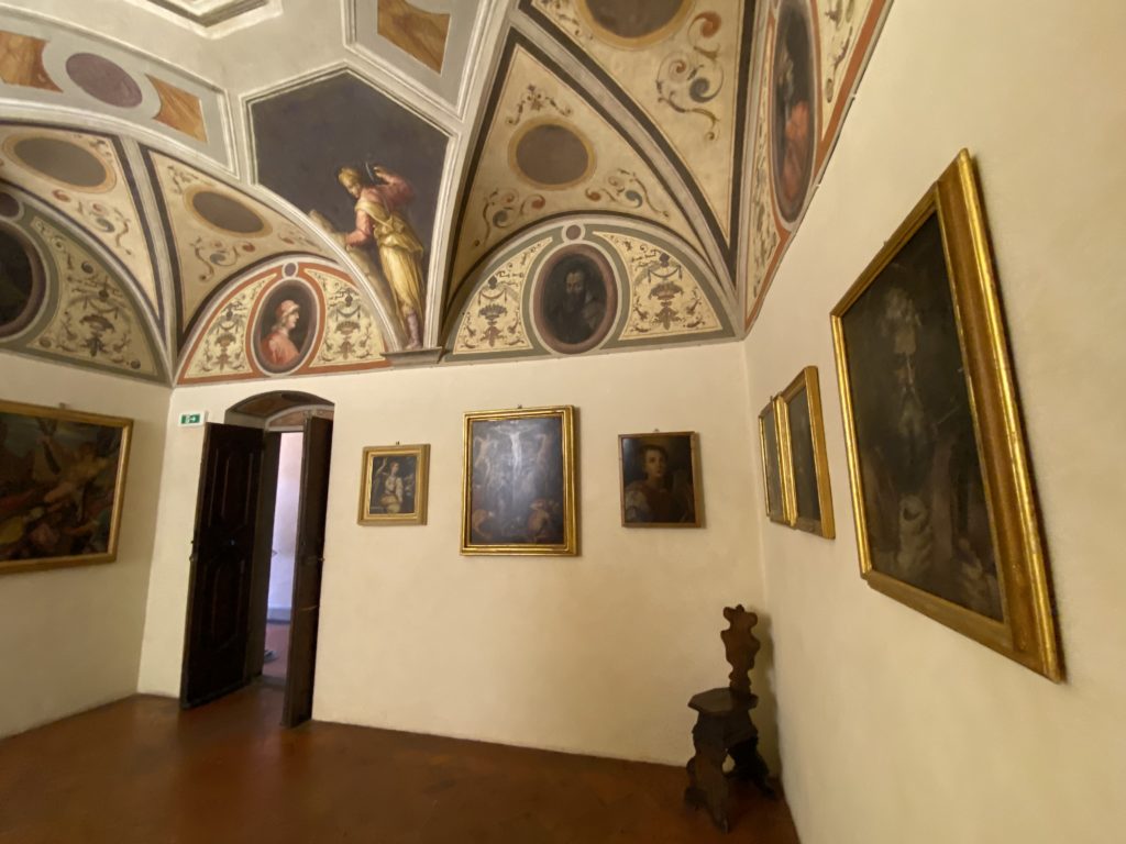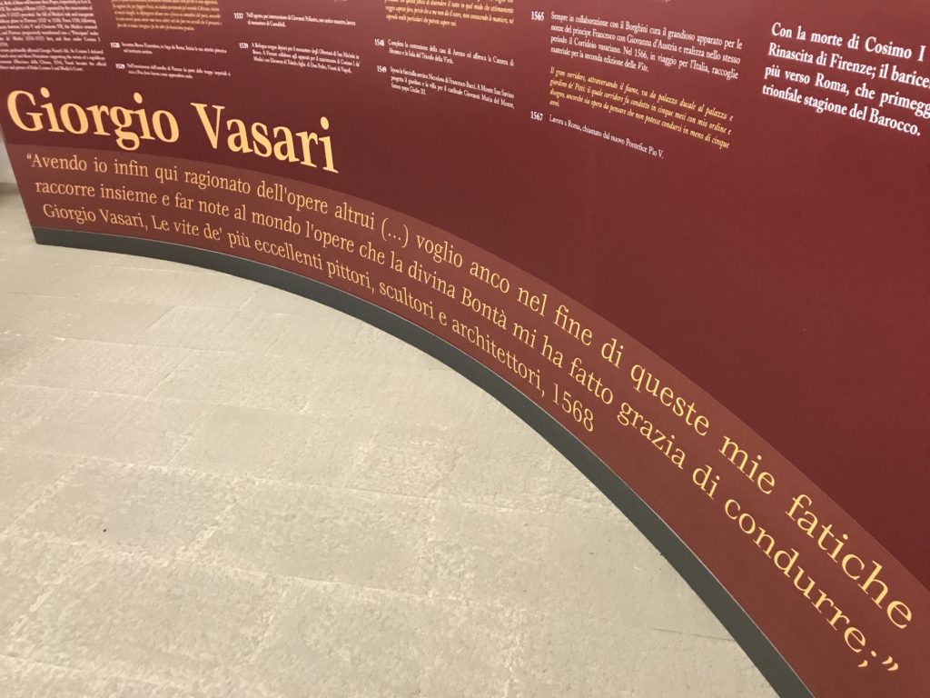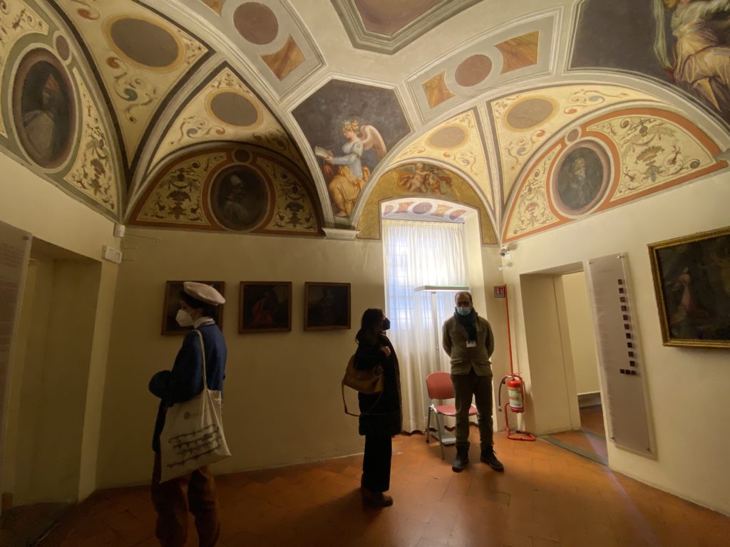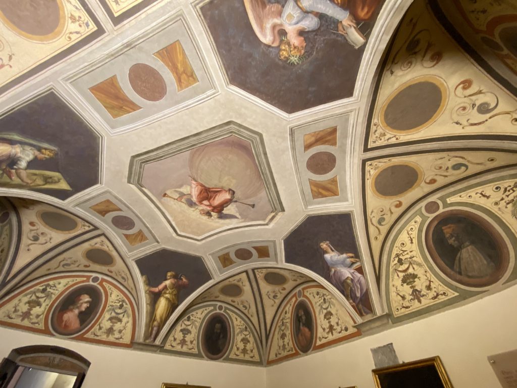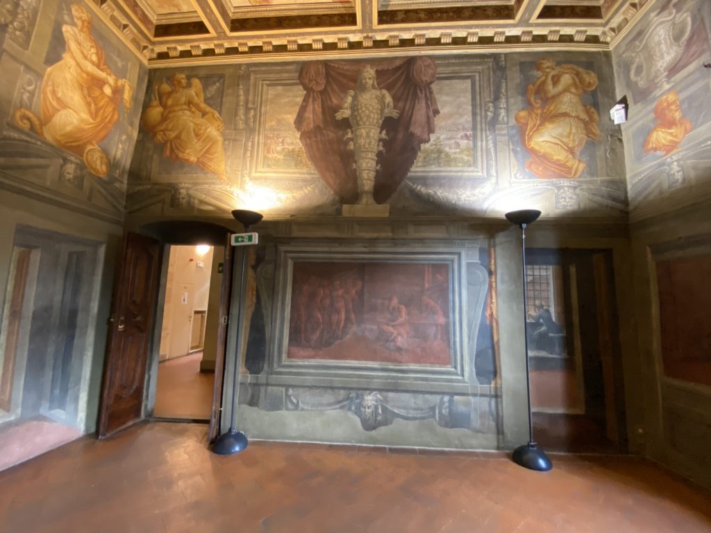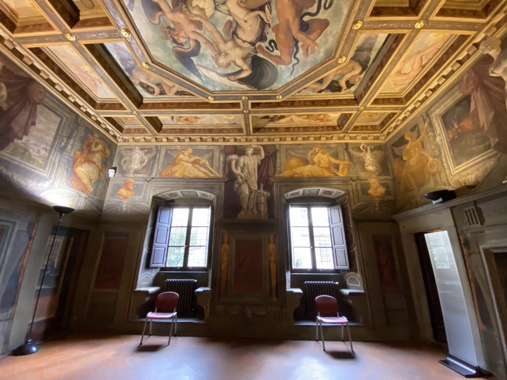 Nel borgo di San Vito la casa di Giorgio Vasari acquistata nel 1541, oggi sede museale dell’impronta visiva pittorica lasciata dall’artista. Costruita su tre piani la casa, organizzata per la servitù al primo e secondo piano. L’ultimo piano nobile la sua dimora privata. Intorno all’edificio un giardino all’italiana, rinascimentale, geometrico con siepi e una veduta sul borgo di Arezzo. Le decorazioni pittoriche della casa sono state realizzate da Vasari attento a celebrare e a evidenziare i simboli iconografici del proprio tempo con il contributo anche dei suoi amici aretini. Architetto, storico dell’arte e pittore, Giorgio Vasari affresca così le stanze a partire dal 1542. Il gusto manierista è visibile soprattutto nella quadreria con circa sessanta dipinti eseguiti da lui e dai suoi collaboratori. Al piano nobile, tramite una scalinata, con il busto di Vasari, si entra nella stanza del camino. L’artista affresca il luogo a partire dal 1548 con i temi: “Cacciata dell’Invidia” e della “Fortuna” da parte delle Virtù. La visione di questa pittura metafora della vita è nel soffitto a cassettone e nelle pareti appunto con figure allegoriche, paesaggi, storie eroiche dell’antichità, poi la “Cappellina” con la Madonna e Fra Paolino e il pavimento in maiolica del XVI secolo. Il tardo manierismo è presente nel corridoio con le sue visioni apocalittiche. La camera nuziale con il soffitto decorato da Vasari di Abramo tra le immagini del mondo, della “Pace”, la “Concordia”, le “Virtù” e la “Modestia”. La “Camera di Apollo” fu affrescata dall’artista è rappresenta Apollo e le nove muse con l’allegoria dell’amore, il ritratto della moglie Nicolosa Bacci. Nella camera della “Fama”, Vasari dipinse nel soffitto appunto il suo intendimento sulla “Fama” e nei peducci e lunette le quattro arti, il suo ritratto e degli artisti aretini: Signorelli, Della Gatta, Spinello, Aretino con Michelangelo e Andrea del Sarto. I contenuti allegorici e pittorici, la consistente visione continua e avvolgente della cosmologia dei miti antichi attualizzati, la narrazione insita dell’affresco, la visione manierista di un mondo bucolico e possibile per averlo vicino e condividerlo, fanno di Vasari un attento studioso e documentarista che attinge le sue conoscenze ai testi antichi per realizzare uno scenario così inedito e dettagliato nelle ragioni che afferma, esclusivo di una pittura commemorative e manierista che non ha eguali. Pitture murali sulle volte e sulle pareti, dipinti su tavola che Vasari realizza a più riprese nella sua abitazione decorata che vivacizza il suo pensiero e lo tiene costantemente aperto alla bellezza e al sogno dell’arte senza barriere.