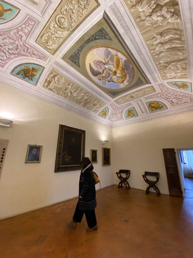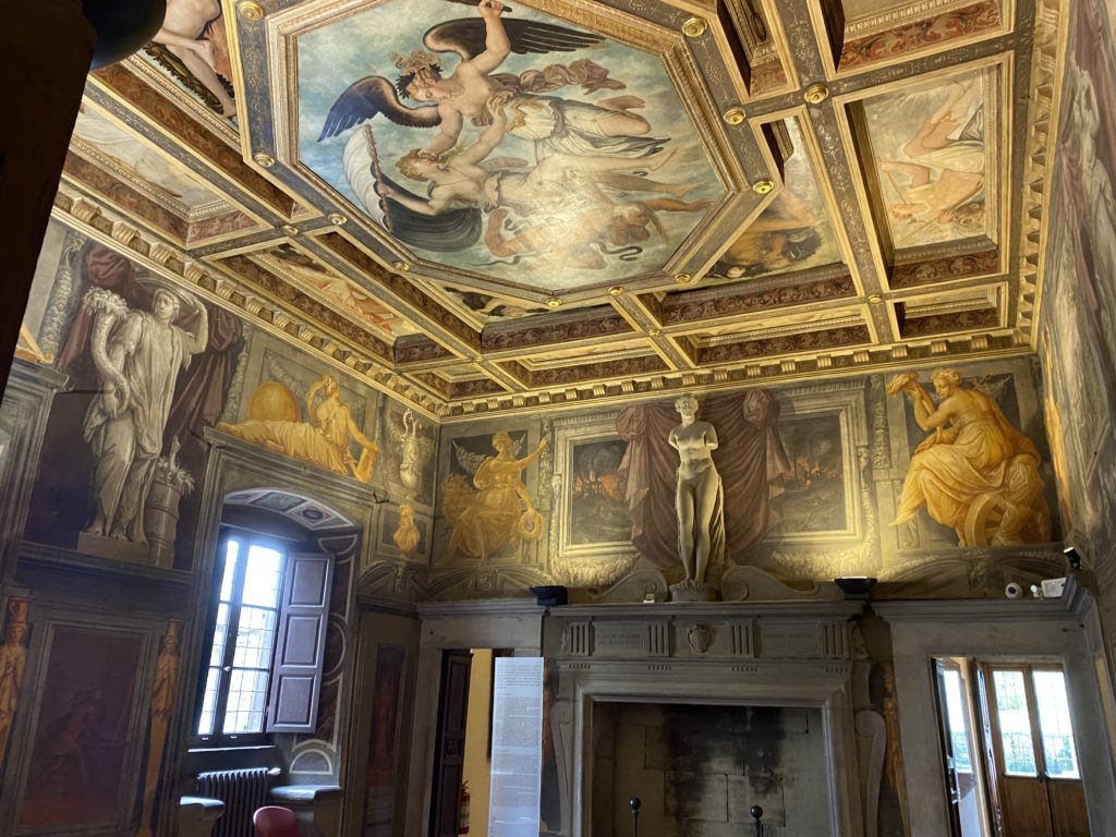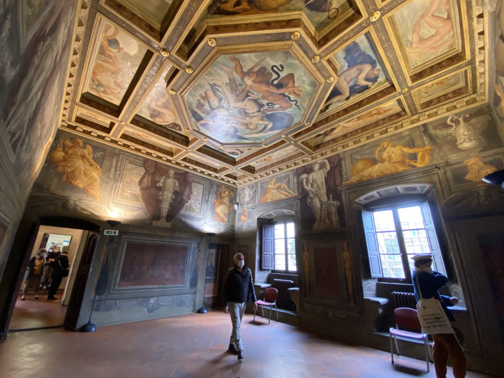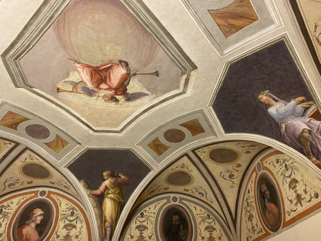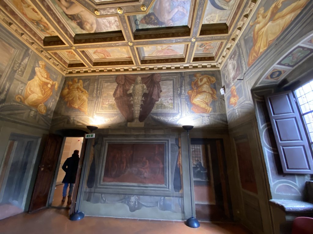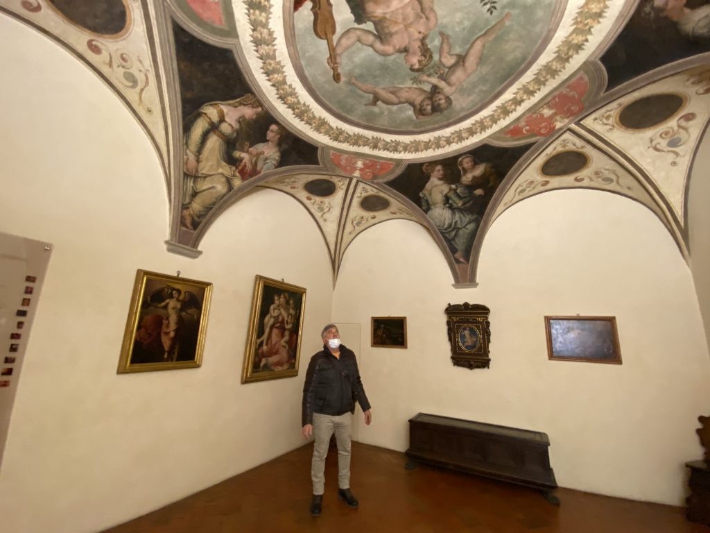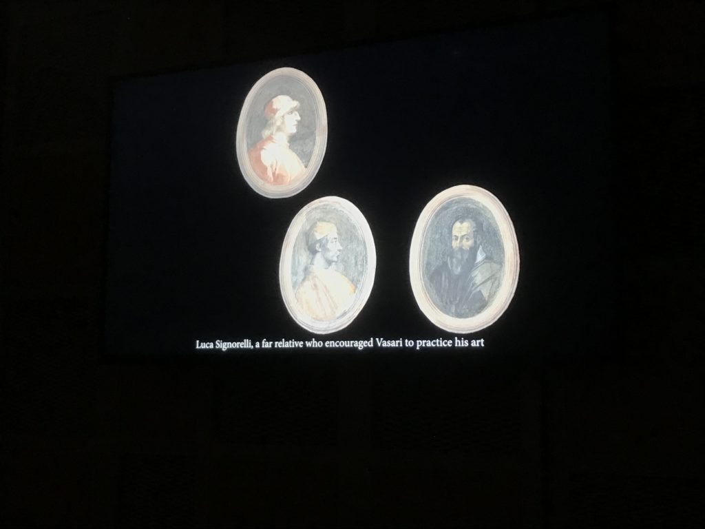 Nel borgo di San Vito la casa di Giorgio Vasari acquistata nel 1541, oggi sede museale dell’impronta visiva pittorica lasciata dall’artista. Costruita su tre piani la casa, organizzata per la servitù al primo e secondo piano. L’ultimo piano nobile la sua dimora privata. Intorno all’edificio un giardino all’italiana, rinascimentale, geometrico con siepi e una veduta sul borgo di Arezzo. Le decorazioni pittoriche della casa sono state realizzate da Vasari attento a celebrare e a evidenziare i simboli iconografici del proprio tempo con il contributo anche dei suoi amici aretini. Architetto, storico dell’arte e pittore, Giorgio Vasari affresca così le stanze a partire dal 1542. Il gusto manierista è visibile soprattutto nella quadreria con circa sessanta dipinti eseguiti da lui e dai suoi collaboratori. Al piano nobile, tramite una scalinata, con il busto di Vasari, si entra nella stanza del camino. L’artista affresca il luogo a partire dal 1548 con i temi: “Cacciata dell’Invidia” e della “Fortuna” da parte delle Virtù. La visione di questa pittura metafora della vita è nel soffitto a cassettone e nelle pareti appunto con figure allegoriche, paesaggi, storie eroiche dell’antichità, poi la “Cappellina” con la Madonna e Fra Paolino e il pavimento in maiolica del XVI secolo. Il tardo manierismo è presente nel corridoio con le sue visioni apocalittiche. La camera nuziale con il soffitto decorato da Vasari di Abramo tra le immagini del mondo, della “Pace”, la “Concordia”, le “Virtù” e la “Modestia”. La “Camera di Apollo” fu affrescata dall’artista è rappresenta Apollo e le nove muse con l’allegoria dell’amore, il ritratto della moglie Nicolosa Bacci. Nella camera della “Fama”, Vasari dipinse nel soffitto appunto il suo intendimento sulla “Fama” e nei peducci e lunette le quattro arti, il suo ritratto e degli artisti aretini: Signorelli, Della Gatta, Spinello, Aretino con Michelangelo e Andrea del Sarto. I contenuti allegorici e pittorici, la consistente visione continua e avvolgente della cosmologia dei miti antichi attualizzati, la narrazione insita dell’affresco, la visione manierista di un mondo bucolico e possibile per averlo vicino e condividerlo, fanno di Vasari un attento studioso e documentarista che attinge le sue conoscenze ai testi antichi per realizzare uno scenario così inedito e dettagliato nelle ragioni che afferma, esclusivo di una pittura commemorative e manierista che non ha eguali. Pitture murali sulle volte e sulle pareti, dipinti su tavola che Vasari realizza a più riprese nella sua abitazione decorata che vivacizza il suo pensiero e lo tiene costantemente aperto alla bellezza e al sogno dell’arte senza barriere.