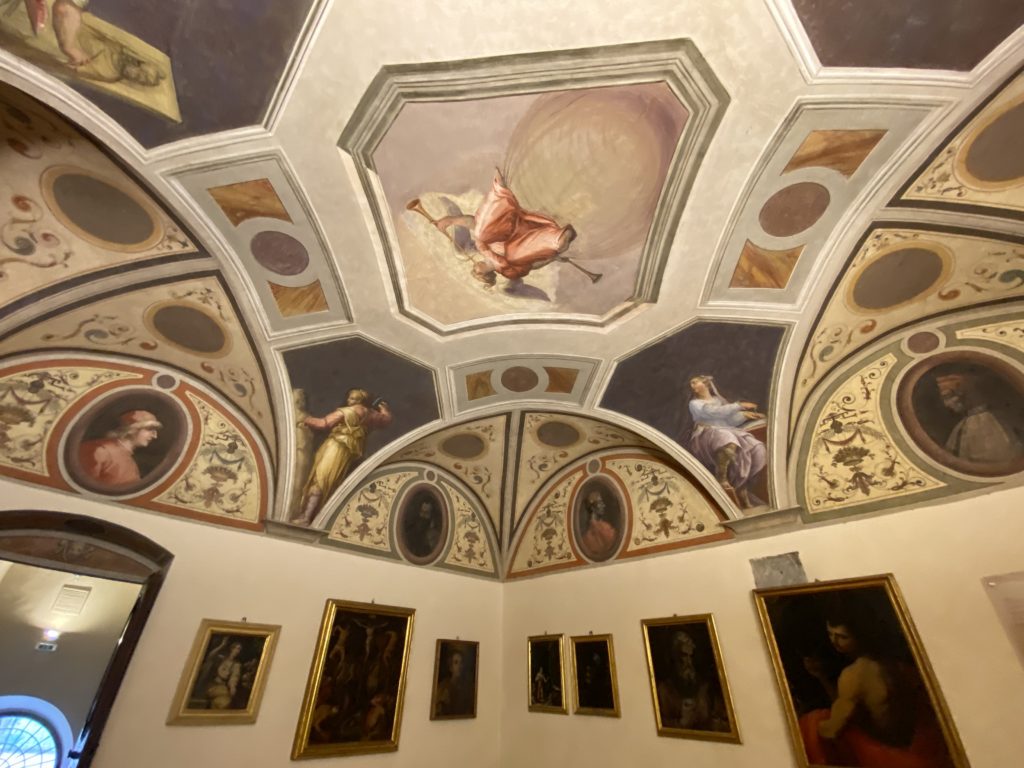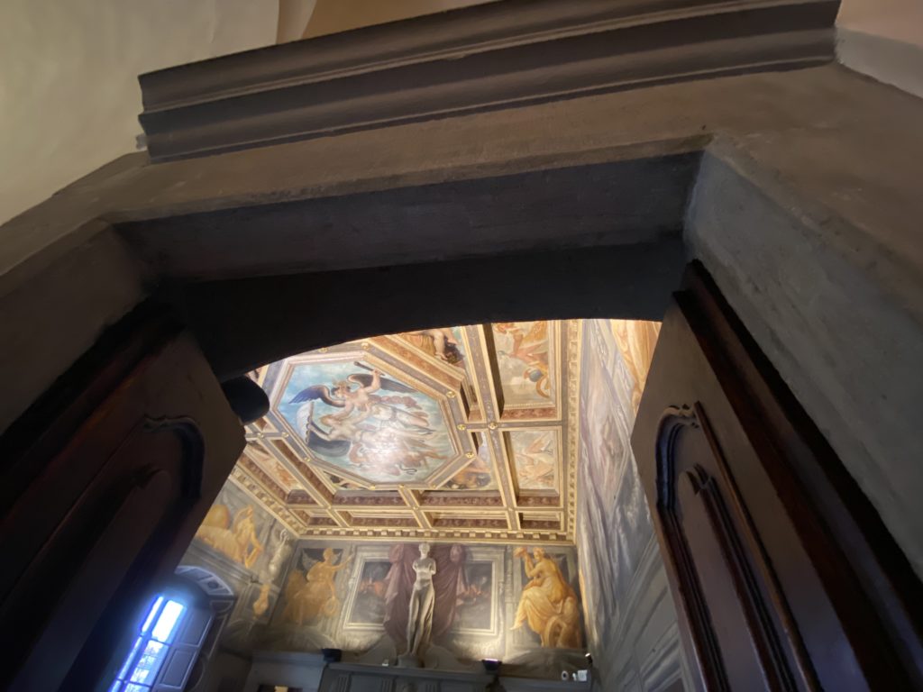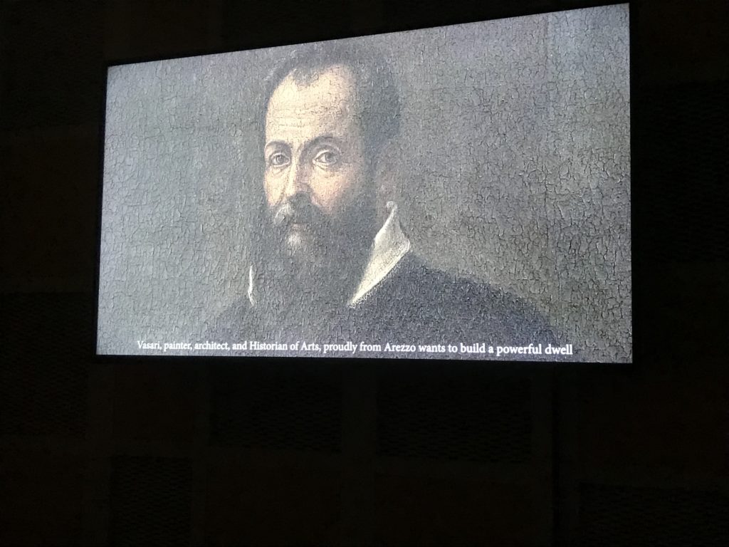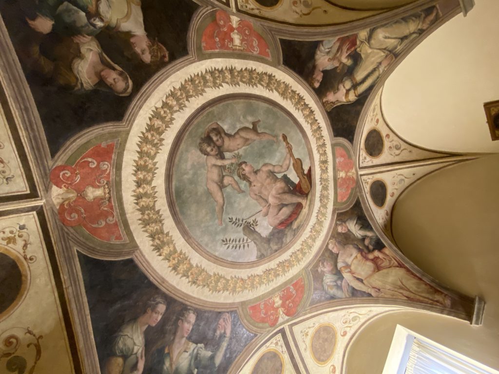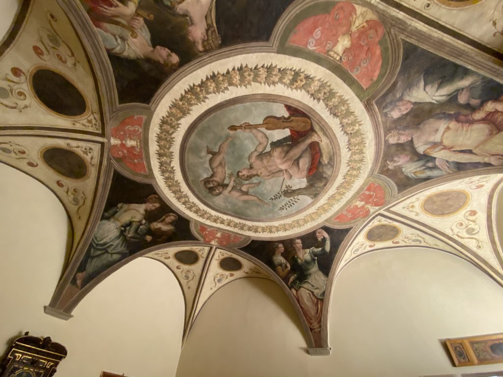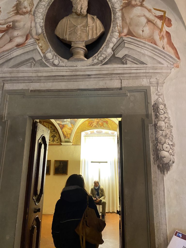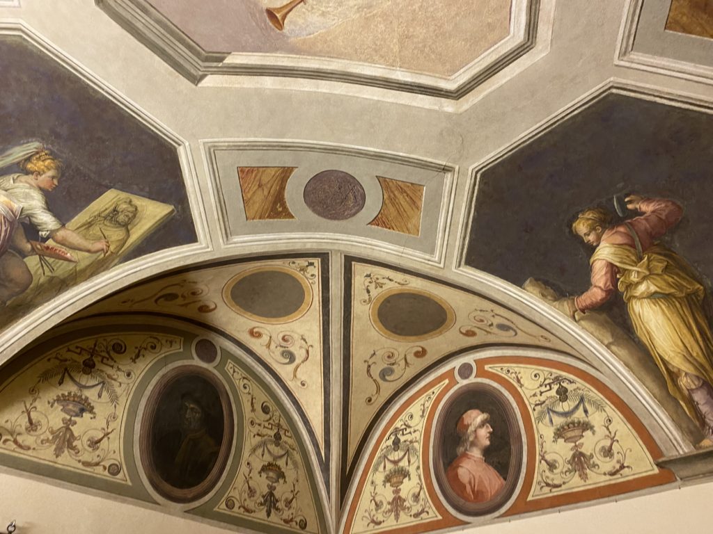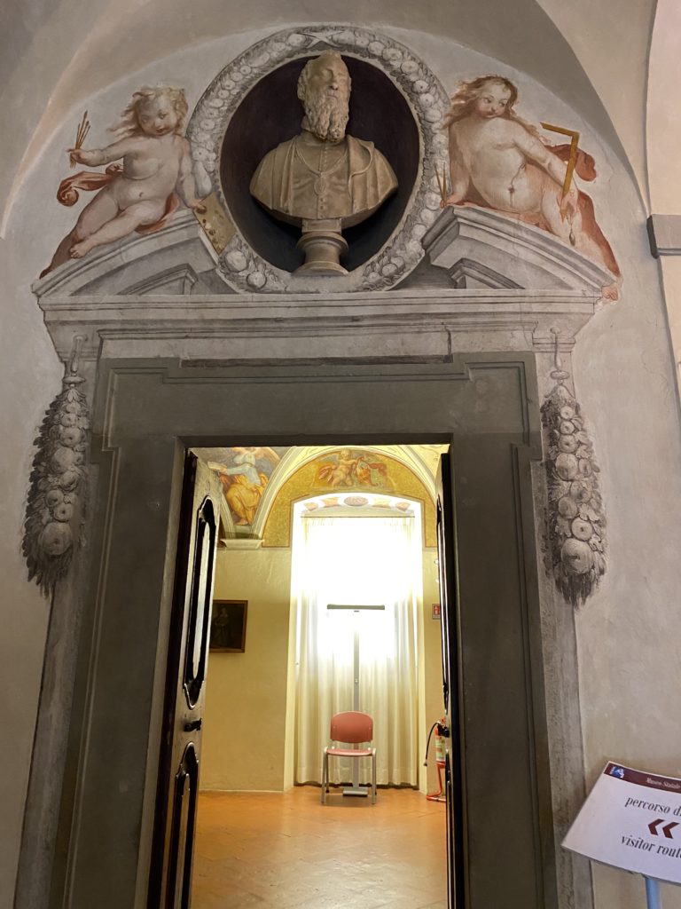 Nel borgo di San Vito la casa di Giorgio Vasari acquistata nel 1541, oggi sede museale dell’impronta visiva pittorica lasciata dall’artista. Costruita su tre piani la casa, organizzata per la servitù al primo e secondo piano. L’ultimo piano nobile la sua dimora privata. Intorno all’edificio un giardino all’italiana, rinascimentale, geometrico con siepi e una veduta sul borgo di Arezzo. Le decorazioni pittoriche della casa sono state realizzate da Vasari attento a celebrare e a evidenziare i simboli iconografici del proprio tempo con il contributo anche dei suoi amici aretini. Architetto, storico dell’arte e pittore, Giorgio Vasari affresca così le stanze a partire dal 1542. Il gusto manierista è visibile soprattutto nella quadreria con circa sessanta dipinti eseguiti da lui e dai suoi collaboratori. Al piano nobile, tramite una scalinata, con il busto di Vasari, si entra nella stanza del camino. L’artista affresca il luogo a partire dal 1548 con i temi: “Cacciata dell’Invidia” e della “Fortuna” da parte delle Virtù. La visione di questa pittura metafora della vita è nel soffitto a cassettone e nelle pareti appunto con figure allegoriche, paesaggi, storie eroiche dell’antichità, poi la “Cappellina” con la Madonna e Fra Paolino e il pavimento in maiolica del XVI secolo. Il tardo manierismo è presente nel corridoio con le sue visioni apocalittiche. La camera nuziale con il soffitto decorato da Vasari di Abramo tra le immagini del mondo, della “Pace”, la “Concordia”, le “Virtù” e la “Modestia”. La “Camera di Apollo” fu affrescata dall’artista è rappresenta Apollo e le nove muse con l’allegoria dell’amore, il ritratto della moglie Nicolosa Bacci. Nella camera della “Fama”, Vasari dipinse nel soffitto appunto il suo intendimento sulla “Fama” e nei peducci e lunette le quattro arti, il suo ritratto e degli artisti aretini: Signorelli, Della Gatta, Spinello, Aretino con Michelangelo e Andrea del Sarto. I contenuti allegorici e pittorici, la consistente visione continua e avvolgente della cosmologia dei miti antichi attualizzati, la narrazione insita dell’affresco, la visione manierista di un mondo bucolico e possibile per averlo vicino e condividerlo, fanno di Vasari un attento studioso e documentarista che attinge le sue conoscenze ai testi antichi per realizzare uno scenario così inedito e dettagliato nelle ragioni che afferma, esclusivo di una pittura commemorative e manierista che non ha eguali. Pitture murali sulle volte e sulle pareti, dipinti su tavola che Vasari realizza a più riprese nella sua abitazione decorata che vivacizza il suo pensiero e lo tiene costantemente aperto alla bellezza e al sogno dell’arte senza barriere.