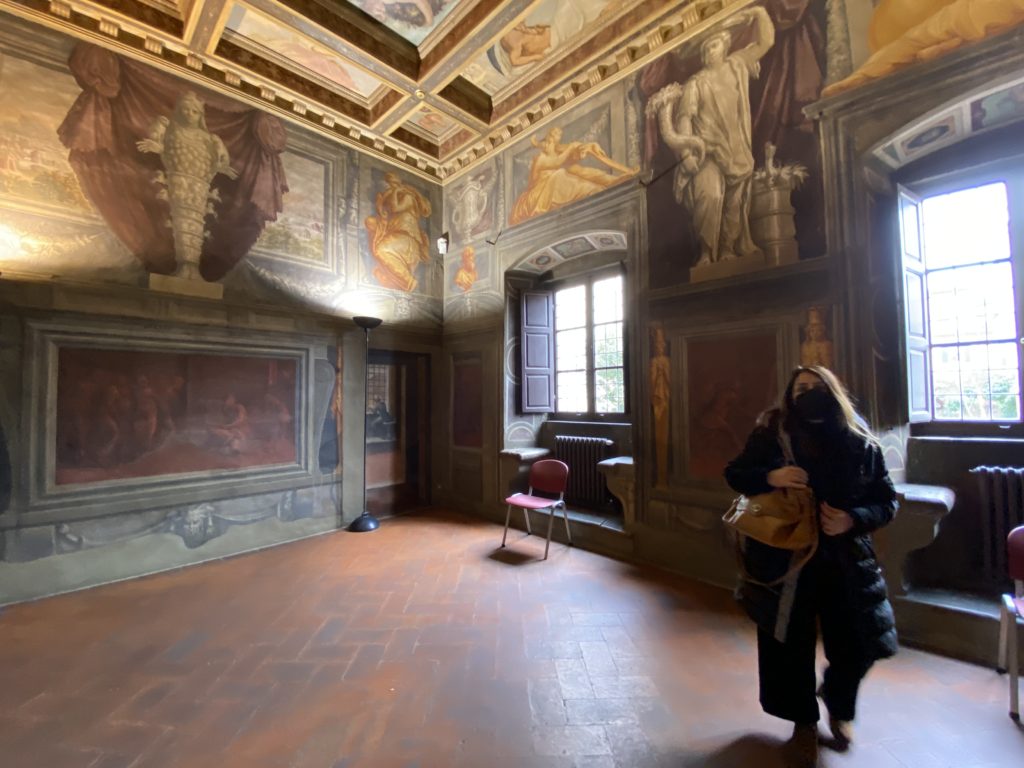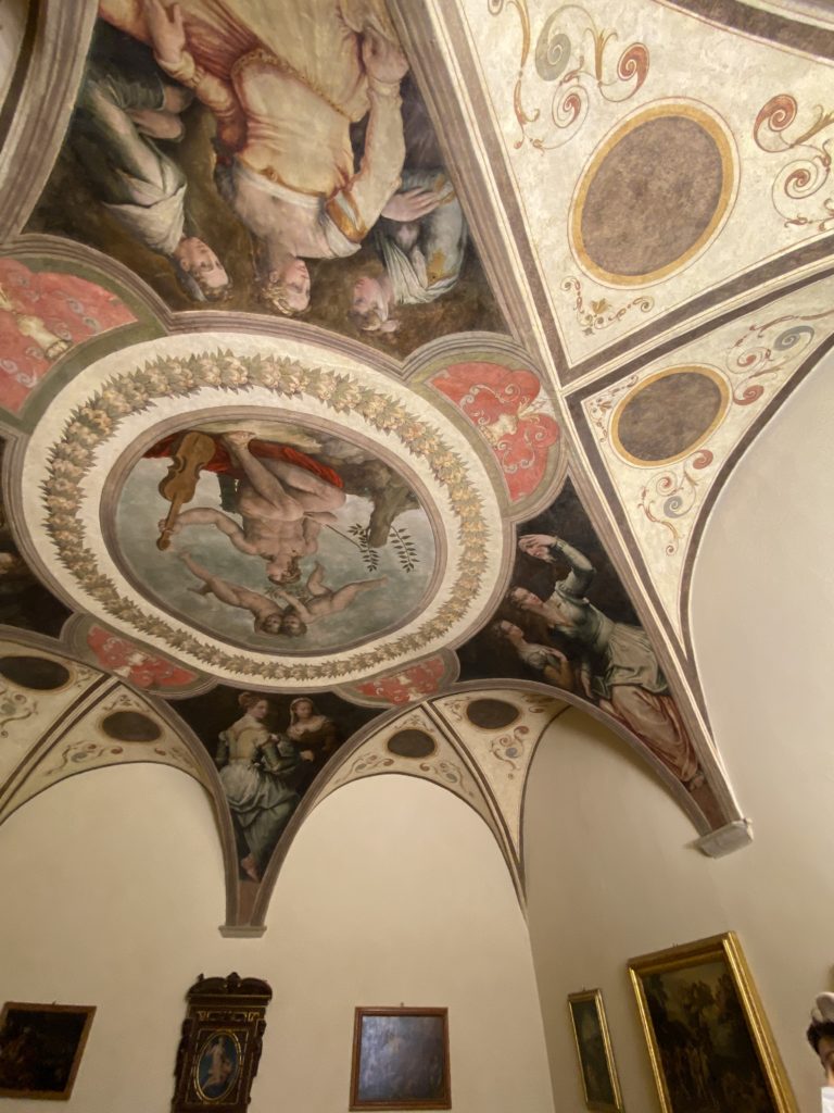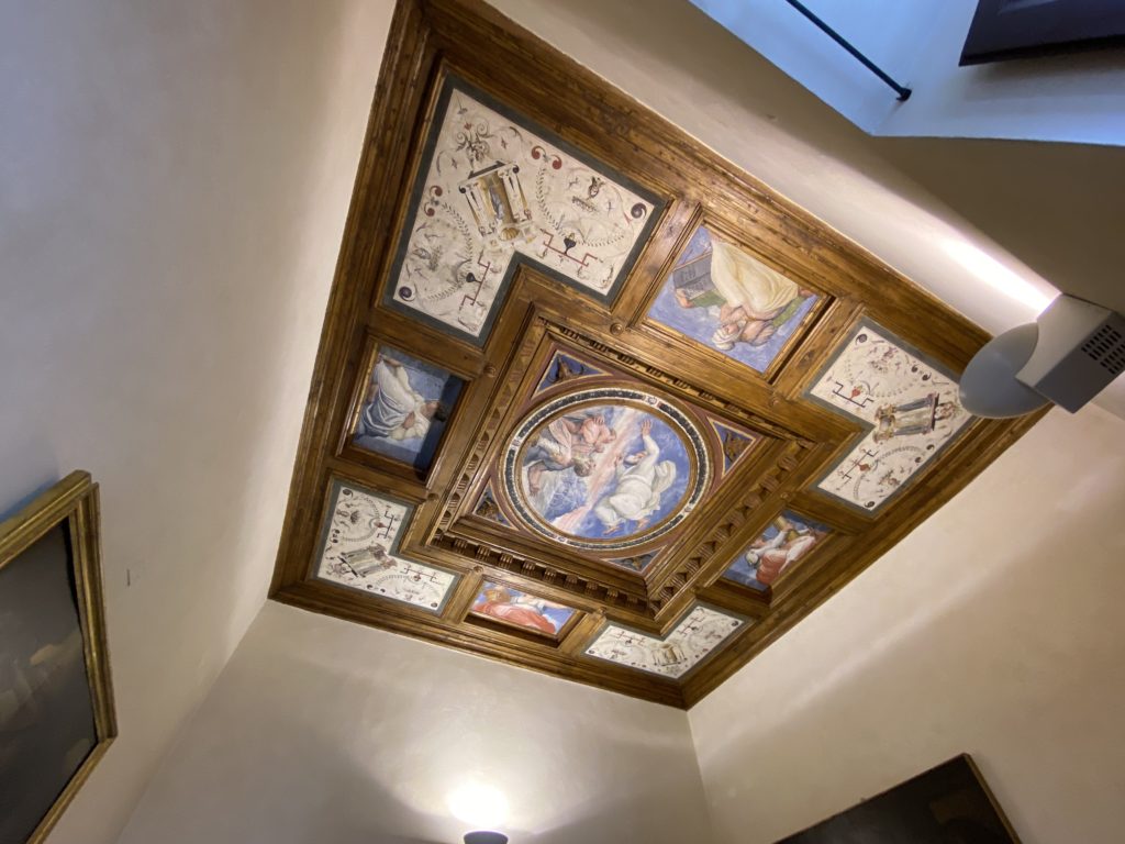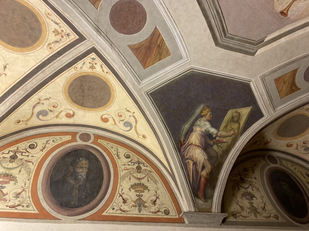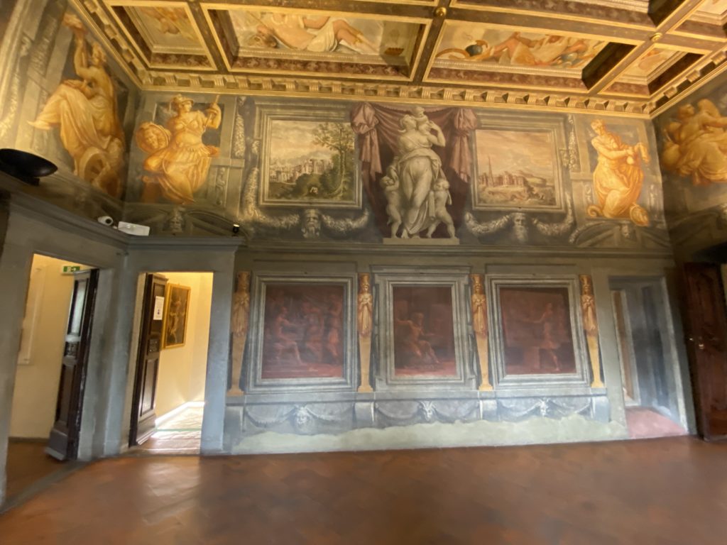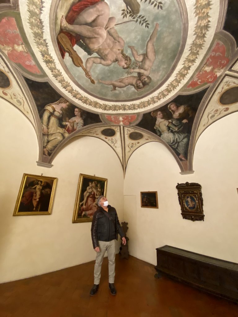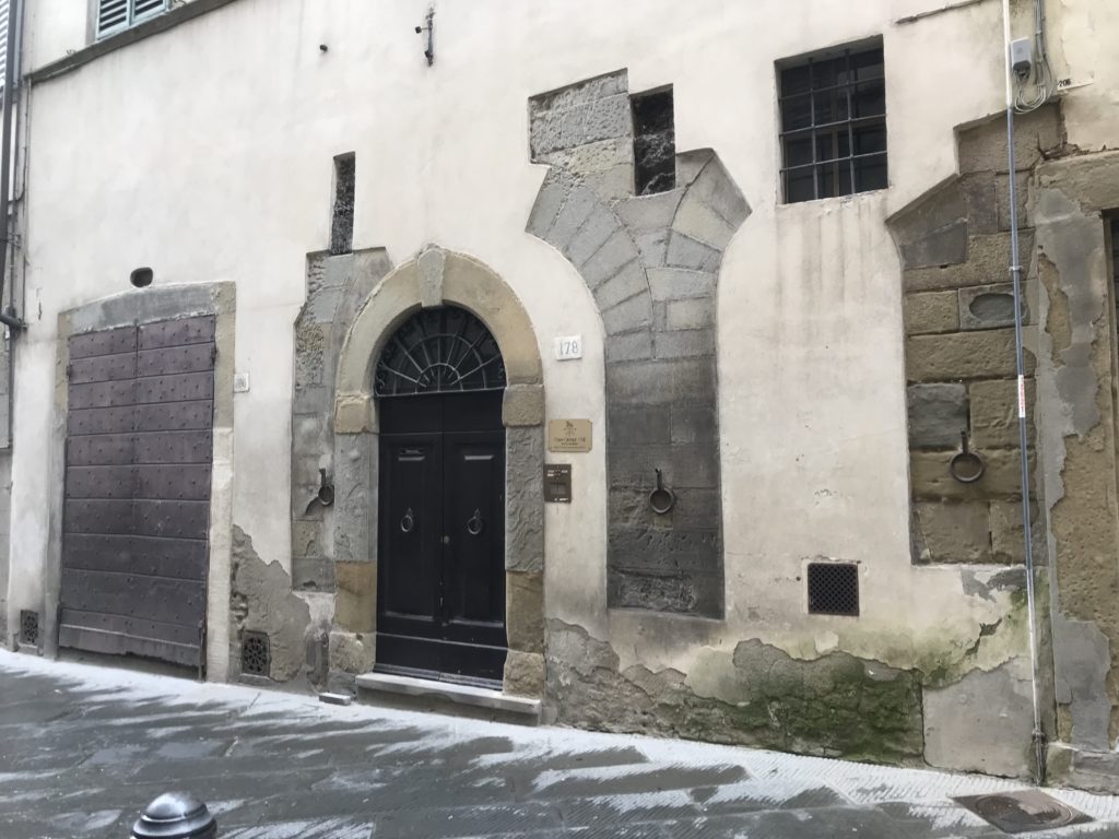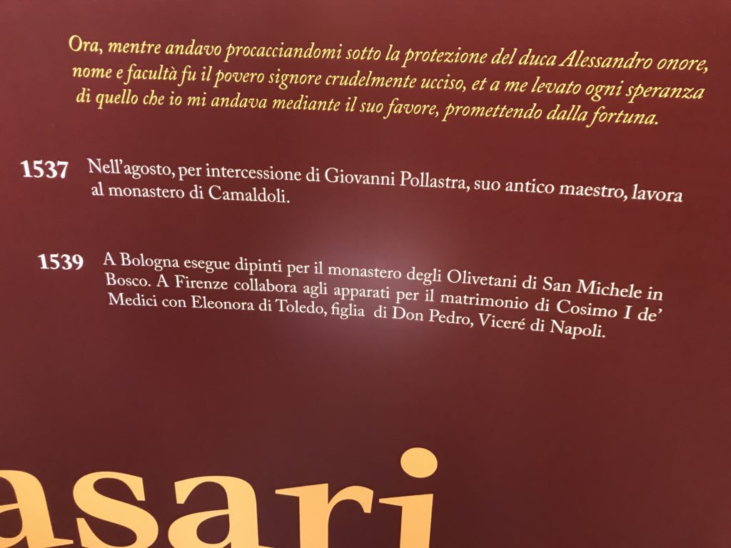 Nel borgo di San Vito la casa di Giorgio Vasari acquistata nel 1541, oggi sede museale dell’impronta visiva pittorica lasciata dall’artista. Costruita su tre piani la casa, organizzata per la servitù al primo e secondo piano. L’ultimo piano nobile la sua dimora privata. Intorno all’edificio un giardino all’italiana, rinascimentale, geometrico con siepi e una veduta sul borgo di Arezzo. Le decorazioni pittoriche della casa sono state realizzate da Vasari attento a celebrare e a evidenziare i simboli iconografici del proprio tempo con il contributo anche dei suoi amici aretini. Architetto, storico dell’arte e pittore, Giorgio Vasari affresca così le stanze a partire dal 1542. Il gusto manierista è visibile soprattutto nella quadreria con circa sessanta dipinti eseguiti da lui e dai suoi collaboratori. Al piano nobile, tramite una scalinata, con il busto di Vasari, si entra nella stanza del camino. L’artista affresca il luogo a partire dal 1548 con i temi: “Cacciata dell’Invidia” e della “Fortuna” da parte delle Virtù. La visione di questa pittura metafora della vita è nel soffitto a cassettone e nelle pareti appunto con figure allegoriche, paesaggi, storie eroiche dell’antichità, poi la “Cappellina” con la Madonna e Fra Paolino e il pavimento in maiolica del XVI secolo. Il tardo manierismo è presente nel corridoio con le sue visioni apocalittiche. La camera nuziale con il soffitto decorato da Vasari di Abramo tra le immagini del mondo, della “Pace”, la “Concordia”, le “Virtù” e la “Modestia”. La “Camera di Apollo” fu affrescata dall’artista è rappresenta Apollo e le nove muse con l’allegoria dell’amore, il ritratto della moglie Nicolosa Bacci. Nella camera della “Fama”, Vasari dipinse nel soffitto appunto il suo intendimento sulla “Fama” e nei peducci e lunette le quattro arti, il suo ritratto e degli artisti aretini: Signorelli, Della Gatta, Spinello, Aretino con Michelangelo e Andrea del Sarto. I contenuti allegorici e pittorici, la consistente visione continua e avvolgente della cosmologia dei miti antichi attualizzati, la narrazione insita dell’affresco, la visione manierista di un mondo bucolico e possibile per averlo vicino e condividerlo, fanno di Vasari un attento studioso e documentarista che attinge le sue conoscenze ai testi antichi per realizzare uno scenario così inedito e dettagliato nelle ragioni che afferma, esclusivo di una pittura commemorative e manierista che non ha eguali. Pitture murali sulle volte e sulle pareti, dipinti su tavola che Vasari realizza a più riprese nella sua abitazione decorata che vivacizza il suo pensiero e lo tiene costantemente aperto alla bellezza e al sogno dell’arte senza barriere.
