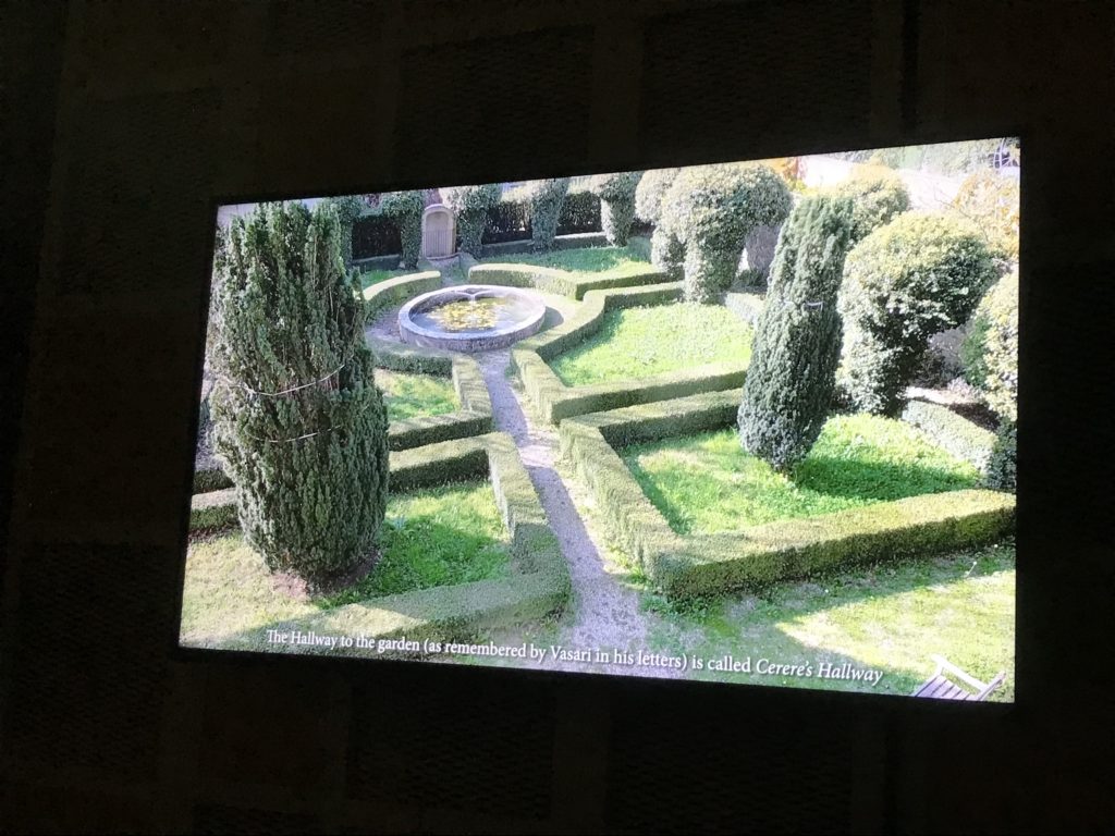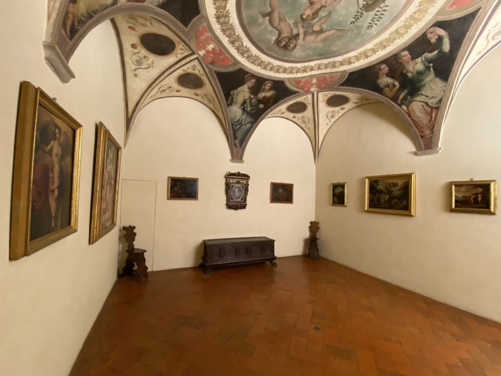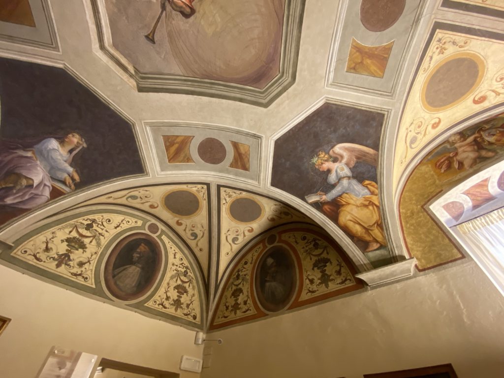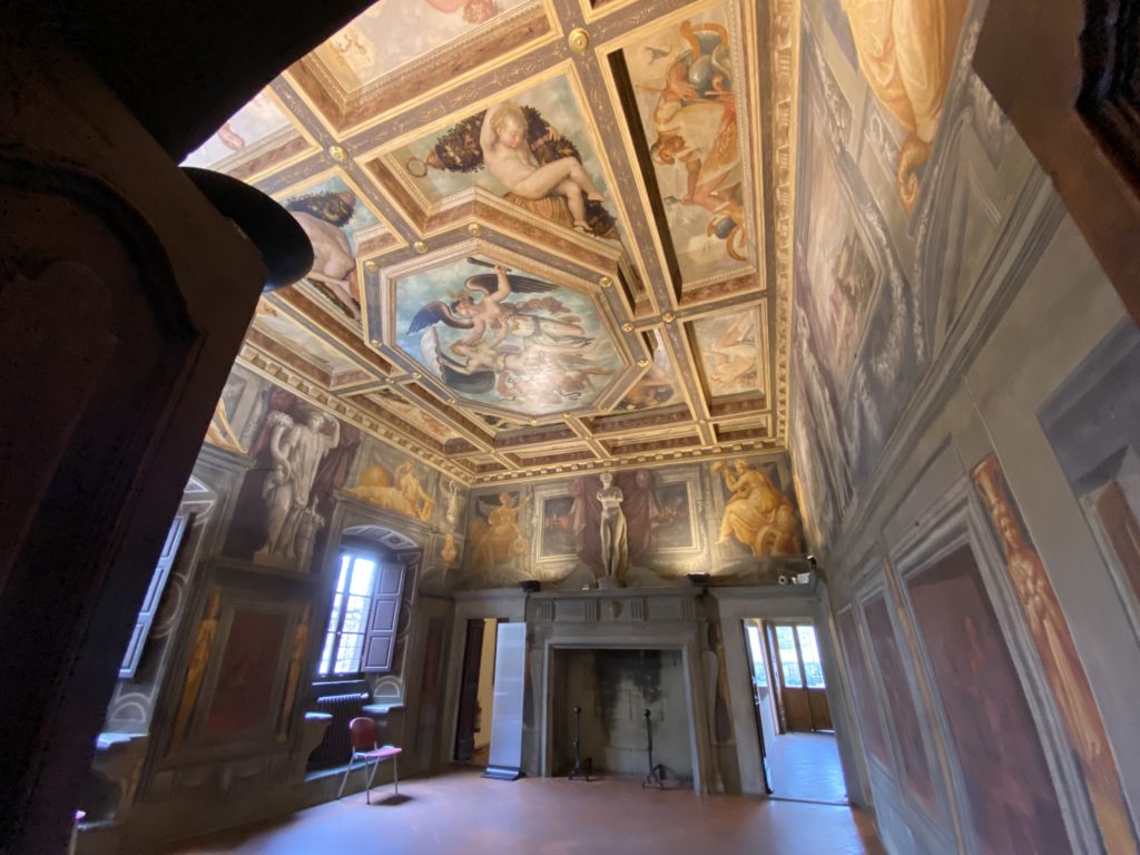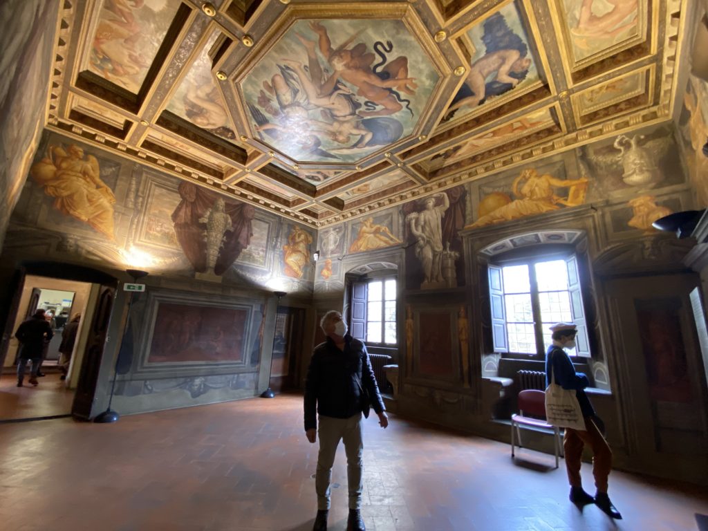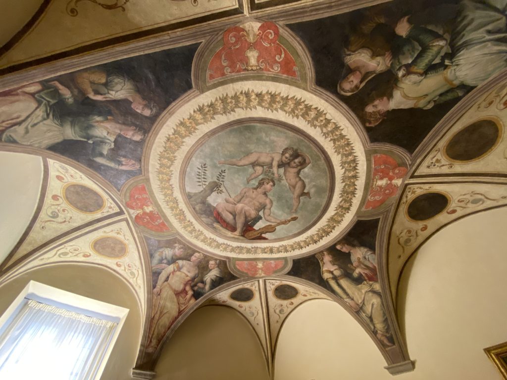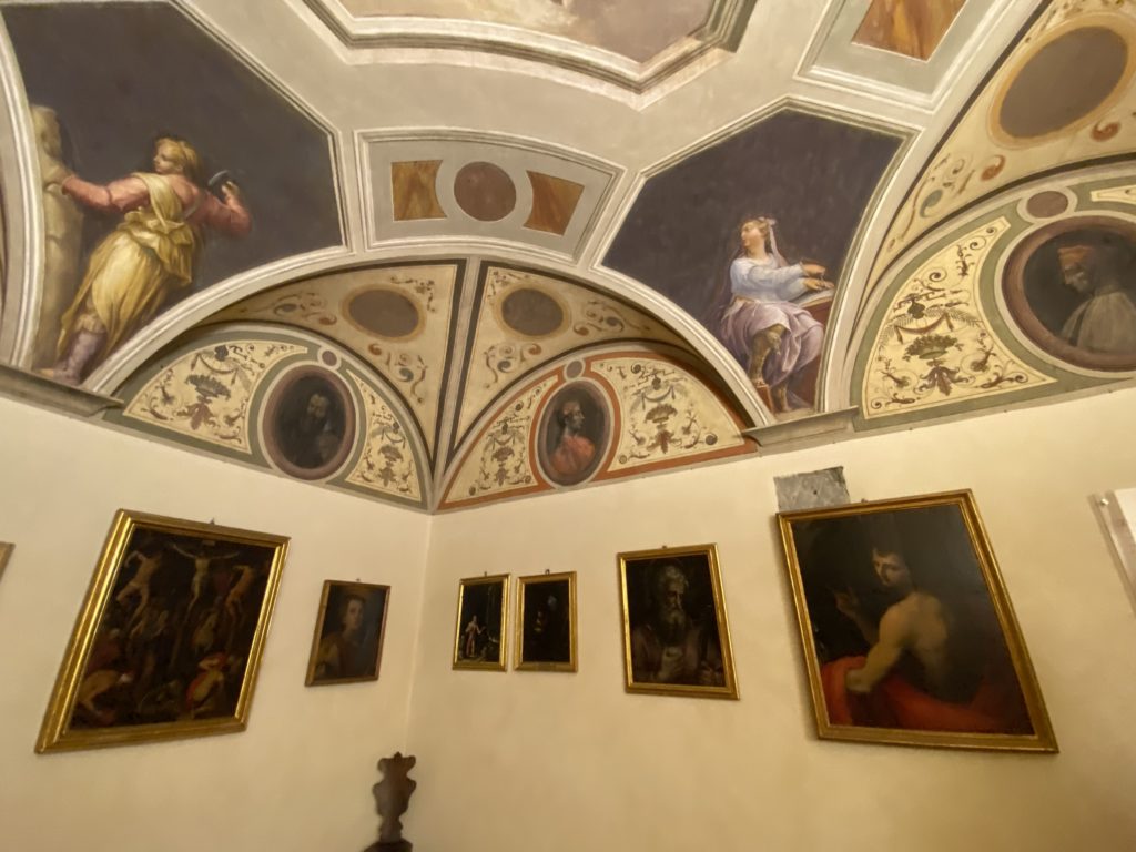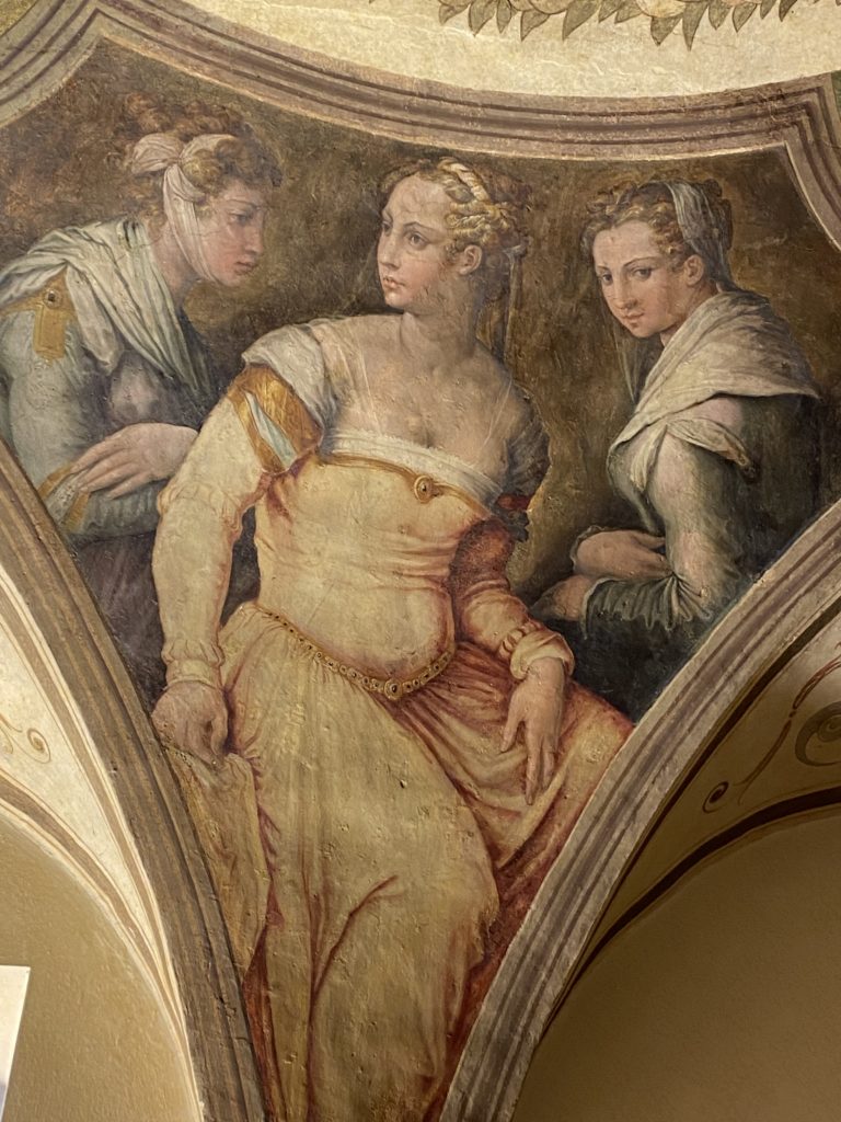 Nel borgo di San Vito la casa di Giorgio Vasari acquistata nel 1541, oggi sede museale dell’impronta visiva pittorica lasciata dall’artista. Costruita su tre piani la casa, organizzata per la servitù al primo e secondo piano. L’ultimo piano nobile la sua dimora privata. Intorno all’edificio un giardino all’italiana, rinascimentale, geometrico con siepi e una veduta sul borgo di Arezzo. Le decorazioni pittoriche della casa sono state realizzate da Vasari attento a celebrare e a evidenziare i simboli iconografici del proprio tempo con il contributo anche dei suoi amici aretini. Architetto, storico dell’arte e pittore, Giorgio Vasari affresca così le stanze a partire dal 1542. Il gusto manierista è visibile soprattutto nella quadreria con circa sessanta dipinti eseguiti da lui e dai suoi collaboratori. Al piano nobile, tramite una scalinata, con il busto di Vasari, si entra nella stanza del camino. L’artista affresca il luogo a partire dal 1548 con i temi: “Cacciata dell’Invidia” e della “Fortuna” da parte delle Virtù. La visione di questa pittura metafora della vita è nel soffitto a cassettone e nelle pareti appunto con figure allegoriche, paesaggi, storie eroiche dell’antichità, poi la “Cappellina” con la Madonna e Fra Paolino e il pavimento in maiolica del XVI secolo. Il tardo manierismo è presente nel corridoio con le sue visioni apocalittiche. La camera nuziale con il soffitto decorato da Vasari di Abramo tra le immagini del mondo, della “Pace”, la “Concordia”, le “Virtù” e la “Modestia”. La “Camera di Apollo” fu affrescata dall’artista è rappresenta Apollo e le nove muse con l’allegoria dell’amore, il ritratto della moglie Nicolosa Bacci. Nella camera della “Fama”, Vasari dipinse nel soffitto appunto il suo intendimento sulla “Fama” e nei peducci e lunette le quattro arti, il suo ritratto e degli artisti aretini: Signorelli, Della Gatta, Spinello, Aretino con Michelangelo e Andrea del Sarto. I contenuti allegorici e pittorici, la consistente visione continua e avvolgente della cosmologia dei miti antichi attualizzati, la narrazione insita dell’affresco, la visione manierista di un mondo bucolico e possibile per averlo vicino e condividerlo, fanno di Vasari un attento studioso e documentarista che attinge le sue conoscenze ai testi antichi per realizzare uno scenario così inedito e dettagliato nelle ragioni che afferma, esclusivo di una pittura commemorative e manierista che non ha eguali. Pitture murali sulle volte e sulle pareti, dipinti su tavola che Vasari realizza a più riprese nella sua abitazione decorata che vivacizza il suo pensiero e lo tiene costantemente aperto alla bellezza e al sogno dell’arte senza barriere.