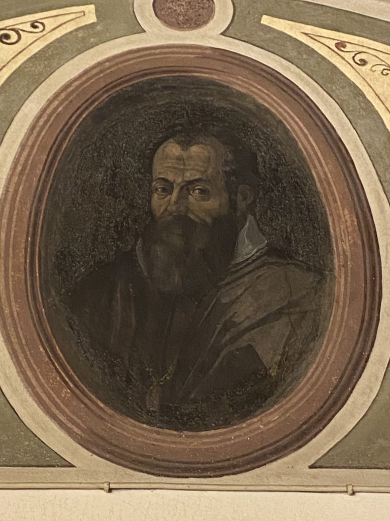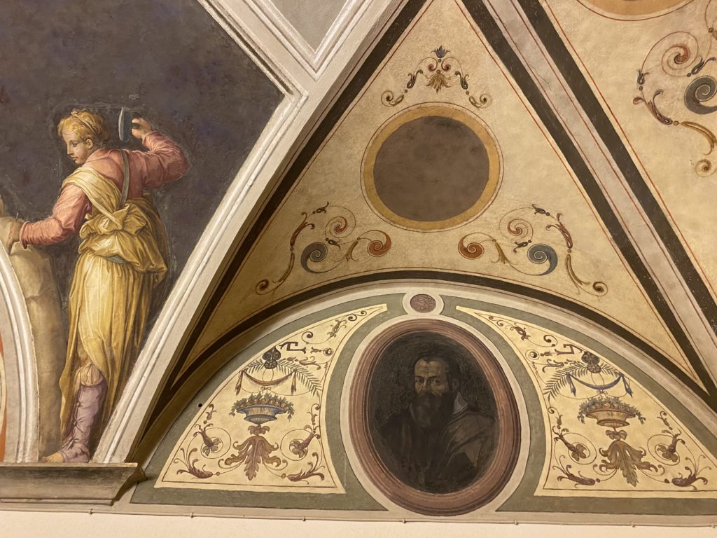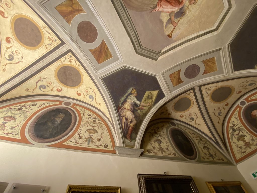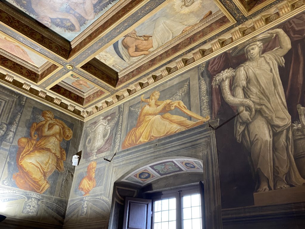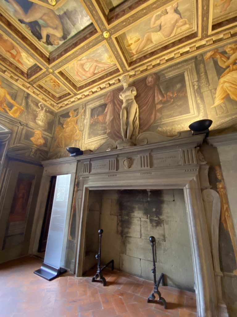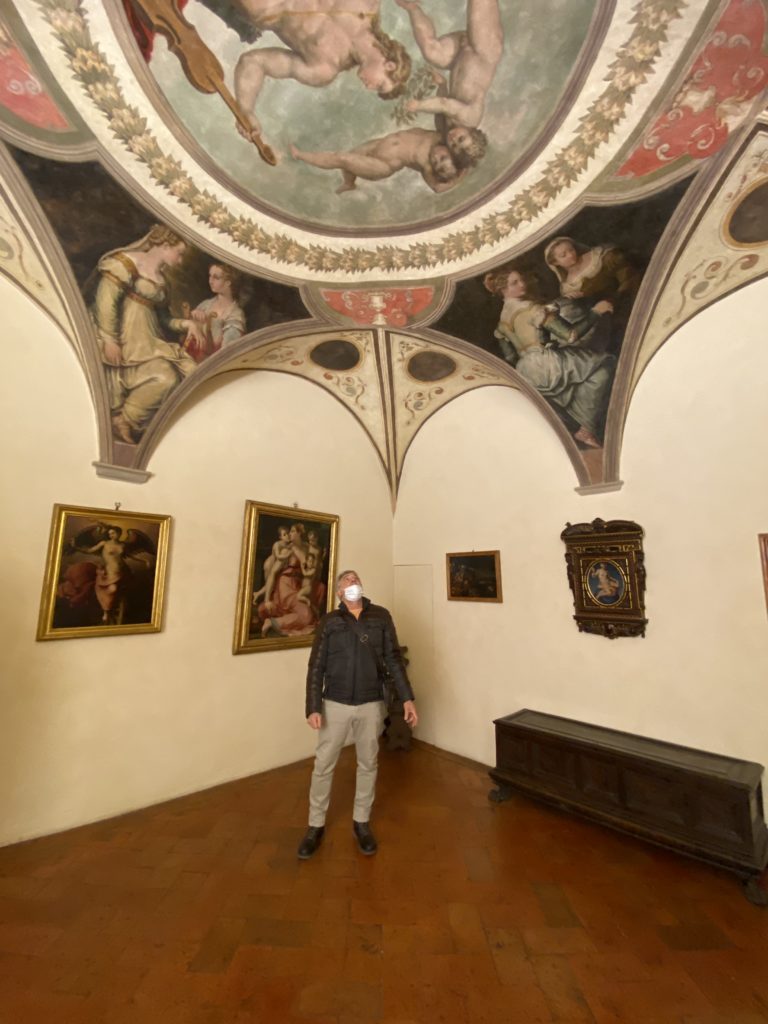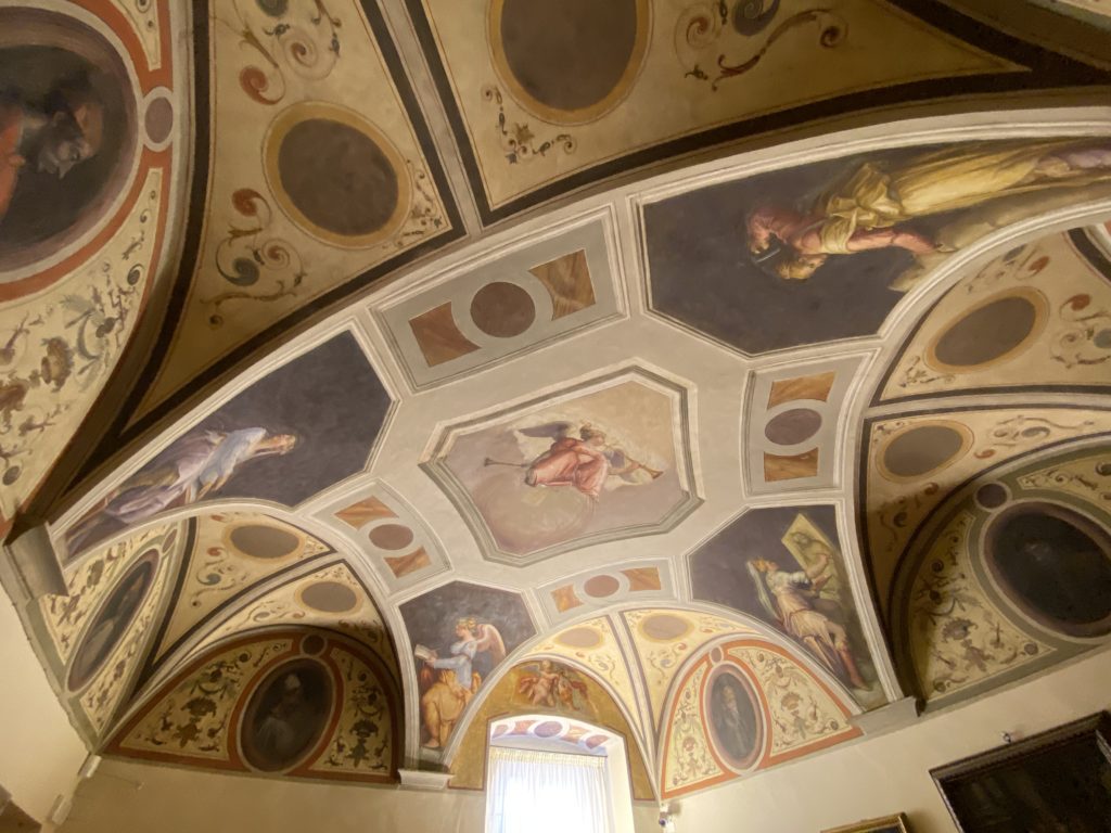Nel borgo di San Vito la casa di Giorgio Vasari acquistata nel 1541, oggi sede museale dell’impronta visiva pittorica lasciata dall’artista. Costruita su tre piani la casa, organizzata per la servitù al primo e secondo piano. L’ultimo piano nobile la sua dimora privata. Intorno all’edificio un giardino all’italiana, rinascimentale, geometrico con siepi e una veduta sul borgo di Arezzo. Le decorazioni pittoriche della casa sono state realizzate da Vasari attento a celebrare e a evidenziare i simboli iconografici del proprio tempo con il contributo anche dei suoi amici aretini. Architetto, storico dell’arte e pittore, Giorgio Vasari affresca così le stanze a partire dal 1542. Il gusto manierista è visibile soprattutto nella quadreria con circa sessanta dipinti eseguiti da lui e dai suoi collaboratori. Al piano nobile, tramite una scalinata, con il busto di Vasari, si entra nella stanza del camino. L’artista affresca il luogo a partire dal 1548 con i temi: “Cacciata dell’Invidia” e della “Fortuna” da parte delle Virtù. La visione di questa pittura metafora della vita è nel soffitto a cassettone e nelle pareti appunto con figure allegoriche, paesaggi, storie eroiche dell’antichità, poi la “Cappellina” con la Madonna e Fra Paolino e il pavimento in maiolica del XVI secolo. Il tardo manierismo è presente nel corridoio con le sue visioni apocalittiche. La camera nuziale con il soffitto decorato da Vasari di Abramo tra le immagini del mondo, della “Pace”, la “Concordia”, le “Virtù” e la “Modestia”. La “Camera di Apollo” fu affrescata dall’artista è rappresenta Apollo e le nove muse con l’allegoria dell’amore, il ritratto della moglie Nicolosa Bacci. Nella camera della “Fama”, Vasari dipinse nel soffitto appunto il suo intendimento sulla “Fama” e nei peducci e lunette le quattro arti, il suo ritratto e degli artisti aretini: Signorelli, Della Gatta, Spinello, Aretino con Michelangelo e Andrea del Sarto. I contenuti allegorici e pittorici, la consistente visione continua e avvolgente della cosmologia dei miti antichi attualizzati, la narrazione insita dell’affresco, la visione manierista di un mondo bucolico e possibile per averlo vicino e condividerlo, fanno di Vasari un attento studioso e documentarista che attinge le sue conoscenze ai testi antichi per realizzare uno scenario così inedito e dettagliato nelle ragioni che afferma, esclusivo di una pittura commemorative e manierista che non ha eguali. Pitture murali sulle volte e sulle pareti, dipinti su tavola che Vasari realizza a più riprese nella sua abitazione decorata che vivacizza il suo pensiero e lo tiene costantemente aperto alla bellezza e al sogno dell’arte senza barriere.