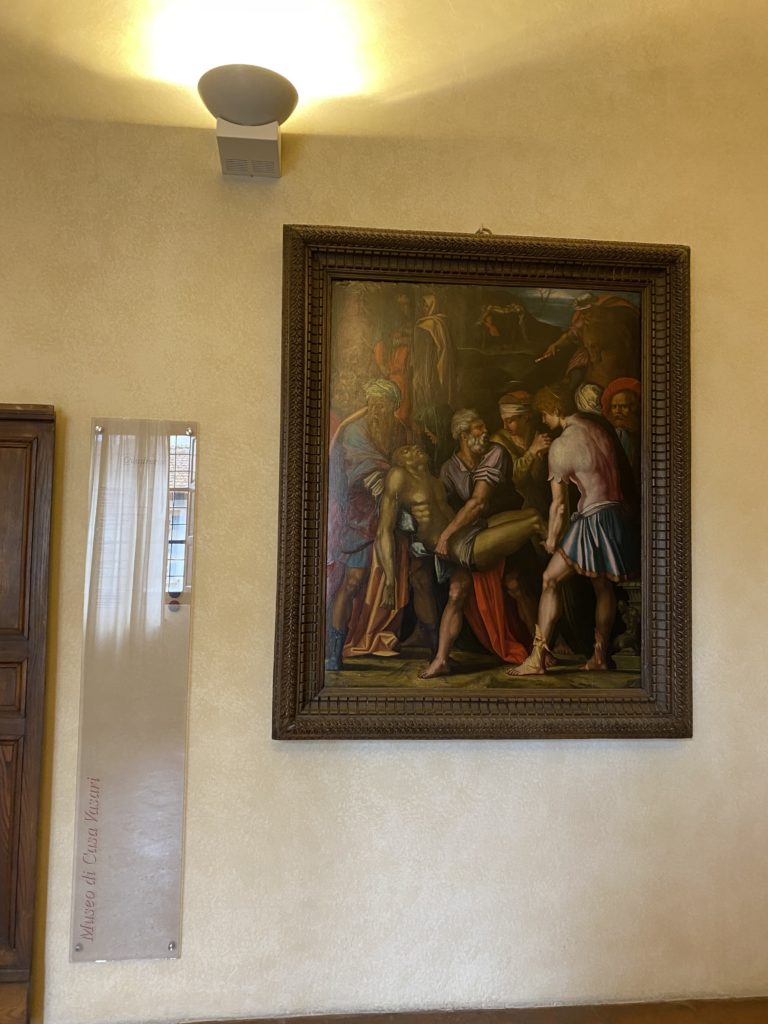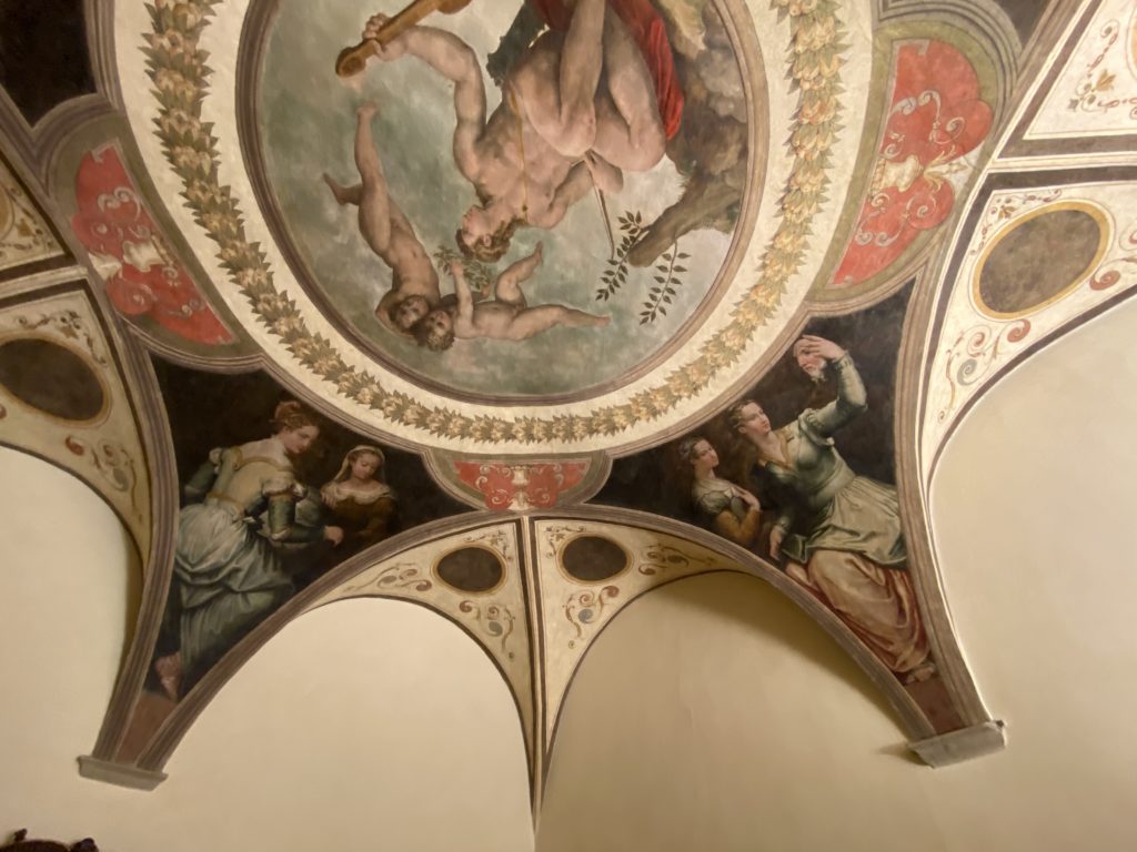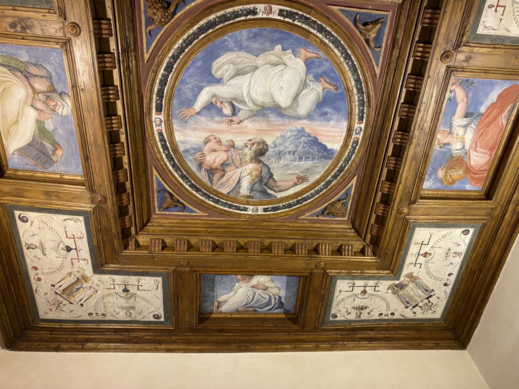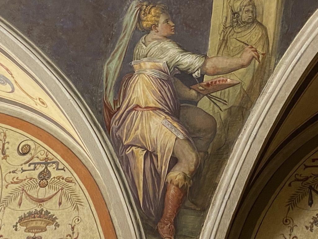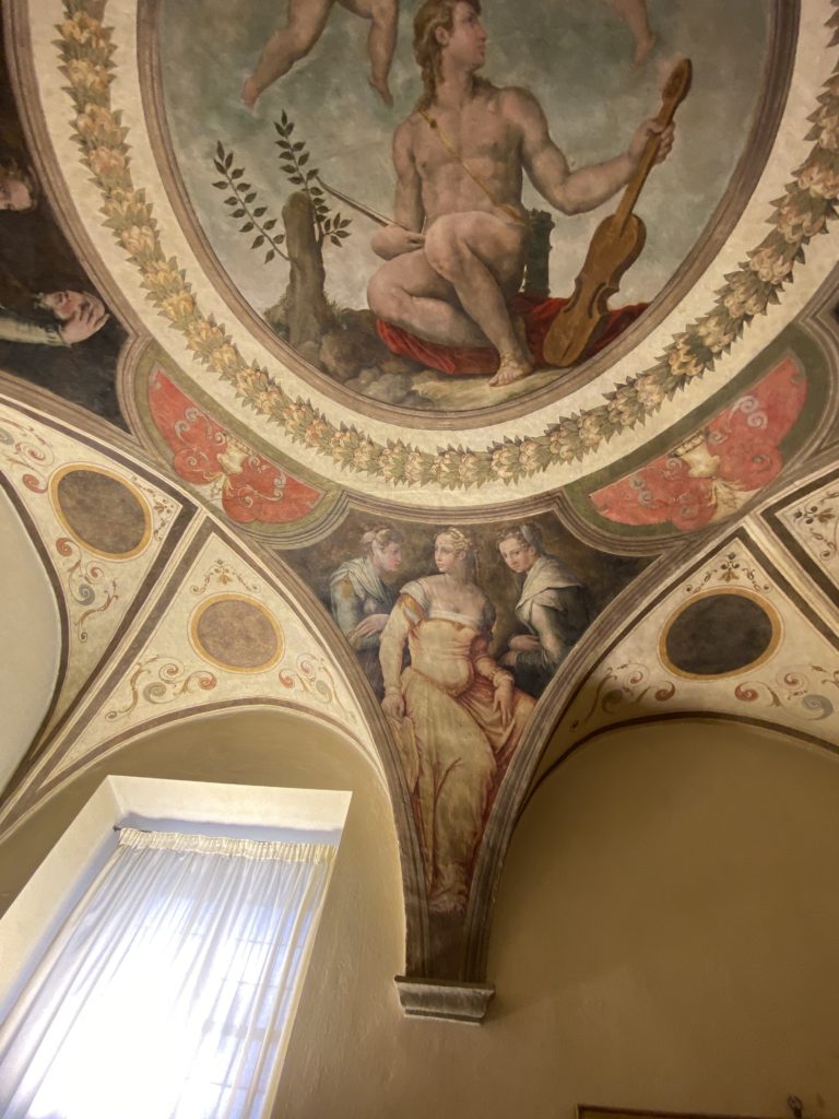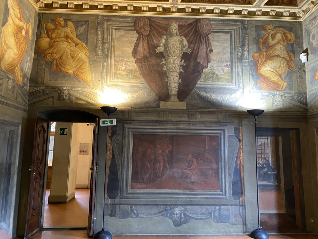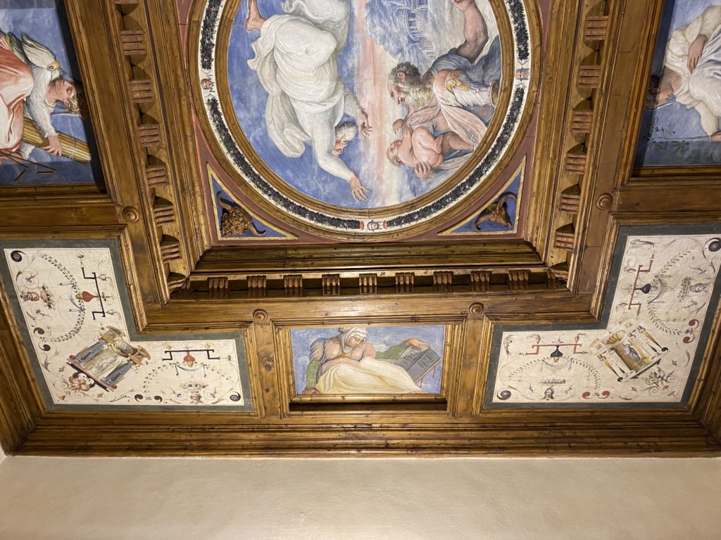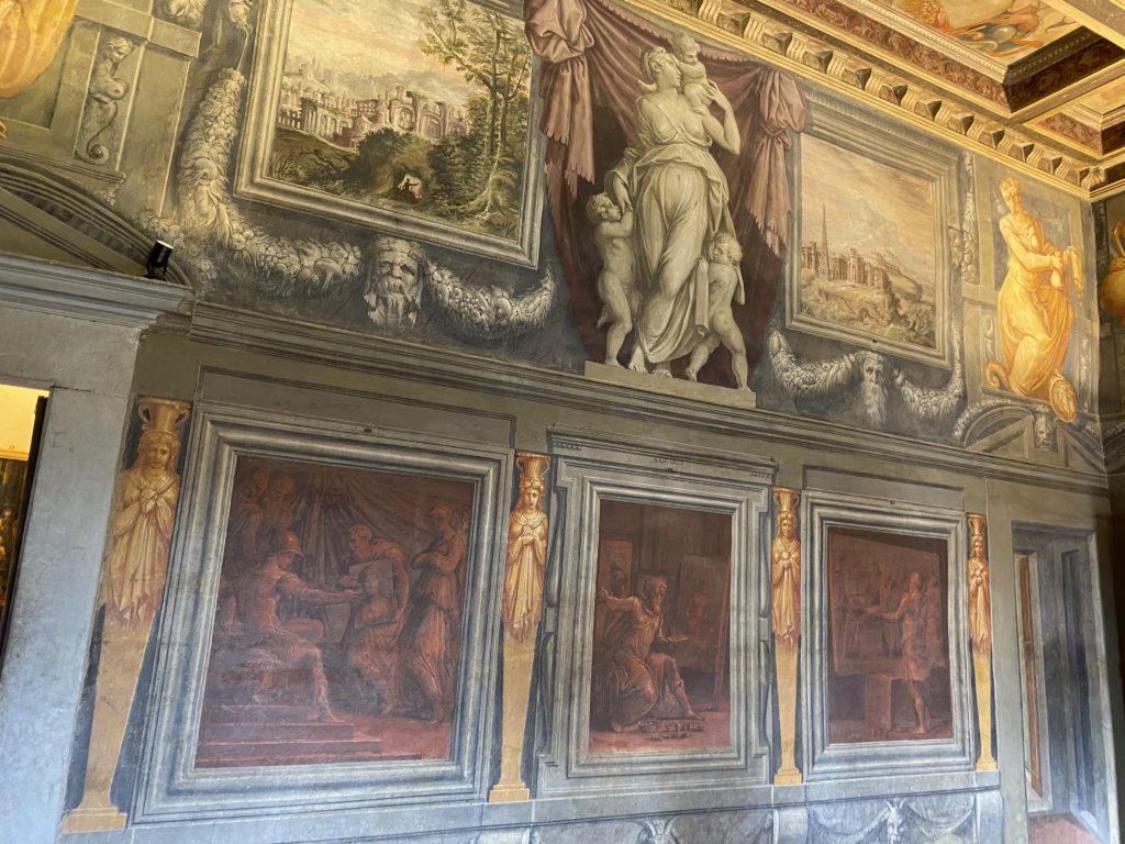 Nel borgo di San Vito la casa di Giorgio Vasari acquistata nel 1541, oggi sede museale dell’impronta visiva pittorica lasciata dall’artista. Costruita su tre piani la casa, organizzata per la servitù al primo e secondo piano. L’ultimo piano nobile la sua dimora privata. Intorno all’edificio un giardino all’italiana, rinascimentale, geometrico con siepi e una veduta sul borgo di Arezzo. Le decorazioni pittoriche della casa sono state realizzate da Vasari attento a celebrare e a evidenziare i simboli iconografici del proprio tempo con il contributo anche dei suoi amici aretini. Architetto, storico dell’arte e pittore, Giorgio Vasari affresca così le stanze a partire dal 1542. Il gusto manierista è visibile soprattutto nella quadreria con circa sessanta dipinti eseguiti da lui e dai suoi collaboratori. Al piano nobile, tramite una scalinata, con il busto di Vasari, si entra nella stanza del camino. L’artista affresca il luogo a partire dal 1548 con i temi: “Cacciata dell’Invidia” e della “Fortuna” da parte delle Virtù. La visione di questa pittura metafora della vita è nel soffitto a cassettone e nelle pareti appunto con figure allegoriche, paesaggi, storie eroiche dell’antichità, poi la “Cappellina” con la Madonna e Fra Paolino e il pavimento in maiolica del XVI secolo. Il tardo manierismo è presente nel corridoio con le sue visioni apocalittiche. La camera nuziale con il soffitto decorato da Vasari di Abramo tra le immagini del mondo, della “Pace”, la “Concordia”, le “Virtù” e la “Modestia”. La “Camera di Apollo” fu affrescata dall’artista è rappresenta Apollo e le nove muse con l’allegoria dell’amore, il ritratto della moglie Nicolosa Bacci. Nella camera della “Fama”, Vasari dipinse nel soffitto appunto il suo intendimento sulla “Fama” e nei peducci e lunette le quattro arti, il suo ritratto e degli artisti aretini: Signorelli, Della Gatta, Spinello, Aretino con Michelangelo e Andrea del Sarto. I contenuti allegorici e pittorici, la consistente visione continua e avvolgente della cosmologia dei miti antichi attualizzati, la narrazione insita dell’affresco, la visione manierista di un mondo bucolico e possibile per averlo vicino e condividerlo, fanno di Vasari un attento studioso e documentarista che attinge le sue conoscenze ai testi antichi per realizzare uno scenario così inedito e dettagliato nelle ragioni che afferma, esclusivo di una pittura commemorative e manierista che non ha eguali. Pitture murali sulle volte e sulle pareti, dipinti su tavola che Vasari realizza a più riprese nella sua abitazione decorata che vivacizza il suo pensiero e lo tiene costantemente aperto alla bellezza e al sogno dell’arte senza barriere.