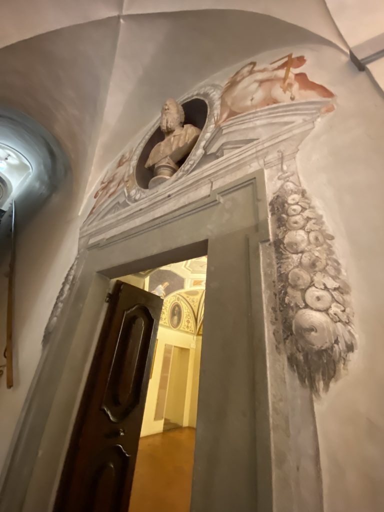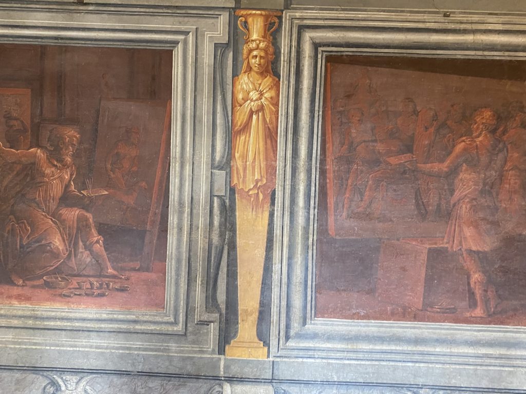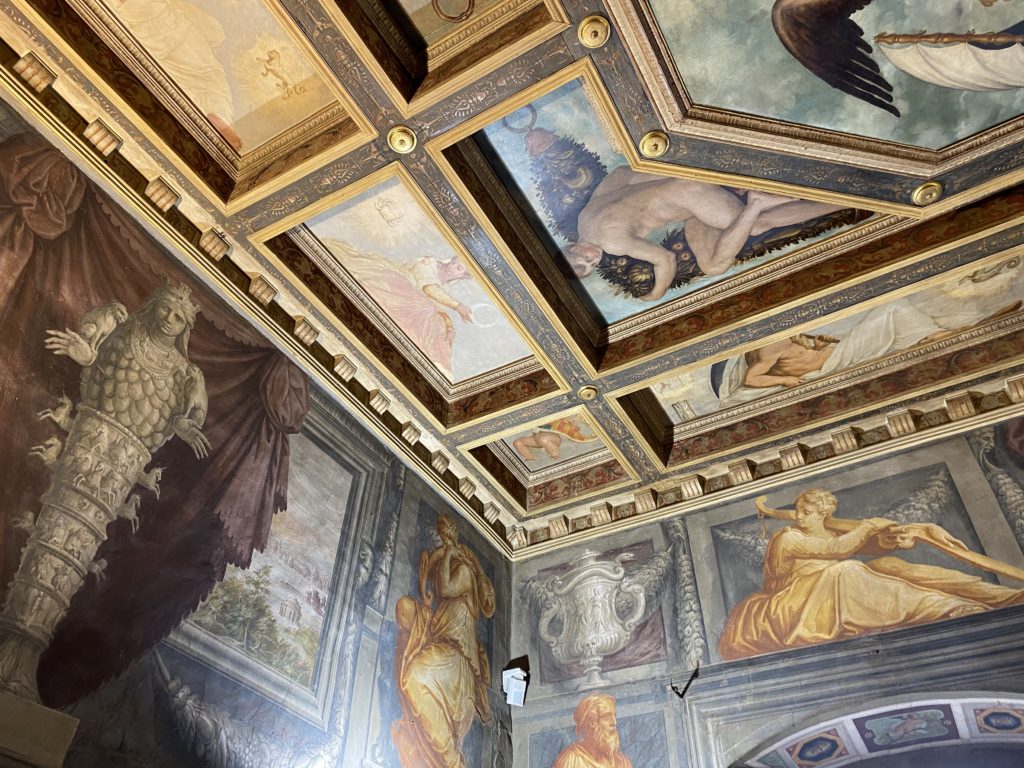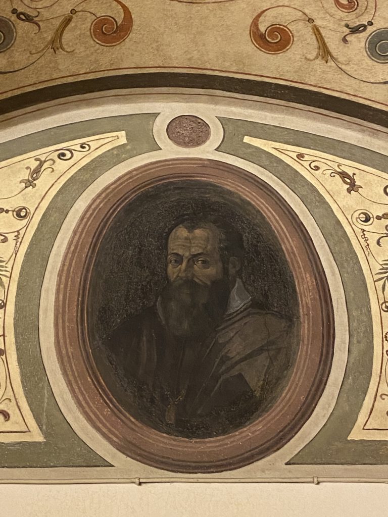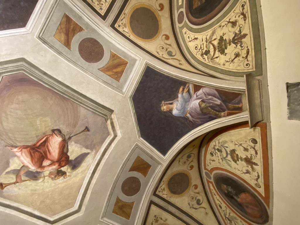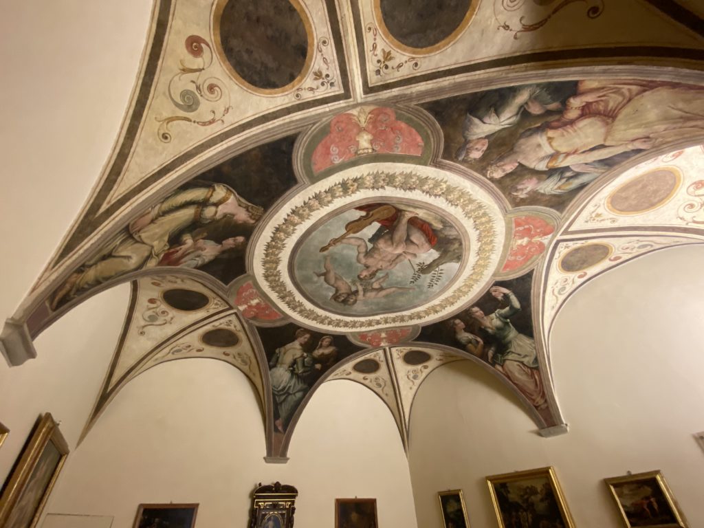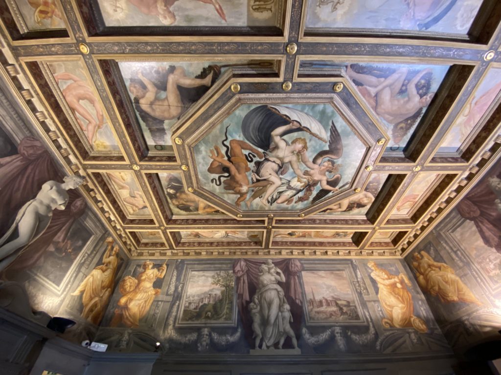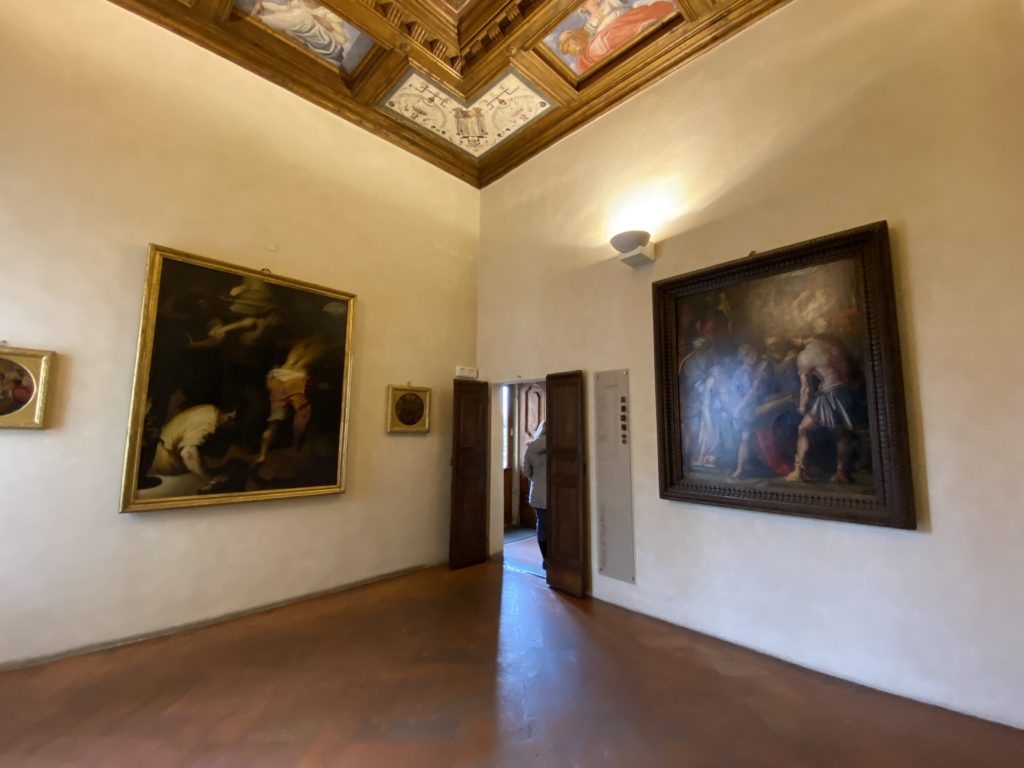 Nel borgo di San Vito la casa di Giorgio Vasari acquistata nel 1541, oggi sede museale dell’impronta visiva pittorica lasciata dall’artista. Costruita su tre piani la casa, organizzata per la servitù al primo e secondo piano. L’ultimo piano nobile la sua dimora privata. Intorno all’edificio un giardino all’italiana, rinascimentale, geometrico con siepi e una veduta sul borgo di Arezzo. Le decorazioni pittoriche della casa sono state realizzate da Vasari attento a celebrare e a evidenziare i simboli iconografici del proprio tempo con il contributo anche dei suoi amici aretini. Architetto, storico dell’arte e pittore, Giorgio Vasari affresca così le stanze a partire dal 1542. Il gusto manierista è visibile soprattutto nella quadreria con circa sessanta dipinti eseguiti da lui e dai suoi collaboratori. Al piano nobile, tramite una scalinata, con il busto di Vasari, si entra nella stanza del camino. L’artista affresca il luogo a partire dal 1548 con i temi: “Cacciata dell’Invidia” e della “Fortuna” da parte delle Virtù. La visione di questa pittura metafora della vita è nel soffitto a cassettone e nelle pareti appunto con figure allegoriche, paesaggi, storie eroiche dell’antichità, poi la “Cappellina” con la Madonna e Fra Paolino e il pavimento in maiolica del XVI secolo. Il tardo manierismo è presente nel corridoio con le sue visioni apocalittiche. La camera nuziale con il soffitto decorato da Vasari di Abramo tra le immagini del mondo, della “Pace”, la “Concordia”, le “Virtù” e la “Modestia”. La “Camera di Apollo” fu affrescata dall’artista è rappresenta Apollo e le nove muse con l’allegoria dell’amore, il ritratto della moglie Nicolosa Bacci. Nella camera della “Fama”, Vasari dipinse nel soffitto appunto il suo intendimento sulla “Fama” e nei peducci e lunette le quattro arti, il suo ritratto e degli artisti aretini: Signorelli, Della Gatta, Spinello, Aretino con Michelangelo e Andrea del Sarto. I contenuti allegorici e pittorici, la consistente visione continua e avvolgente della cosmologia dei miti antichi attualizzati, la narrazione insita dell’affresco, la visione manierista di un mondo bucolico e possibile per averlo vicino e condividerlo, fanno di Vasari un attento studioso e documentarista che attinge le sue conoscenze ai testi antichi per realizzare uno scenario così inedito e dettagliato nelle ragioni che afferma, esclusivo di una pittura commemorative e manierista che non ha eguali. Pitture murali sulle volte e sulle pareti, dipinti su tavola che Vasari realizza a più riprese nella sua abitazione decorata che vivacizza il suo pensiero e lo tiene costantemente aperto alla bellezza e al sogno dell’arte senza barriere.