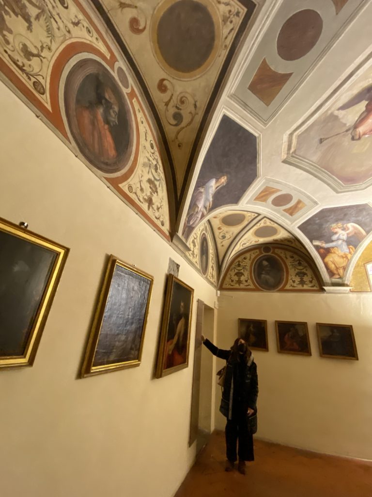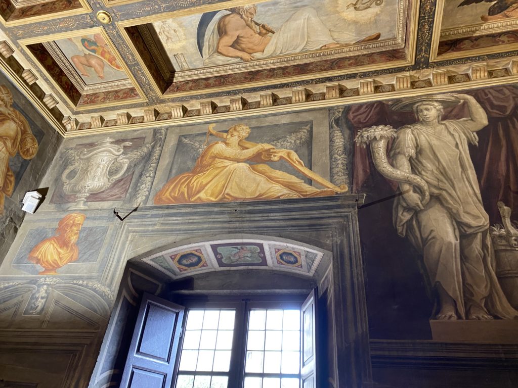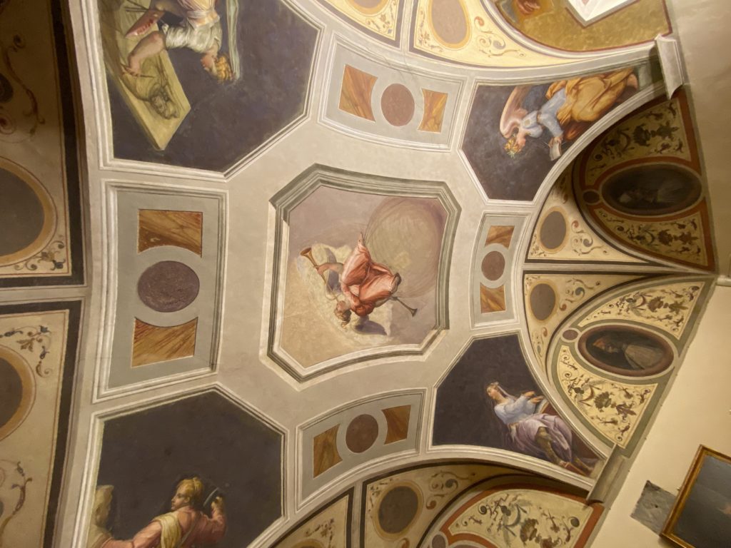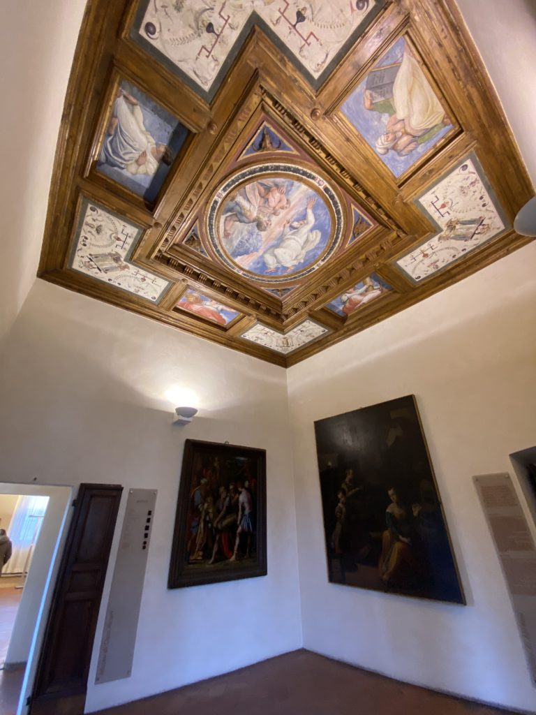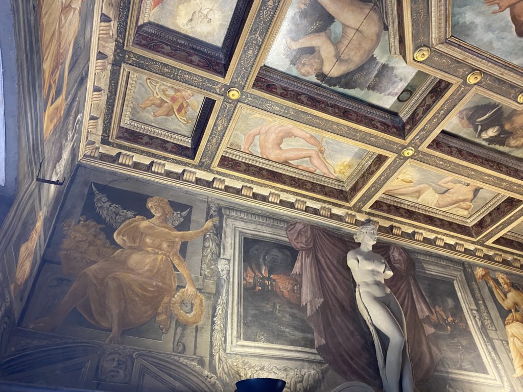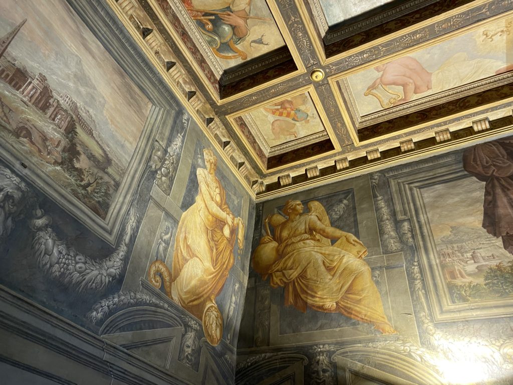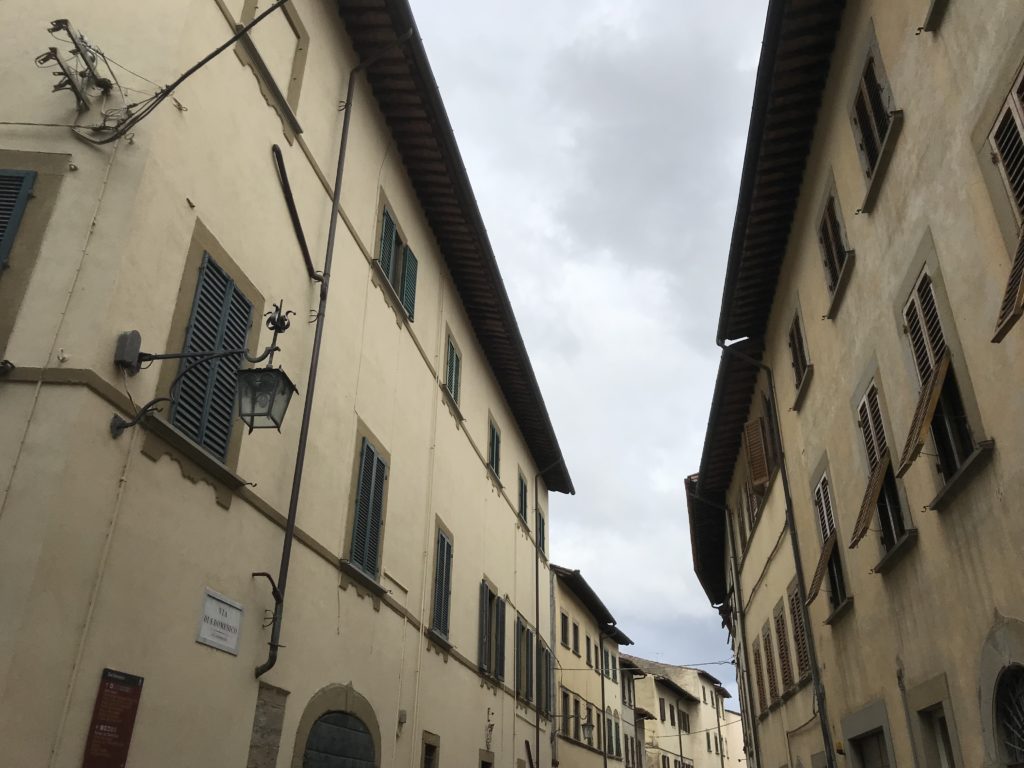 Nel borgo di San Vito la casa di Giorgio Vasari acquistata nel 1541, oggi sede museale dell’impronta visiva pittorica lasciata dall’artista. Costruita su tre piani la casa, organizzata per la servitù al primo e secondo piano. L’ultimo piano nobile la sua dimora privata. Intorno all’edificio un giardino all’italiana, rinascimentale, geometrico con siepi e una veduta sul borgo di Arezzo. Le decorazioni pittoriche della casa sono state realizzate da Vasari attento a celebrare e a evidenziare i simboli iconografici del proprio tempo con il contributo anche dei suoi amici aretini. Architetto, storico dell’arte e pittore, Giorgio Vasari affresca così le stanze a partire dal 1542. Il gusto manierista è visibile soprattutto nella quadreria con circa sessanta dipinti eseguiti da lui e dai suoi collaboratori. Al piano nobile, tramite una scalinata, con il busto di Vasari, si entra nella stanza del camino. L’artista affresca il luogo a partire dal 1548 con i temi: “Cacciata dell’Invidia” e della “Fortuna” da parte delle Virtù. La visione di questa pittura metafora della vita è nel soffitto a cassettone e nelle pareti appunto con figure allegoriche, paesaggi, storie eroiche dell’antichità, poi la “Cappellina” con la Madonna e Fra Paolino e il pavimento in maiolica del XVI secolo. Il tardo manierismo è presente nel corridoio con le sue visioni apocalittiche. La camera nuziale con il soffitto decorato da Vasari di Abramo tra le immagini del mondo, della “Pace”, la “Concordia”, le “Virtù” e la “Modestia”. La “Camera di Apollo” fu affrescata dall’artista è rappresenta Apollo e le nove muse con l’allegoria dell’amore, il ritratto della moglie Nicolosa Bacci. Nella camera della “Fama”, Vasari dipinse nel soffitto appunto il suo intendimento sulla “Fama” e nei peducci e lunette le quattro arti, il suo ritratto e degli artisti aretini: Signorelli, Della Gatta, Spinello, Aretino con Michelangelo e Andrea del Sarto. I contenuti allegorici e pittorici, la consistente visione continua e avvolgente della cosmologia dei miti antichi attualizzati, la narrazione insita dell’affresco, la visione manierista di un mondo bucolico e possibile per averlo vicino e condividerlo, fanno di Vasari un attento studioso e documentarista che attinge le sue conoscenze ai testi antichi per realizzare uno scenario così inedito e dettagliato nelle ragioni che afferma, esclusivo di una pittura commemorative e manierista che non ha eguali. Pitture murali sulle volte e sulle pareti, dipinti su tavola che Vasari realizza a più riprese nella sua abitazione decorata che vivacizza il suo pensiero e lo tiene costantemente aperto alla bellezza e al sogno dell’arte senza barriere.