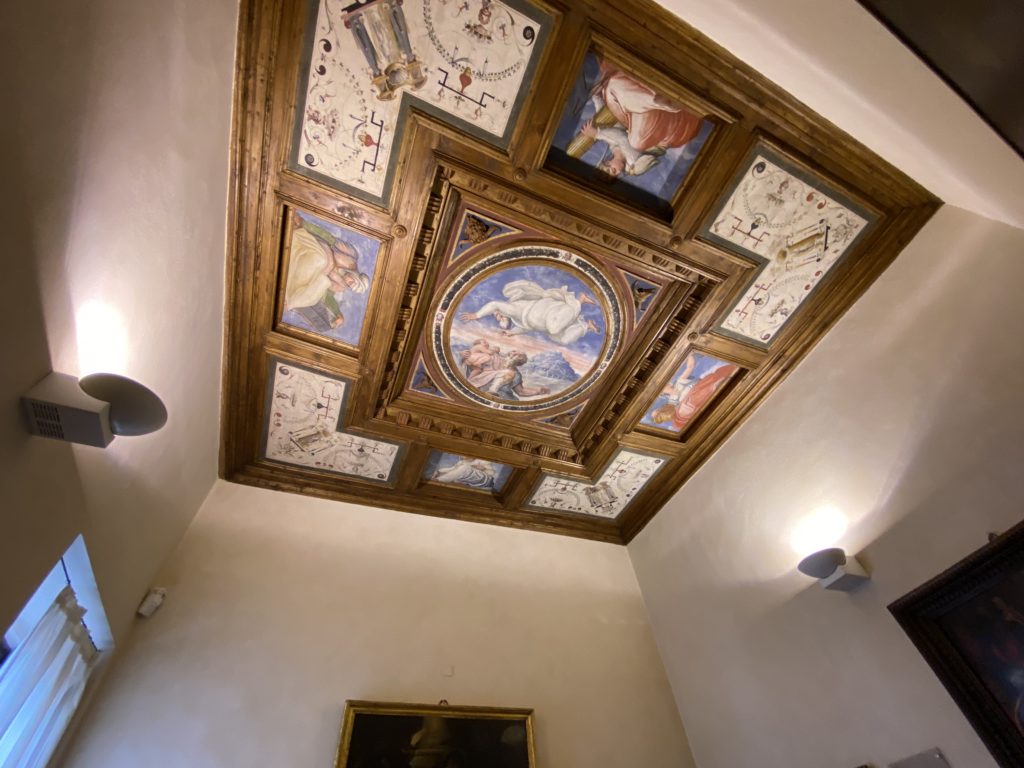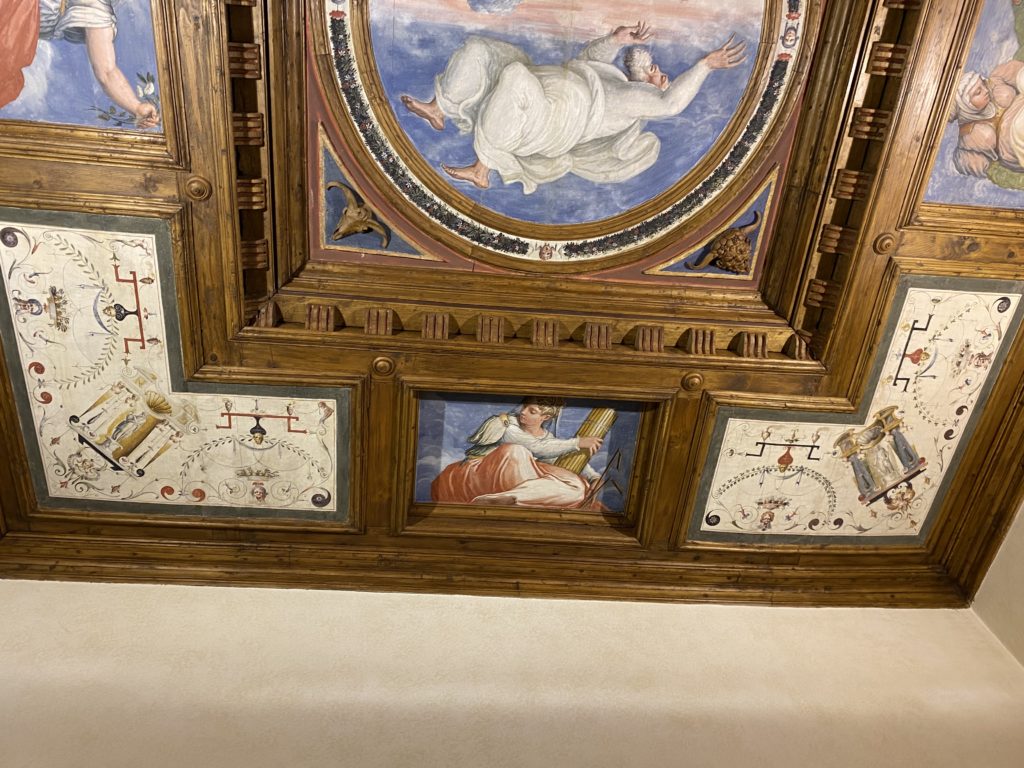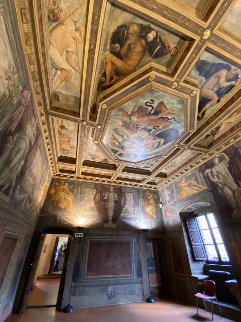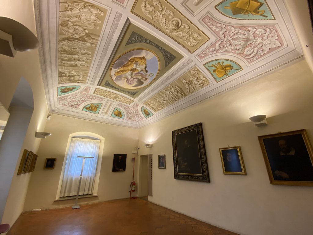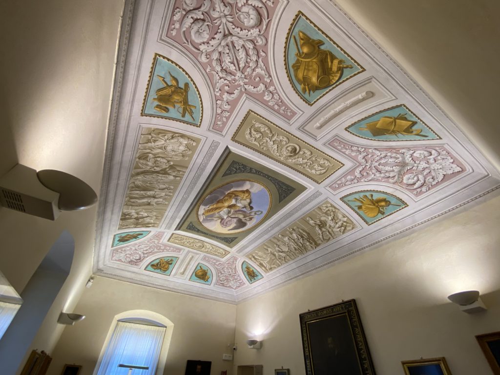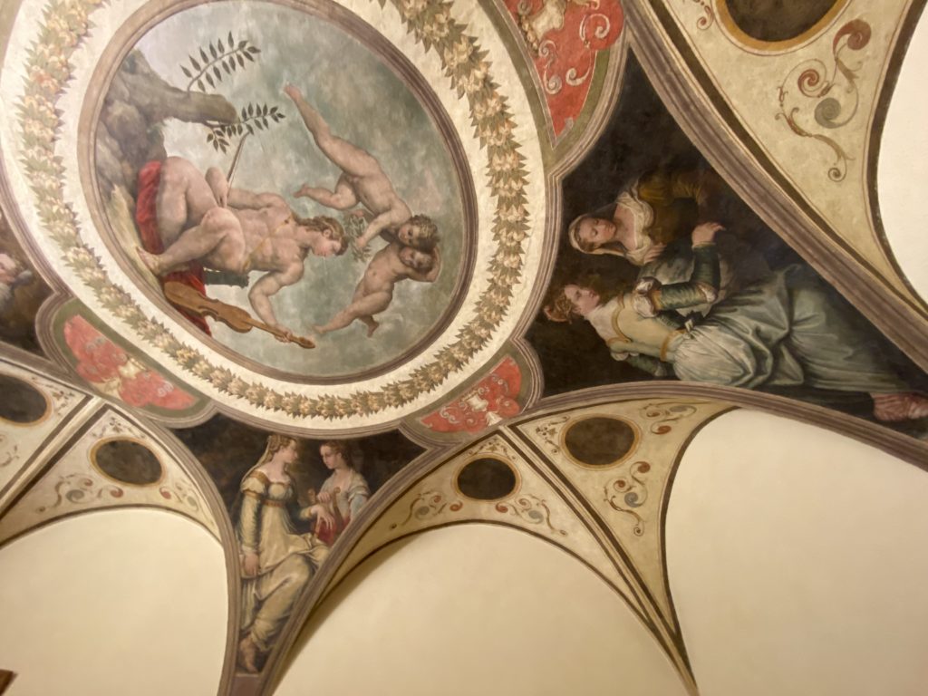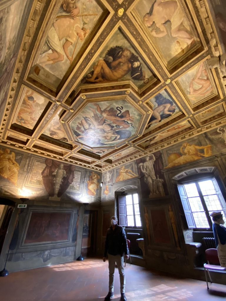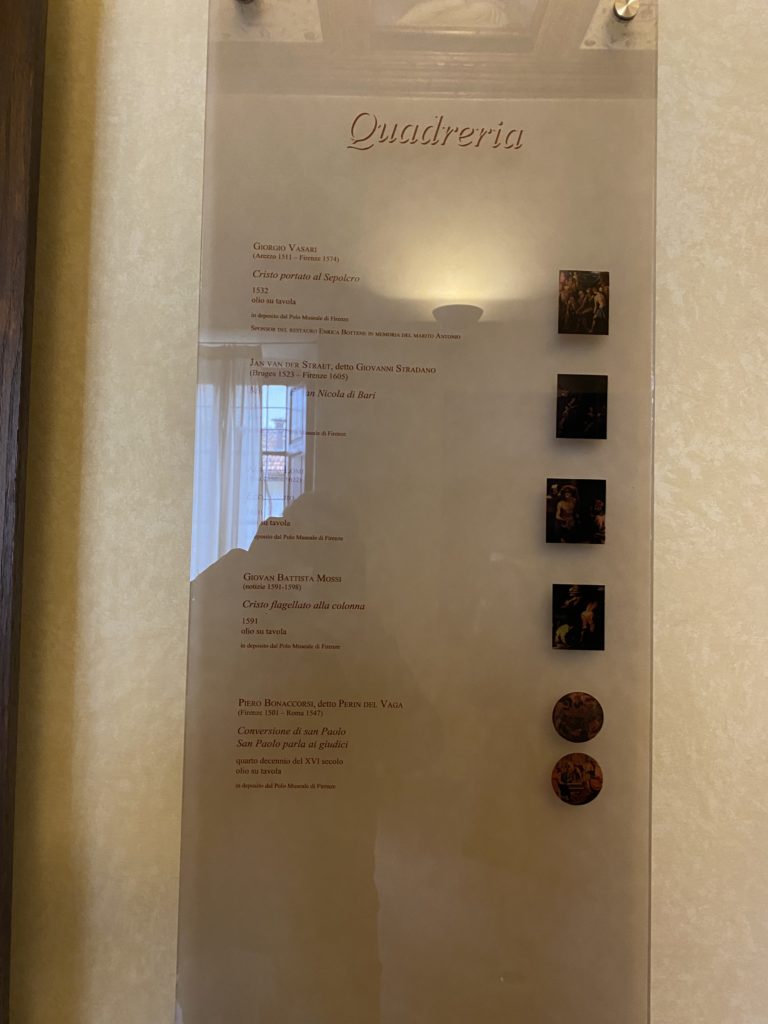 Nel borgo di San Vito la casa di Giorgio Vasari acquistata nel 1541, oggi sede museale dell’impronta visiva pittorica lasciata dall’artista. Costruita su tre piani la casa, organizzata per la servitù al primo e secondo piano. L’ultimo piano nobile la sua dimora privata. Intorno all’edificio un giardino all’italiana, rinascimentale, geometrico con siepi e una veduta sul borgo di Arezzo. Le decorazioni pittoriche della casa sono state realizzate da Vasari attento a celebrare e a evidenziare i simboli iconografici del proprio tempo con il contributo anche dei suoi amici aretini. Architetto, storico dell’arte e pittore, Giorgio Vasari affresca così le stanze a partire dal 1542. Il gusto manierista è visibile soprattutto nella quadreria con circa sessanta dipinti eseguiti da lui e dai suoi collaboratori. Al piano nobile, tramite una scalinata, con il busto di Vasari, si entra nella stanza del camino. L’artista affresca il luogo a partire dal 1548 con i temi: “Cacciata dell’Invidia” e della “Fortuna” da parte delle Virtù. La visione di questa pittura metafora della vita è nel soffitto a cassettone e nelle pareti appunto con figure allegoriche, paesaggi, storie eroiche dell’antichità, poi la “Cappellina” con la Madonna e Fra Paolino e il pavimento in maiolica del XVI secolo. Il tardo manierismo è presente nel corridoio con le sue visioni apocalittiche. La camera nuziale con il soffitto decorato da Vasari di Abramo tra le immagini del mondo, della “Pace”, la “Concordia”, le “Virtù” e la “Modestia”. La “Camera di Apollo” fu affrescata dall’artista è rappresenta Apollo e le nove muse con l’allegoria dell’amore, il ritratto della moglie Nicolosa Bacci. Nella camera della “Fama”, Vasari dipinse nel soffitto appunto il suo intendimento sulla “Fama” e nei peducci e lunette le quattro arti, il suo ritratto e degli artisti aretini: Signorelli, Della Gatta, Spinello, Aretino con Michelangelo e Andrea del Sarto. I contenuti allegorici e pittorici, la consistente visione continua e avvolgente della cosmologia dei miti antichi attualizzati, la narrazione insita dell’affresco, la visione manierista di un mondo bucolico e possibile per averlo vicino e condividerlo, fanno di Vasari un attento studioso e documentarista che attinge le sue conoscenze ai testi antichi per realizzare uno scenario così inedito e dettagliato nelle ragioni che afferma, esclusivo di una pittura commemorative e manierista che non ha eguali. Pitture murali sulle volte e sulle pareti, dipinti su tavola che Vasari realizza a più riprese nella sua abitazione decorata che vivacizza il suo pensiero e lo tiene costantemente aperto alla bellezza e al sogno dell’arte senza barriere.