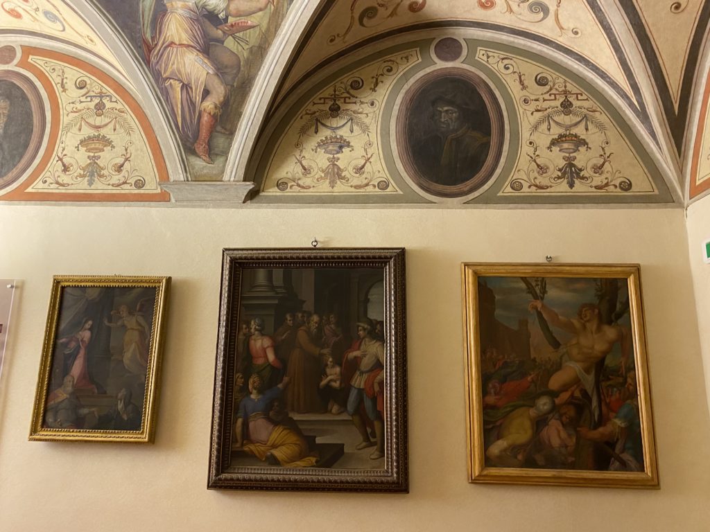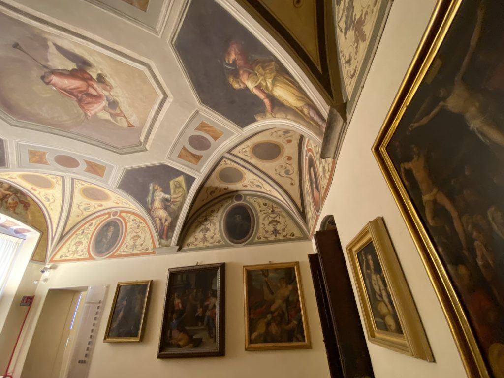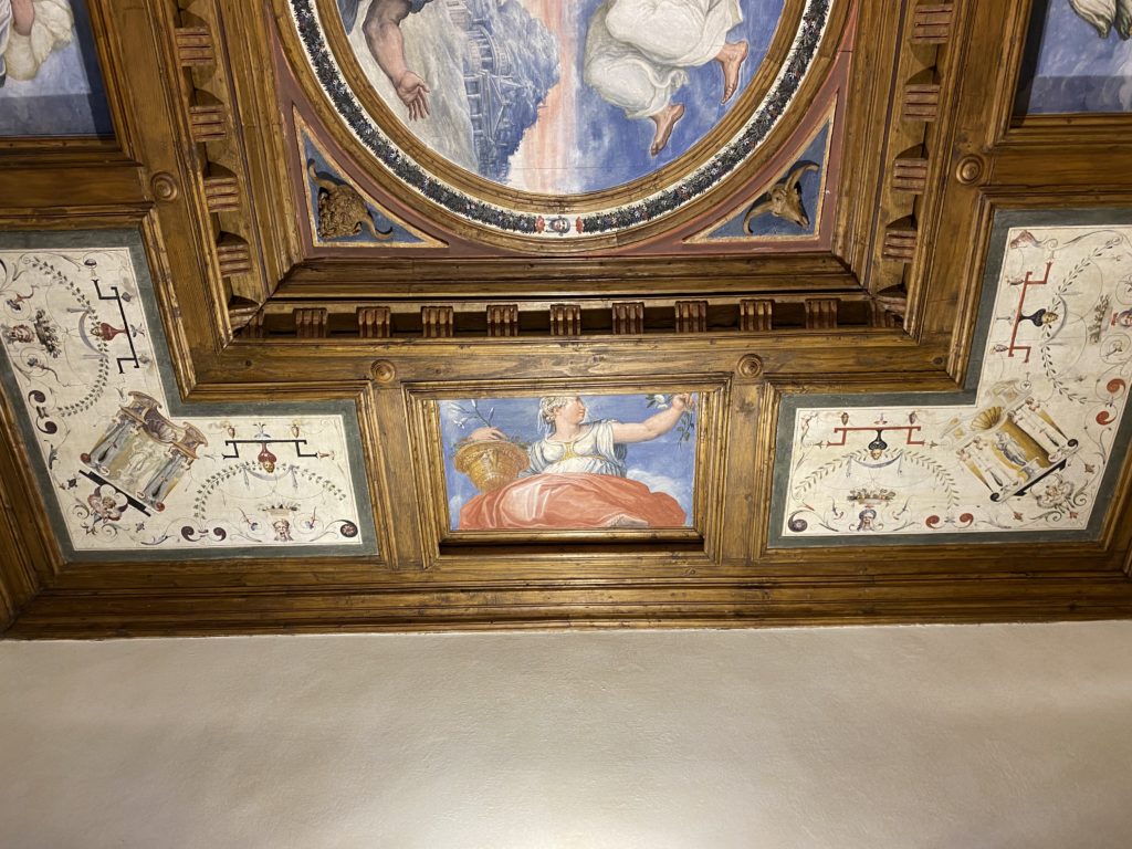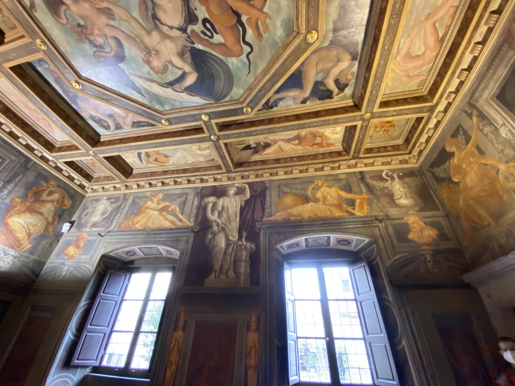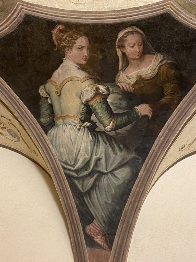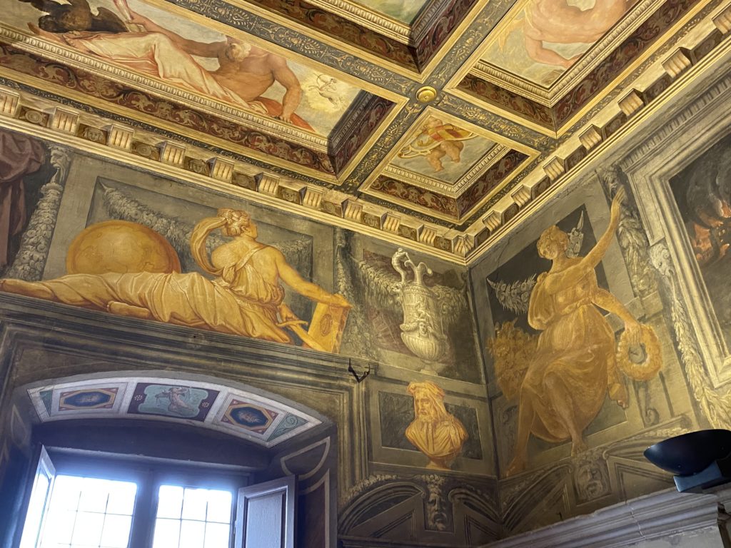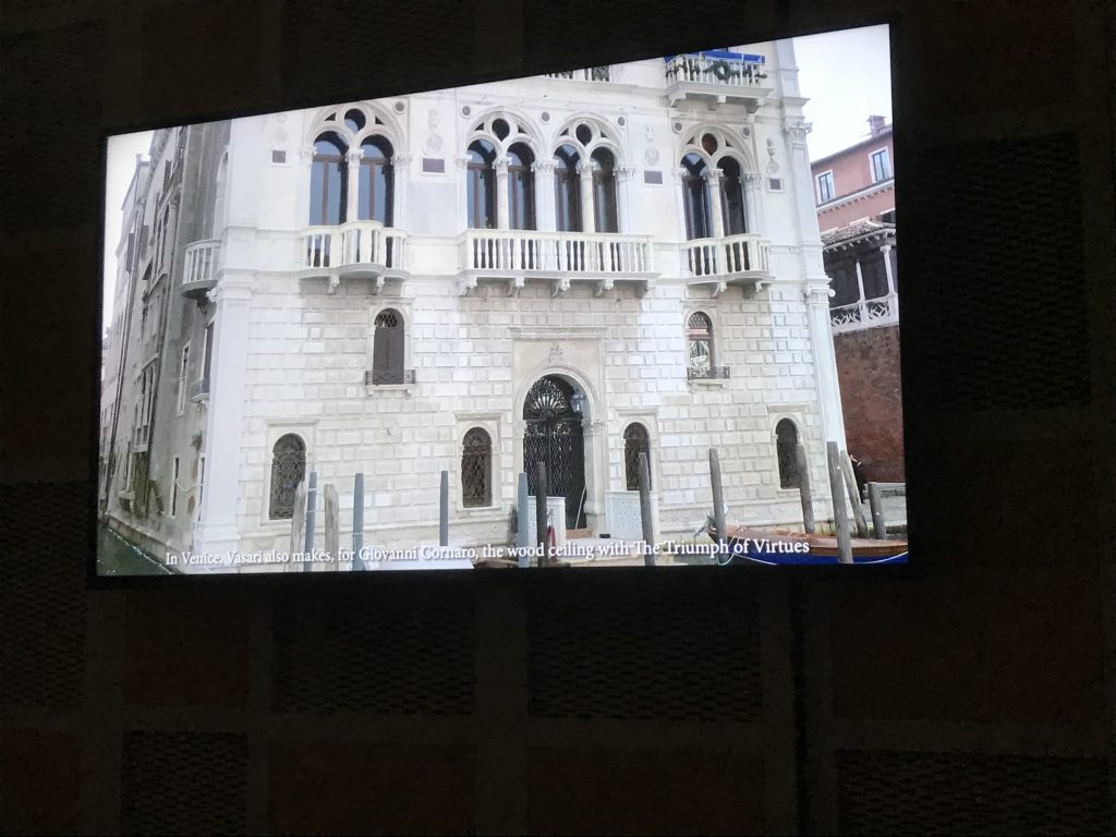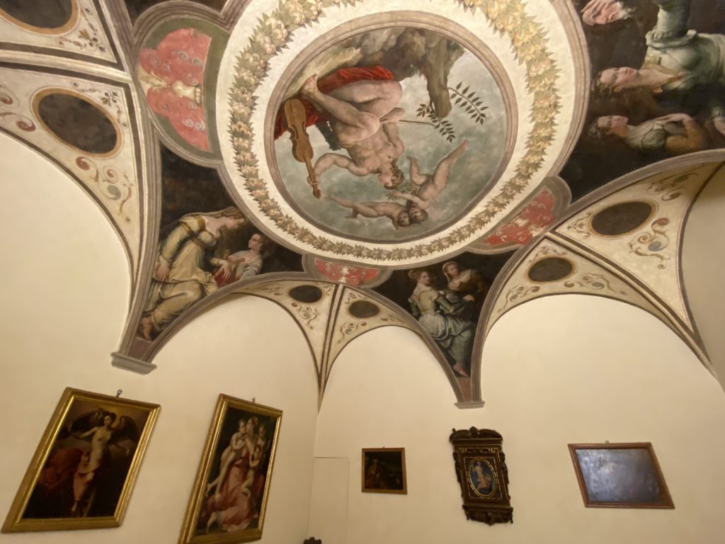Nel borgo di San Vito la casa di Giorgio Vasari acquistata nel 1541, oggi sede museale dell’impronta visiva pittorica lasciata dall’artista. Costruita su tre piani la casa, organizzata per la servitù al primo e secondo piano. L’ultimo piano nobile la sua dimora privata. Intorno all’edificio un giardino all’italiana, rinascimentale, geometrico con siepi e una veduta sul borgo di Arezzo. Le decorazioni pittoriche della casa sono state realizzate da Vasari attento a celebrare e a evidenziare i simboli iconografici del proprio tempo con il contributo anche dei suoi amici aretini. Architetto, storico dell’arte e pittore, Giorgio Vasari affresca così le stanze a partire dal 1542. Il gusto manierista è visibile soprattutto nella quadreria con circa sessanta dipinti eseguiti da lui e dai suoi collaboratori. Al piano nobile, tramite una scalinata, con il busto di Vasari, si entra nella stanza del camino. L’artista affresca il luogo a partire dal 1548 con i temi: “Cacciata dell’Invidia” e della “Fortuna” da parte delle Virtù. La visione di questa pittura metafora della vita è nel soffitto a cassettone e nelle pareti appunto con figure allegoriche, paesaggi, storie eroiche dell’antichità, poi la “Cappellina” con la Madonna e Fra Paolino e il pavimento in maiolica del XVI secolo. Il tardo manierismo è presente nel corridoio con le sue visioni apocalittiche. La camera nuziale con il soffitto decorato da Vasari di Abramo tra le immagini del mondo, della “Pace”, la “Concordia”, le “Virtù” e la “Modestia”. La “Camera di Apollo” fu affrescata dall’artista è rappresenta Apollo e le nove muse con l’allegoria dell’amore, il ritratto della moglie Nicolosa Bacci. Nella camera della “Fama”, Vasari dipinse nel soffitto appunto il suo intendimento sulla “Fama” e nei peducci e lunette le quattro arti, il suo ritratto e degli artisti aretini: Signorelli, Della Gatta, Spinello, Aretino con Michelangelo e Andrea del Sarto. I contenuti allegorici e pittorici, la consistente visione continua e avvolgente della cosmologia dei miti antichi attualizzati, la narrazione insita dell’affresco, la visione manierista di un mondo bucolico e possibile per averlo vicino e condividerlo, fanno di Vasari un attento studioso e documentarista che attinge le sue conoscenze ai testi antichi per realizzare uno scenario così inedito e dettagliato nelle ragioni che afferma, esclusivo di una pittura commemorative e manierista che non ha eguali. Pitture murali sulle volte e sulle pareti, dipinti su tavola che Vasari realizza a più riprese nella sua abitazione decorata che vivacizza il suo pensiero e lo tiene costantemente aperto alla bellezza e al sogno dell’arte senza barriere.