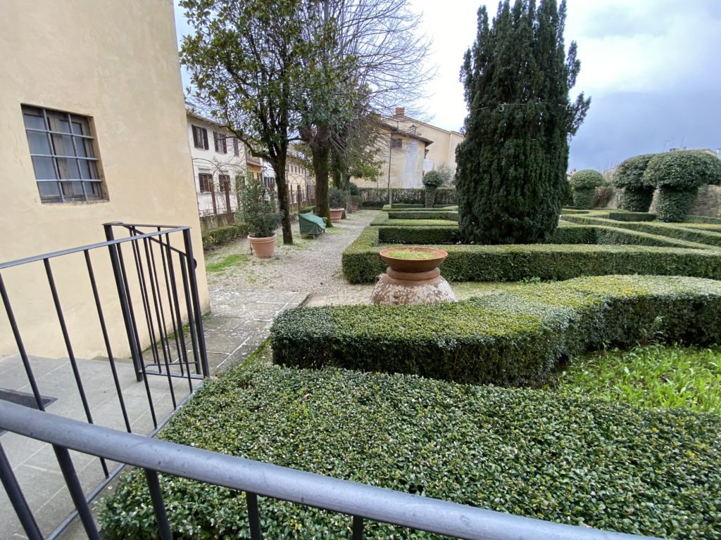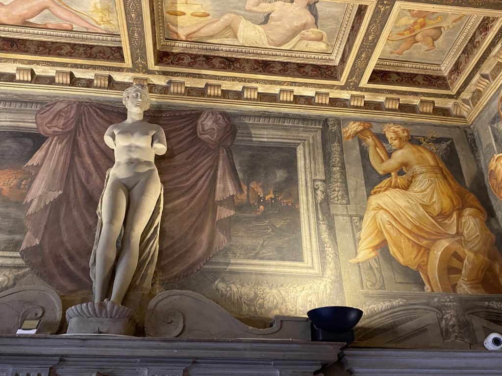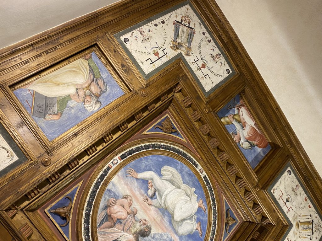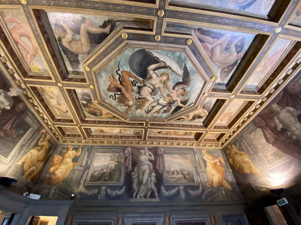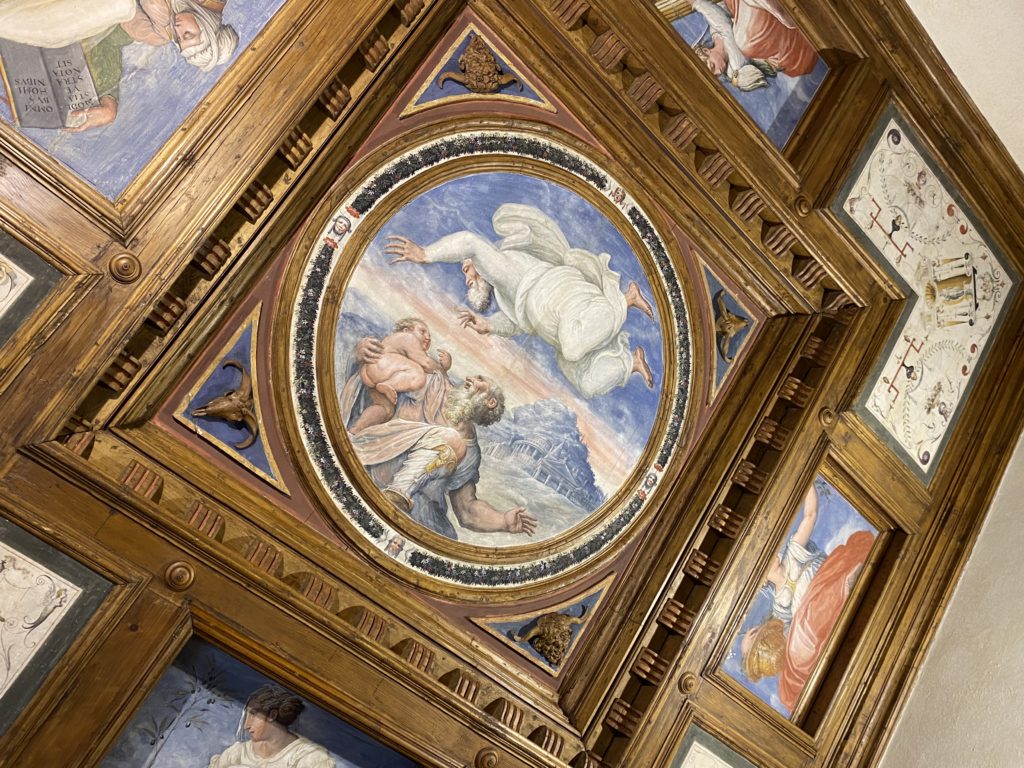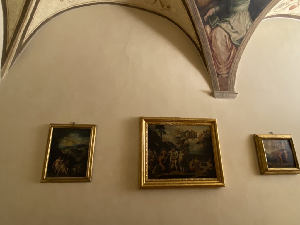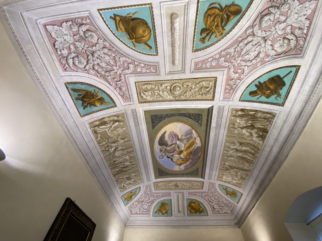 Nel borgo di San Vito la casa di Giorgio Vasari acquistata nel 1541, oggi sede museale dell’impronta visiva pittorica lasciata dall’artista. Costruita su tre piani la casa, organizzata per la servitù al primo e secondo piano. L’ultimo piano nobile la sua dimora privata. Intorno all’edificio un giardino all’italiana, rinascimentale, geometrico con siepi e una veduta sul borgo di Arezzo. Le decorazioni pittoriche della casa sono state realizzate da Vasari attento a celebrare e a evidenziare i simboli iconografici del proprio tempo con il contributo anche dei suoi amici aretini. Architetto, storico dell’arte e pittore, Giorgio Vasari affresca così le stanze a partire dal 1542. Il gusto manierista è visibile soprattutto nella quadreria con circa sessanta dipinti eseguiti da lui e dai suoi collaboratori. Al piano nobile, tramite una scalinata, con il busto di Vasari, si entra nella stanza del camino. L’artista affresca il luogo a partire dal 1548 con i temi: “Cacciata dell’Invidia” e della “Fortuna” da parte delle Virtù. La visione di questa pittura metafora della vita è nel soffitto a cassettone e nelle pareti appunto con figure allegoriche, paesaggi, storie eroiche dell’antichità, poi la “Cappellina” con la Madonna e Fra Paolino e il pavimento in maiolica del XVI secolo. Il tardo manierismo è presente nel corridoio con le sue visioni apocalittiche. La camera nuziale con il soffitto decorato da Vasari di Abramo tra le immagini del mondo, della “Pace”, la “Concordia”, le “Virtù” e la “Modestia”. La “Camera di Apollo” fu affrescata dall’artista è rappresenta Apollo e le nove muse con l’allegoria dell’amore, il ritratto della moglie Nicolosa Bacci. Nella camera della “Fama”, Vasari dipinse nel soffitto appunto il suo intendimento sulla “Fama” e nei peducci e lunette le quattro arti, il suo ritratto e degli artisti aretini: Signorelli, Della Gatta, Spinello, Aretino con Michelangelo e Andrea del Sarto. I contenuti allegorici e pittorici, la consistente visione continua e avvolgente della cosmologia dei miti antichi attualizzati, la narrazione insita dell’affresco, la visione manierista di un mondo bucolico e possibile per averlo vicino e condividerlo, fanno di Vasari un attento studioso e documentarista che attinge le sue conoscenze ai testi antichi per realizzare uno scenario così inedito e dettagliato nelle ragioni che afferma, esclusivo di una pittura commemorative e manierista che non ha eguali. Pitture murali sulle volte e sulle pareti, dipinti su tavola che Vasari realizza a più riprese nella sua abitazione decorata che vivacizza il suo pensiero e lo tiene costantemente aperto alla bellezza e al sogno dell’arte senza barriere.