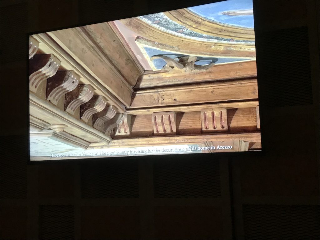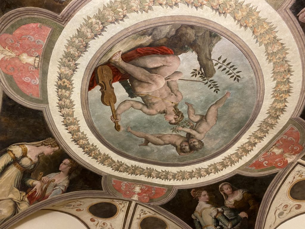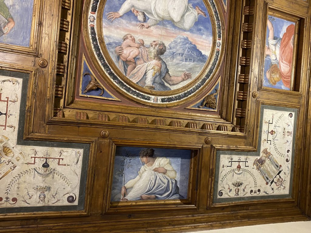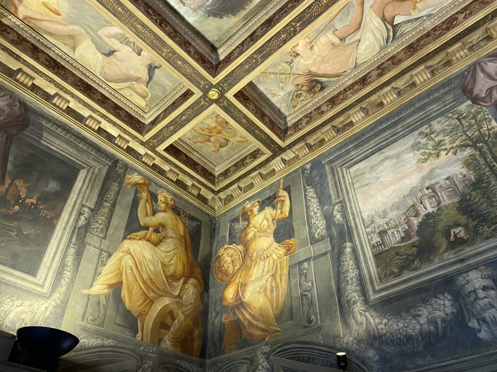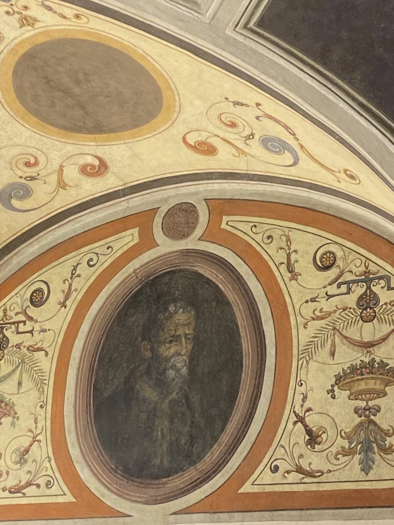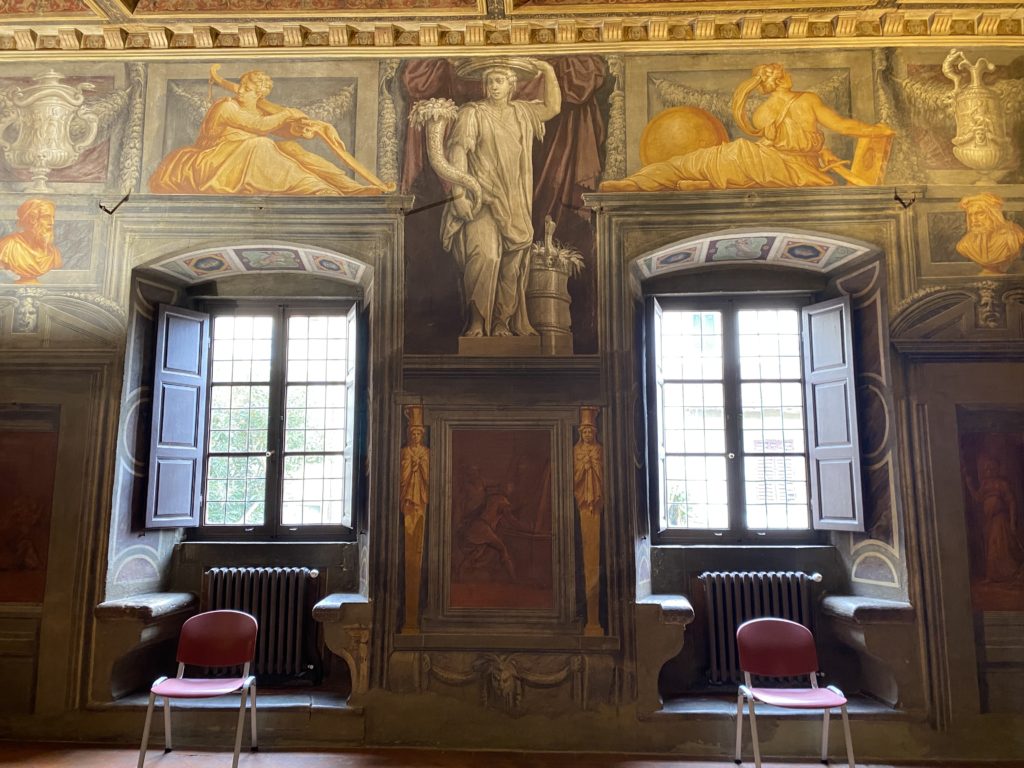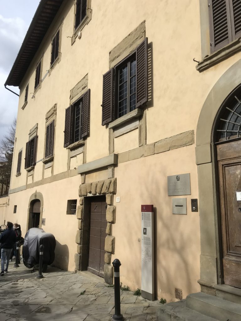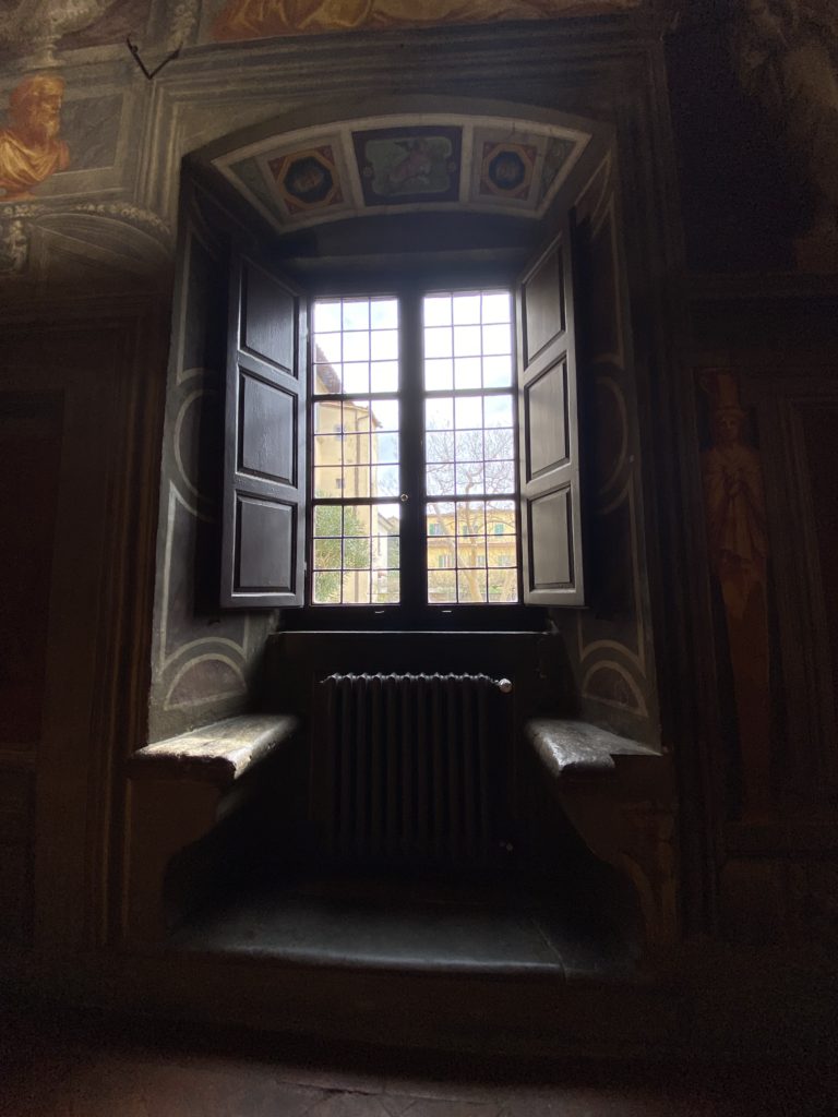 Nel borgo di San Vito la casa di Giorgio Vasari acquistata nel 1541, oggi sede museale dell’impronta visiva pittorica lasciata dall’artista. Costruita su tre piani la casa, organizzata per la servitù al primo e secondo piano. L’ultimo piano nobile la sua dimora privata. Intorno all’edificio un giardino all’italiana, rinascimentale, geometrico con siepi e una veduta sul borgo di Arezzo. Le decorazioni pittoriche della casa sono state realizzate da Vasari attento a celebrare e a evidenziare i simboli iconografici del proprio tempo con il contributo anche dei suoi amici aretini. Architetto, storico dell’arte e pittore, Giorgio Vasari affresca così le stanze a partire dal 1542. Il gusto manierista è visibile soprattutto nella quadreria con circa sessanta dipinti eseguiti da lui e dai suoi collaboratori. Al piano nobile, tramite una scalinata, con il busto di Vasari, si entra nella stanza del camino. L’artista affresca il luogo a partire dal 1548 con i temi: “Cacciata dell’Invidia” e della “Fortuna” da parte delle Virtù. La visione di questa pittura metafora della vita è nel soffitto a cassettone e nelle pareti appunto con figure allegoriche, paesaggi, storie eroiche dell’antichità, poi la “Cappellina” con la Madonna e Fra Paolino e il pavimento in maiolica del XVI secolo. Il tardo manierismo è presente nel corridoio con le sue visioni apocalittiche. La camera nuziale con il soffitto decorato da Vasari di Abramo tra le immagini del mondo, della “Pace”, la “Concordia”, le “Virtù” e la “Modestia”. La “Camera di Apollo” fu affrescata dall’artista è rappresenta Apollo e le nove muse con l’allegoria dell’amore, il ritratto della moglie Nicolosa Bacci. Nella camera della “Fama”, Vasari dipinse nel soffitto appunto il suo intendimento sulla “Fama” e nei peducci e lunette le quattro arti, il suo ritratto e degli artisti aretini: Signorelli, Della Gatta, Spinello, Aretino con Michelangelo e Andrea del Sarto. I contenuti allegorici e pittorici, la consistente visione continua e avvolgente della cosmologia dei miti antichi attualizzati, la narrazione insita dell’affresco, la visione manierista di un mondo bucolico e possibile per averlo vicino e condividerlo, fanno di Vasari un attento studioso e documentarista che attinge le sue conoscenze ai testi antichi per realizzare uno scenario così inedito e dettagliato nelle ragioni che afferma, esclusivo di una pittura commemorative e manierista che non ha eguali. Pitture murali sulle volte e sulle pareti, dipinti su tavola che Vasari realizza a più riprese nella sua abitazione decorata che vivacizza il suo pensiero e lo tiene costantemente aperto alla bellezza e al sogno dell’arte senza barriere.