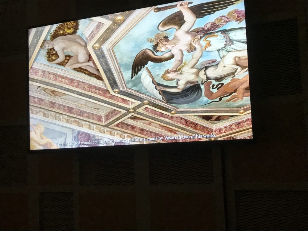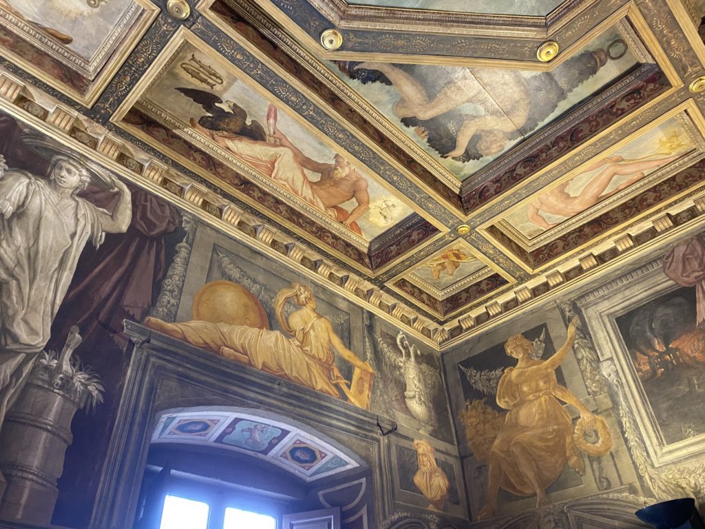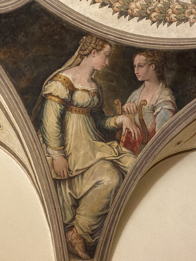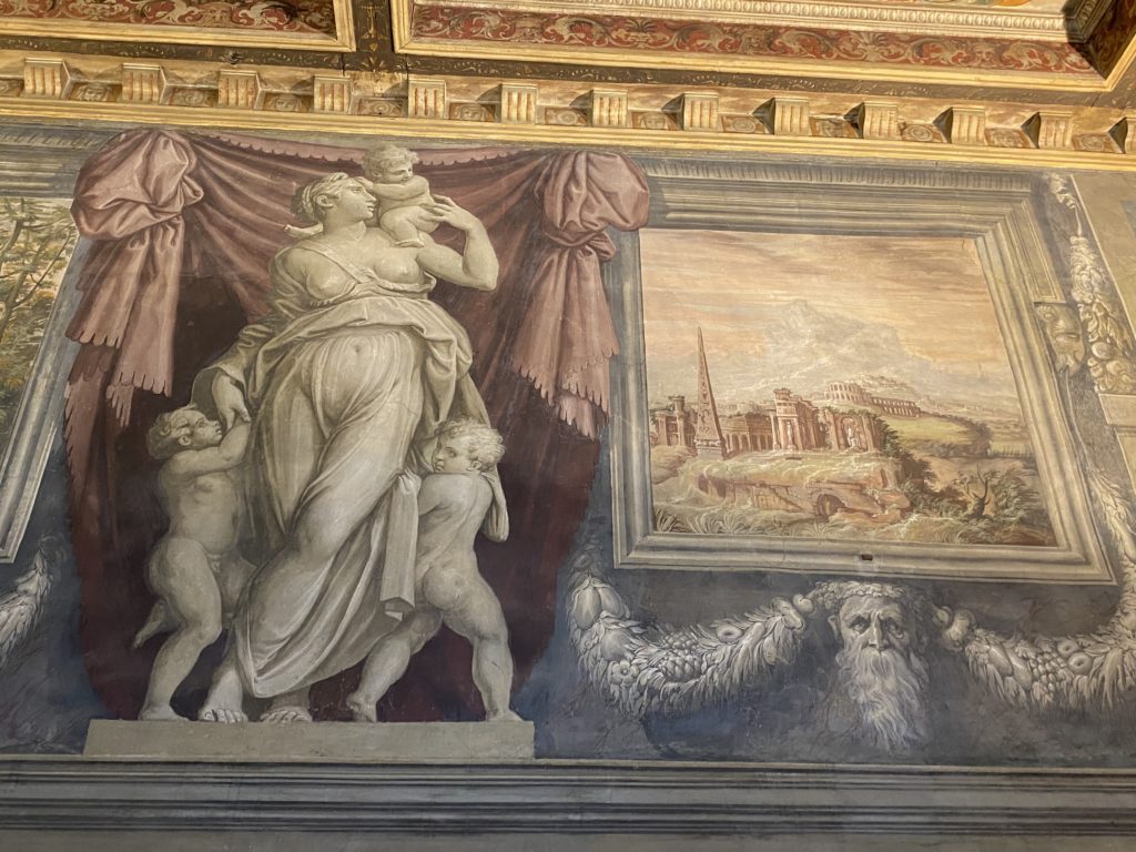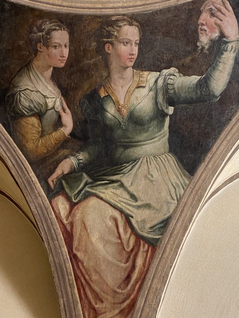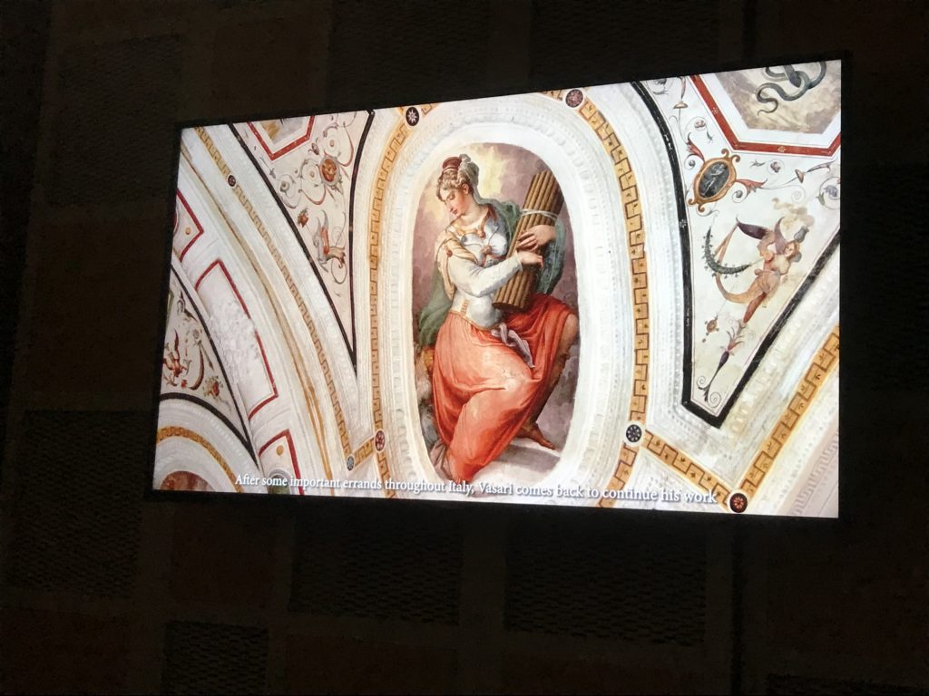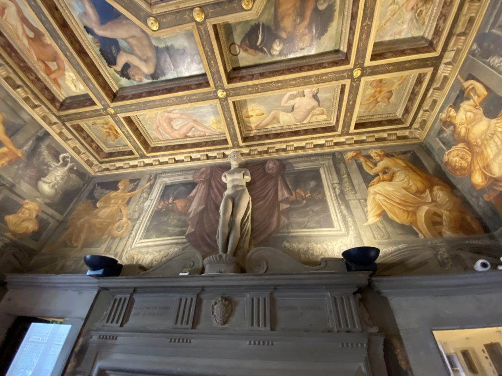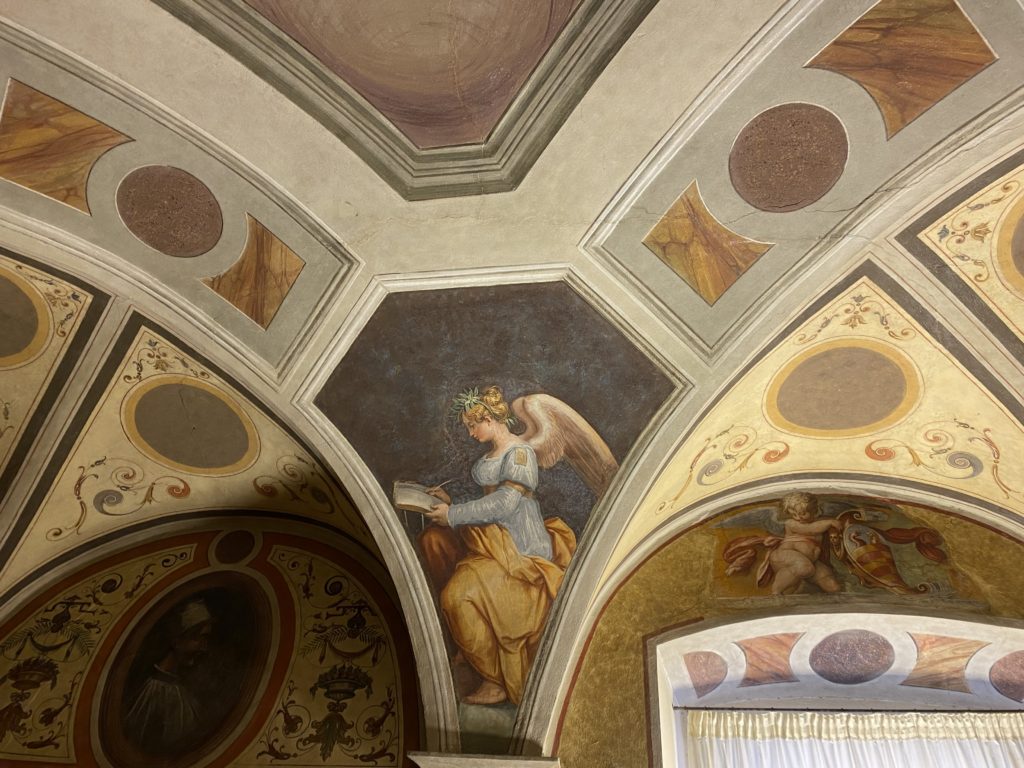Nel borgo di San Vito la casa di Giorgio Vasari acquistata nel 1541, oggi sede museale dell’impronta visiva pittorica lasciata dall’artista. Costruita su tre piani la casa, organizzata per la servitù al primo e secondo piano. L’ultimo piano nobile la sua dimora privata. Intorno all’edificio un giardino all’italiana, rinascimentale, geometrico con siepi e una veduta sul borgo di Arezzo. Le decorazioni pittoriche della casa sono state realizzate da Vasari attento a celebrare e a evidenziare i simboli iconografici del proprio tempo con il contributo anche dei suoi amici aretini. Architetto, storico dell’arte e pittore, Giorgio Vasari affresca così le stanze a partire dal 1542. Il gusto manierista è visibile soprattutto nella quadreria con circa sessanta dipinti eseguiti da lui e dai suoi collaboratori. Al piano nobile, tramite una scalinata, con il busto di Vasari, si entra nella stanza del camino. L’artista affresca il luogo a partire dal 1548 con i temi: “Cacciata dell’Invidia” e della “Fortuna” da parte delle Virtù. La visione di questa pittura metafora della vita è nel soffitto a cassettone e nelle pareti appunto con figure allegoriche, paesaggi, storie eroiche dell’antichità, poi la “Cappellina” con la Madonna e Fra Paolino e il pavimento in maiolica del XVI secolo. Il tardo manierismo è presente nel corridoio con le sue visioni apocalittiche. La camera nuziale con il soffitto decorato da Vasari di Abramo tra le immagini del mondo, della “Pace”, la “Concordia”, le “Virtù” e la “Modestia”. La “Camera di Apollo” fu affrescata dall’artista è rappresenta Apollo e le nove muse con l’allegoria dell’amore, il ritratto della moglie Nicolosa Bacci. Nella camera della “Fama”, Vasari dipinse nel soffitto appunto il suo intendimento sulla “Fama” e nei peducci e lunette le quattro arti, il suo ritratto e degli artisti aretini: Signorelli, Della Gatta, Spinello, Aretino con Michelangelo e Andrea del Sarto. I contenuti allegorici e pittorici, la consistente visione continua e avvolgente della cosmologia dei miti antichi attualizzati, la narrazione insita dell’affresco, la visione manierista di un mondo bucolico e possibile per averlo vicino e condividerlo, fanno di Vasari un attento studioso e documentarista che attinge le sue conoscenze ai testi antichi per realizzare uno scenario così inedito e dettagliato nelle ragioni che afferma, esclusivo di una pittura commemorative e manierista che non ha eguali. Pitture murali sulle volte e sulle pareti, dipinti su tavola che Vasari realizza a più riprese nella sua abitazione decorata che vivacizza il suo pensiero e lo tiene costantemente aperto alla bellezza e al sogno dell’arte senza barriere.