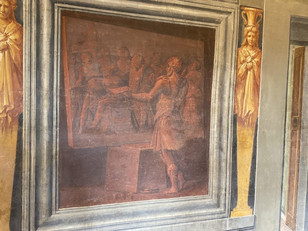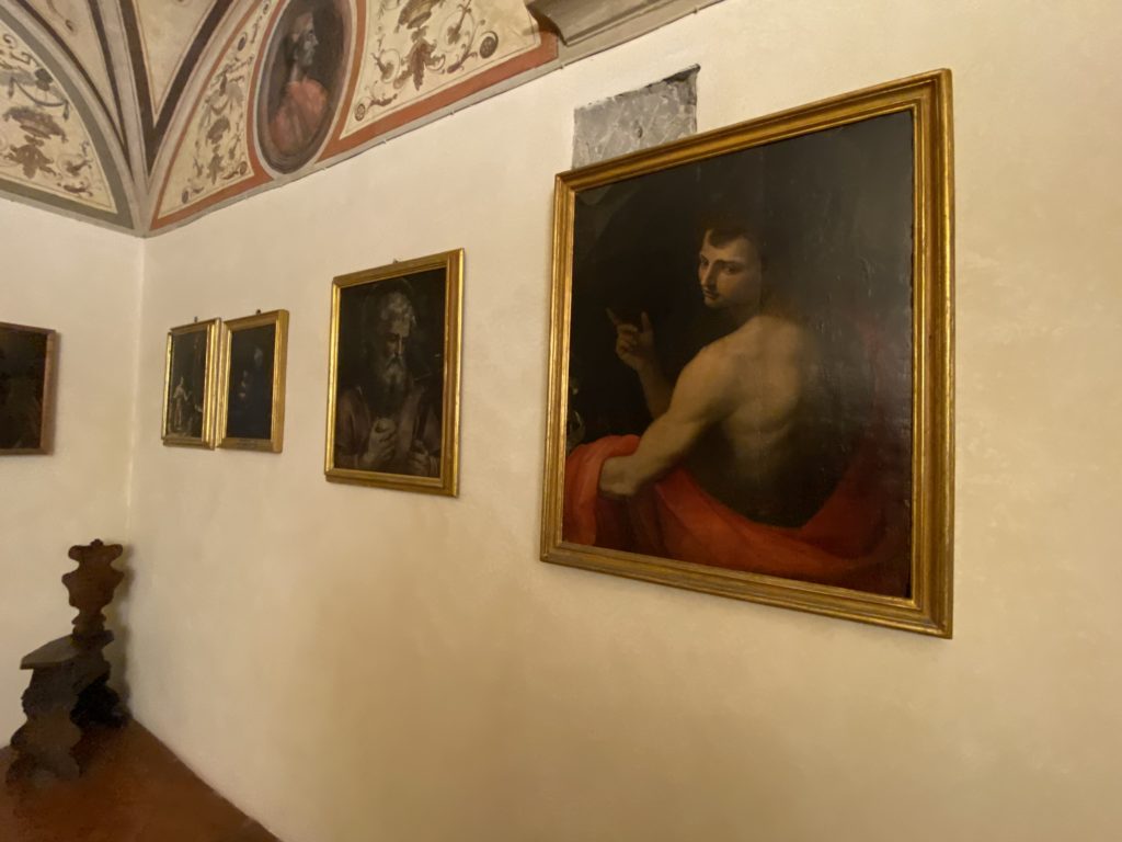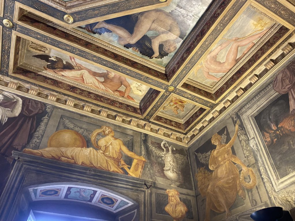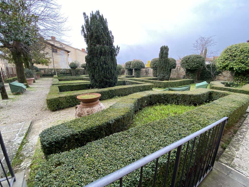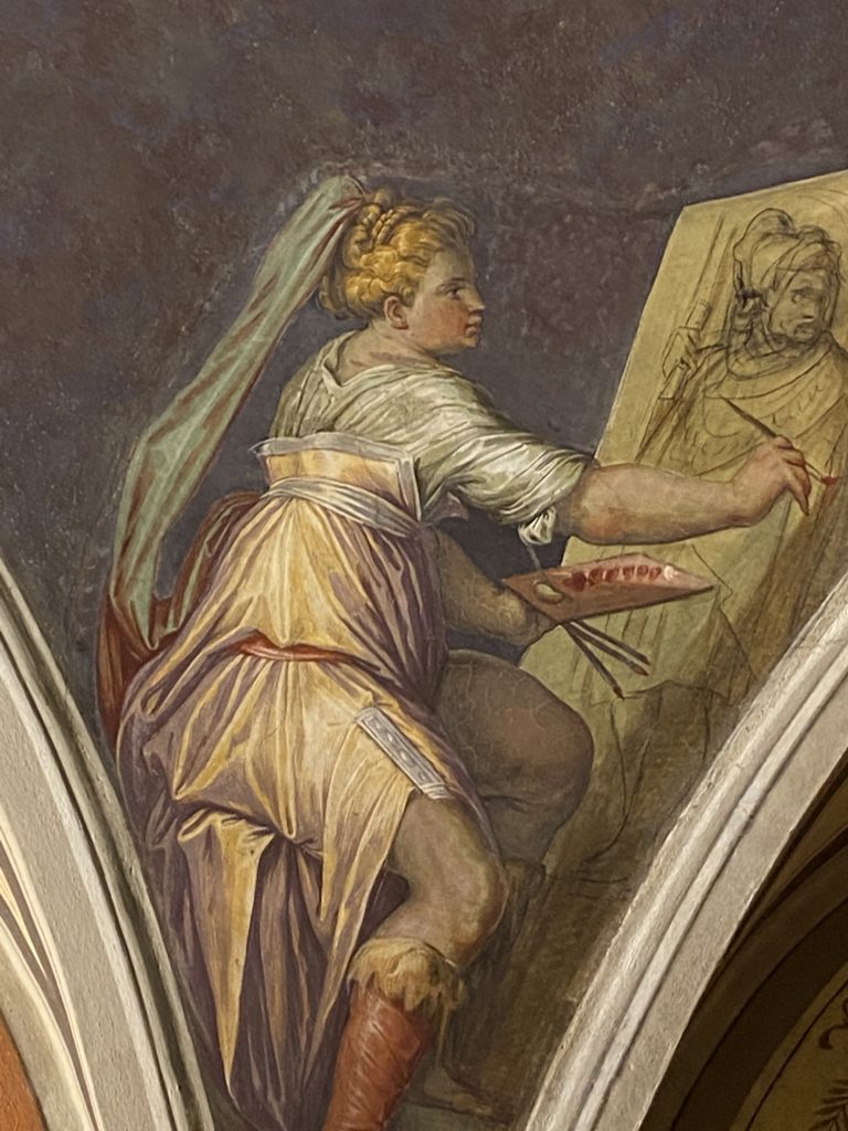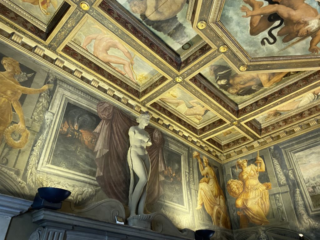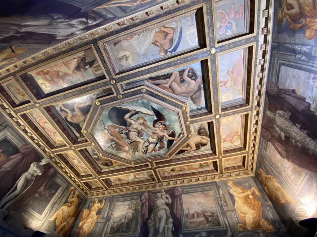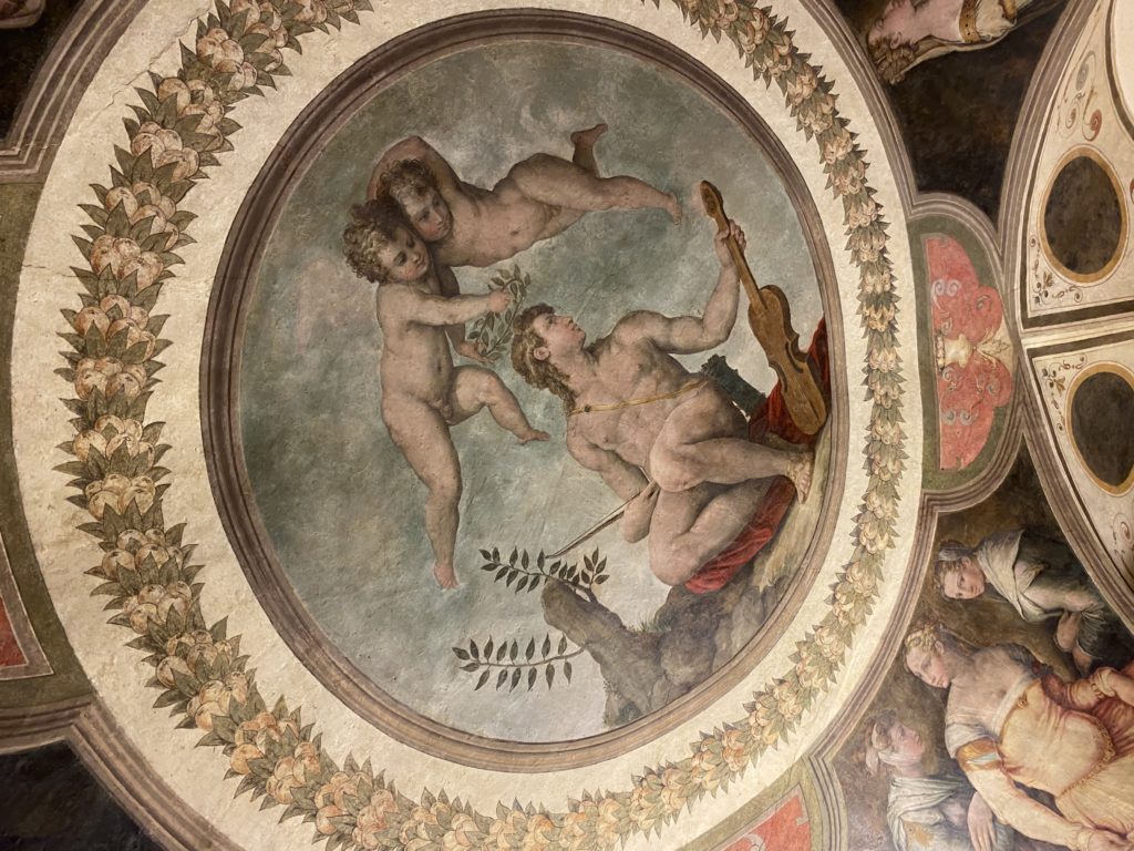 Nel borgo di San Vito la casa di Giorgio Vasari acquistata nel 1541, oggi sede museale dell’impronta visiva pittorica lasciata dall’artista. Costruita su tre piani la casa, organizzata per la servitù al primo e secondo piano. L’ultimo piano nobile la sua dimora privata. Intorno all’edificio un giardino all’italiana, rinascimentale, geometrico con siepi e una veduta sul borgo di Arezzo. Le decorazioni pittoriche della casa sono state realizzate da Vasari attento a celebrare e a evidenziare i simboli iconografici del proprio tempo con il contributo anche dei suoi amici aretini. Architetto, storico dell’arte e pittore, Giorgio Vasari affresca così le stanze a partire dal 1542. Il gusto manierista è visibile soprattutto nella quadreria con circa sessanta dipinti eseguiti da lui e dai suoi collaboratori. Al piano nobile, tramite una scalinata, con il busto di Vasari, si entra nella stanza del camino. L’artista affresca il luogo a partire dal 1548 con i temi: “Cacciata dell’Invidia” e della “Fortuna” da parte delle Virtù. La visione di questa pittura metafora della vita è nel soffitto a cassettone e nelle pareti appunto con figure allegoriche, paesaggi, storie eroiche dell’antichità, poi la “Cappellina” con la Madonna e Fra Paolino e il pavimento in maiolica del XVI secolo. Il tardo manierismo è presente nel corridoio con le sue visioni apocalittiche. La camera nuziale con il soffitto decorato da Vasari di Abramo tra le immagini del mondo, della “Pace”, la “Concordia”, le “Virtù” e la “Modestia”. La “Camera di Apollo” fu affrescata dall’artista è rappresenta Apollo e le nove muse con l’allegoria dell’amore, il ritratto della moglie Nicolosa Bacci. Nella camera della “Fama”, Vasari dipinse nel soffitto appunto il suo intendimento sulla “Fama” e nei peducci e lunette le quattro arti, il suo ritratto e degli artisti aretini: Signorelli, Della Gatta, Spinello, Aretino con Michelangelo e Andrea del Sarto. I contenuti allegorici e pittorici, la consistente visione continua e avvolgente della cosmologia dei miti antichi attualizzati, la narrazione insita dell’affresco, la visione manierista di un mondo bucolico e possibile per averlo vicino e condividerlo, fanno di Vasari un attento studioso e documentarista che attinge le sue conoscenze ai testi antichi per realizzare uno scenario così inedito e dettagliato nelle ragioni che afferma, esclusivo di una pittura commemorative e manierista che non ha eguali. Pitture murali sulle volte e sulle pareti, dipinti su tavola che Vasari realizza a più riprese nella sua abitazione decorata che vivacizza il suo pensiero e lo tiene costantemente aperto alla bellezza e al sogno dell’arte senza barriere.