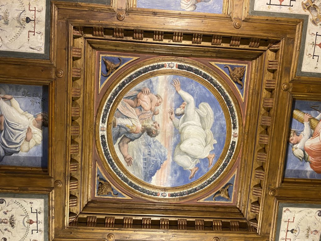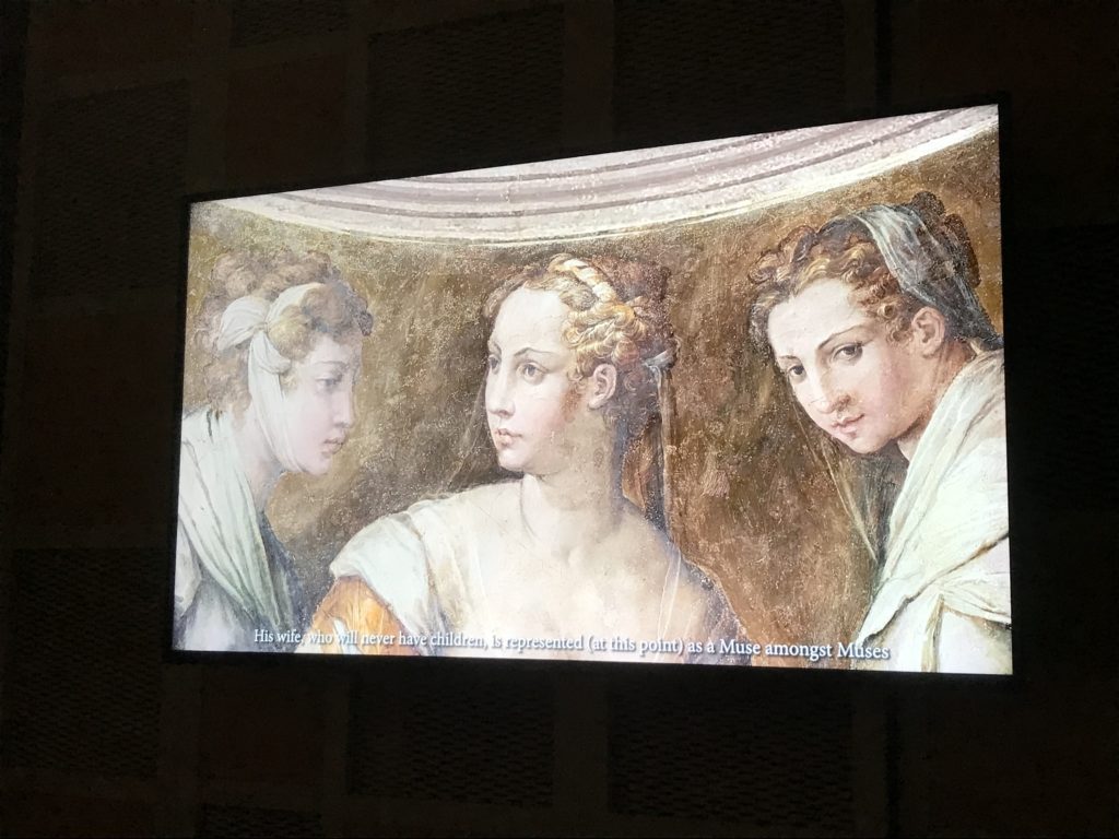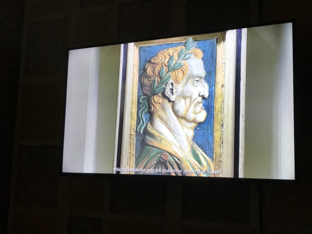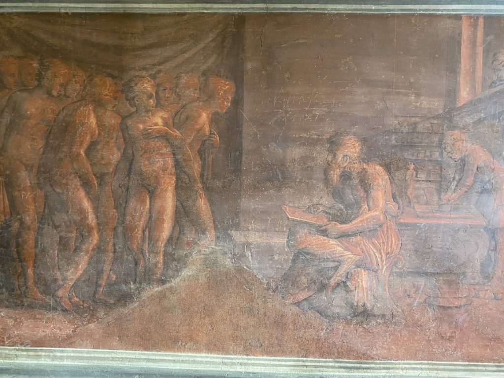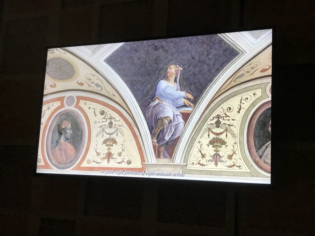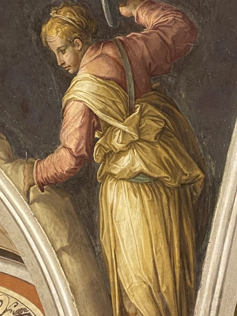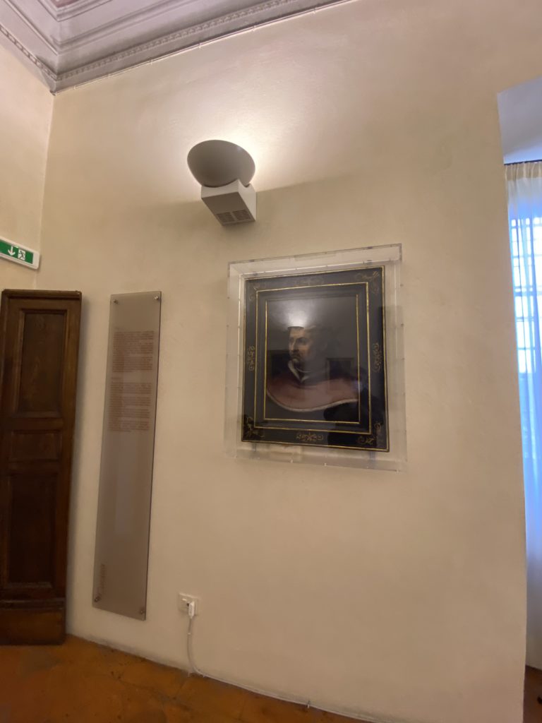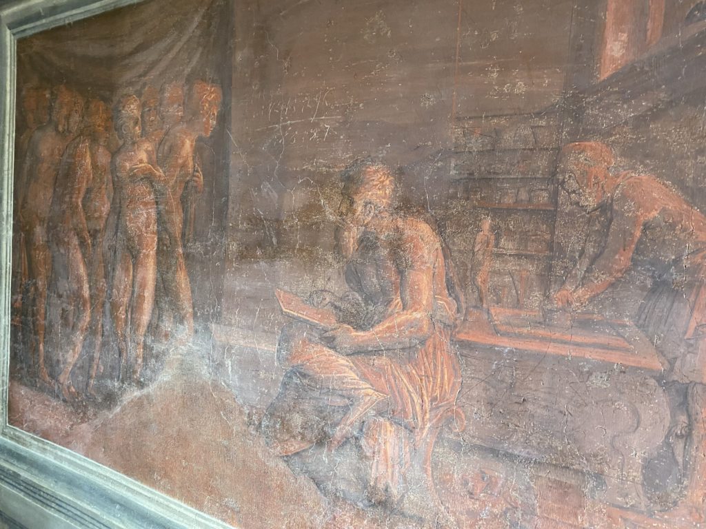 Nel borgo di San Vito la casa di Giorgio Vasari acquistata nel 1541, oggi sede museale dell’impronta visiva pittorica lasciata dall’artista. Costruita su tre piani la casa, organizzata per la servitù al primo e secondo piano. L’ultimo piano nobile la sua dimora privata. Intorno all’edificio un giardino all’italiana, rinascimentale, geometrico con siepi e una veduta sul borgo di Arezzo. Le decorazioni pittoriche della casa sono state realizzate da Vasari attento a celebrare e a evidenziare i simboli iconografici del proprio tempo con il contributo anche dei suoi amici aretini. Architetto, storico dell’arte e pittore, Giorgio Vasari affresca così le stanze a partire dal 1542. Il gusto manierista è visibile soprattutto nella quadreria con circa sessanta dipinti eseguiti da lui e dai suoi collaboratori. Al piano nobile, tramite una scalinata, con il busto di Vasari, si entra nella stanza del camino. L’artista affresca il luogo a partire dal 1548 con i temi: “Cacciata dell’Invidia” e della “Fortuna” da parte delle Virtù. La visione di questa pittura metafora della vita è nel soffitto a cassettone e nelle pareti appunto con figure allegoriche, paesaggi, storie eroiche dell’antichità, poi la “Cappellina” con la Madonna e Fra Paolino e il pavimento in maiolica del XVI secolo. Il tardo manierismo è presente nel corridoio con le sue visioni apocalittiche. La camera nuziale con il soffitto decorato da Vasari di Abramo tra le immagini del mondo, della “Pace”, la “Concordia”, le “Virtù” e la “Modestia”. La “Camera di Apollo” fu affrescata dall’artista è rappresenta Apollo e le nove muse con l’allegoria dell’amore, il ritratto della moglie Nicolosa Bacci. Nella camera della “Fama”, Vasari dipinse nel soffitto appunto il suo intendimento sulla “Fama” e nei peducci e lunette le quattro arti, il suo ritratto e degli artisti aretini: Signorelli, Della Gatta, Spinello, Aretino con Michelangelo e Andrea del Sarto. I contenuti allegorici e pittorici, la consistente visione continua e avvolgente della cosmologia dei miti antichi attualizzati, la narrazione insita dell’affresco, la visione manierista di un mondo bucolico e possibile per averlo vicino e condividerlo, fanno di Vasari un attento studioso e documentarista che attinge le sue conoscenze ai testi antichi per realizzare uno scenario così inedito e dettagliato nelle ragioni che afferma, esclusivo di una pittura commemorative e manierista che non ha eguali. Pitture murali sulle volte e sulle pareti, dipinti su tavola che Vasari realizza a più riprese nella sua abitazione decorata che vivacizza il suo pensiero e lo tiene costantemente aperto alla bellezza e al sogno dell’arte senza barriere.