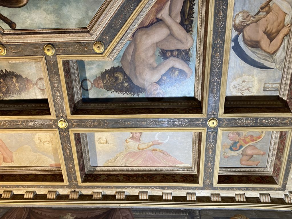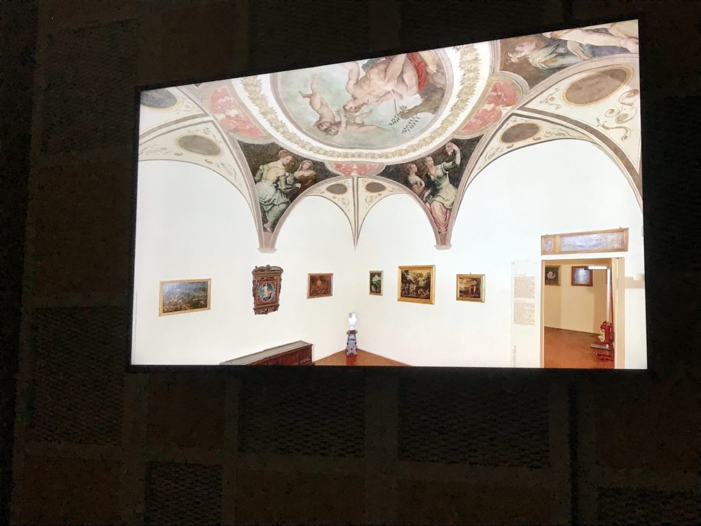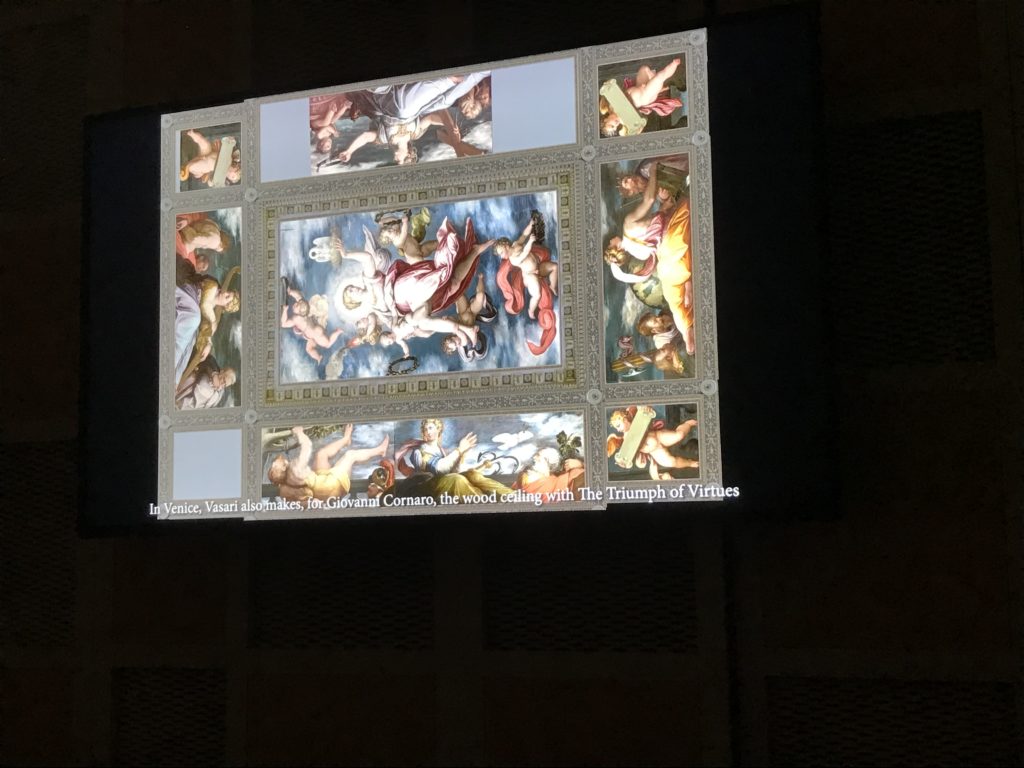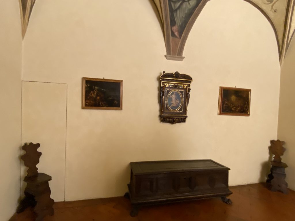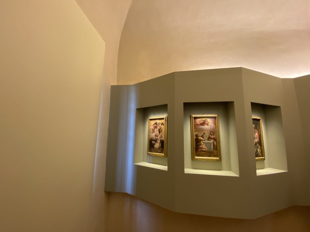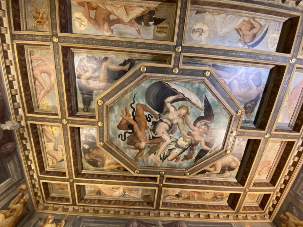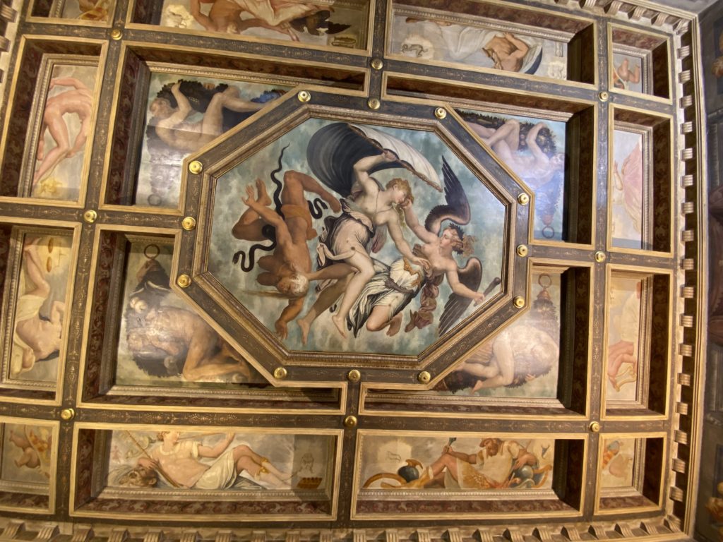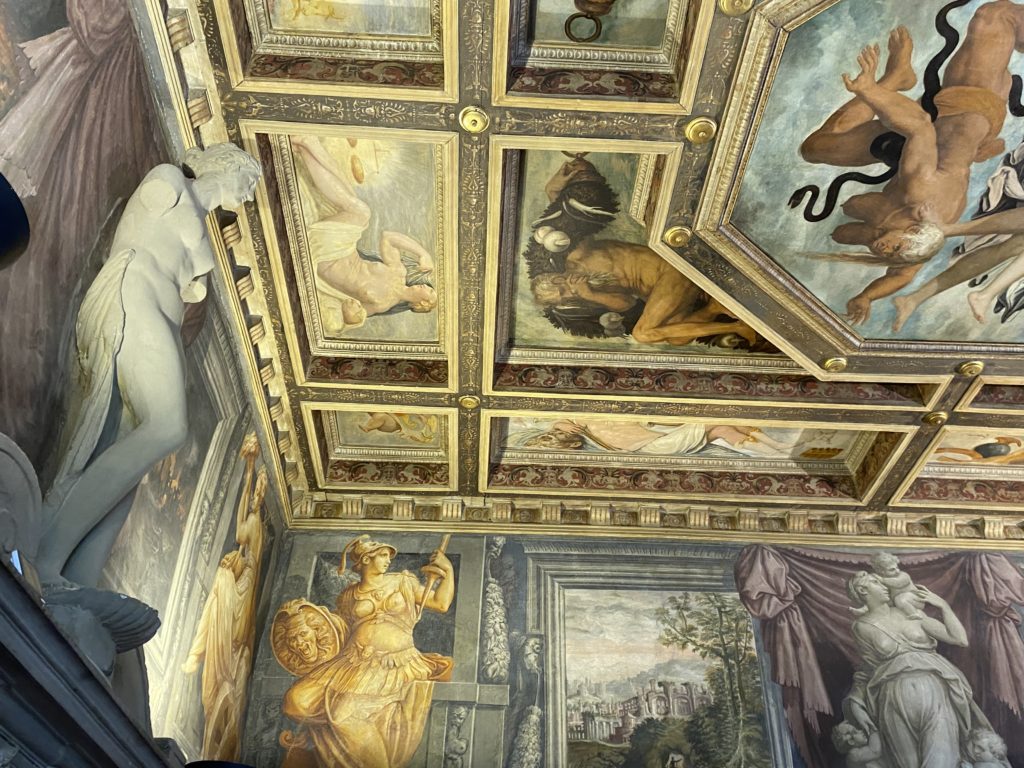 Nel borgo di San Vito la casa di Giorgio Vasari acquistata nel 1541, oggi sede museale dell’impronta visiva pittorica lasciata dall’artista. Costruita su tre piani la casa, organizzata per la servitù al primo e secondo piano. L’ultimo piano nobile la sua dimora privata. Intorno all’edificio un giardino all’italiana, rinascimentale, geometrico con siepi e una veduta sul borgo di Arezzo. Le decorazioni pittoriche della casa sono state realizzate da Vasari attento a celebrare e a evidenziare i simboli iconografici del proprio tempo con il contributo anche dei suoi amici aretini. Architetto, storico dell’arte e pittore, Giorgio Vasari affresca così le stanze a partire dal 1542. Il gusto manierista è visibile soprattutto nella quadreria con circa sessanta dipinti eseguiti da lui e dai suoi collaboratori. Al piano nobile, tramite una scalinata, con il busto di Vasari, si entra nella stanza del camino. L’artista affresca il luogo a partire dal 1548 con i temi: “Cacciata dell’Invidia” e della “Fortuna” da parte delle Virtù. La visione di questa pittura metafora della vita è nel soffitto a cassettone e nelle pareti appunto con figure allegoriche, paesaggi, storie eroiche dell’antichità, poi la “Cappellina” con la Madonna e Fra Paolino e il pavimento in maiolica del XVI secolo. Il tardo manierismo è presente nel corridoio con le sue visioni apocalittiche. La camera nuziale con il soffitto decorato da Vasari di Abramo tra le immagini del mondo, della “Pace”, la “Concordia”, le “Virtù” e la “Modestia”. La “Camera di Apollo” fu affrescata dall’artista è rappresenta Apollo e le nove muse con l’allegoria dell’amore, il ritratto della moglie Nicolosa Bacci. Nella camera della “Fama”, Vasari dipinse nel soffitto appunto il suo intendimento sulla “Fama” e nei peducci e lunette le quattro arti, il suo ritratto e degli artisti aretini: Signorelli, Della Gatta, Spinello, Aretino con Michelangelo e Andrea del Sarto. I contenuti allegorici e pittorici, la consistente visione continua e avvolgente della cosmologia dei miti antichi attualizzati, la narrazione insita dell’affresco, la visione manierista di un mondo bucolico e possibile per averlo vicino e condividerlo, fanno di Vasari un attento studioso e documentarista che attinge le sue conoscenze ai testi antichi per realizzare uno scenario così inedito e dettagliato nelle ragioni che afferma, esclusivo di una pittura commemorative e manierista che non ha eguali. Pitture murali sulle volte e sulle pareti, dipinti su tavola che Vasari realizza a più riprese nella sua abitazione decorata che vivacizza il suo pensiero e lo tiene costantemente aperto alla bellezza e al sogno dell’arte senza barriere.
