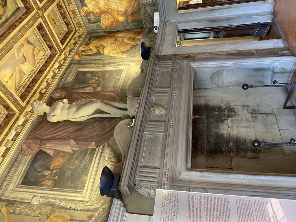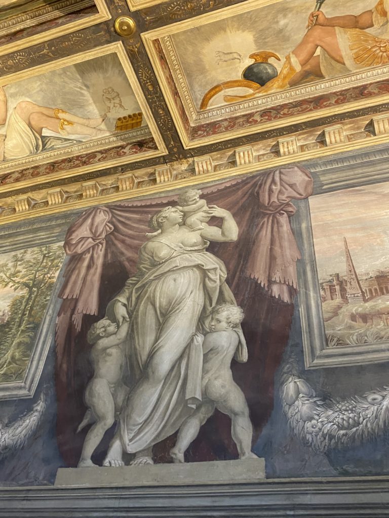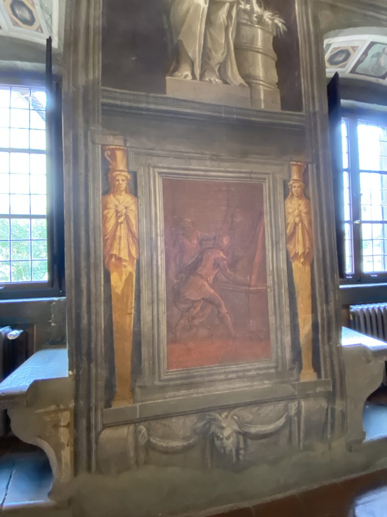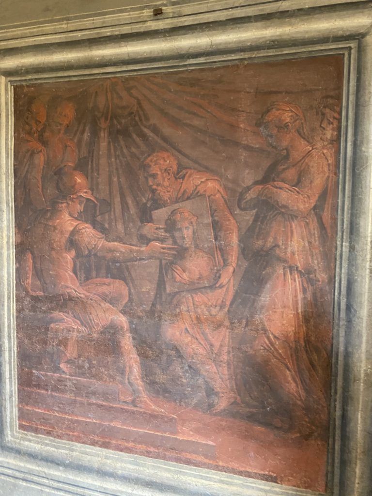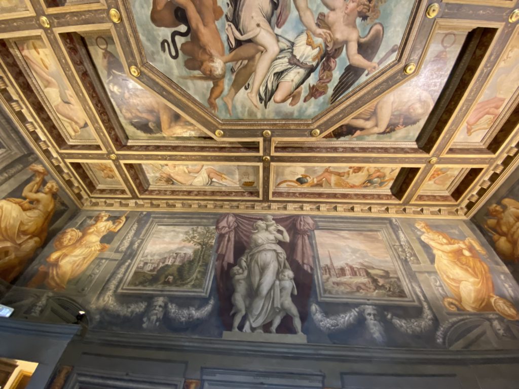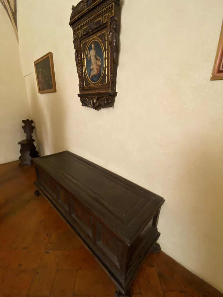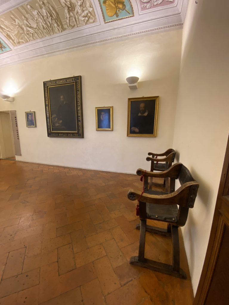 Nel borgo di San Vito la casa di Giorgio Vasari acquistata nel 1541, oggi sede museale dell’impronta visiva pittorica lasciata dall’artista. Costruita su tre piani la casa, organizzata per la servitù al primo e secondo piano. L’ultimo piano nobile la sua dimora privata. Intorno all’edificio un giardino all’italiana, rinascimentale, geometrico con siepi e una veduta sul borgo di Arezzo. Le decorazioni pittoriche della casa sono state realizzate da Vasari attento a celebrare e a evidenziare i simboli iconografici del proprio tempo con il contributo anche dei suoi amici aretini. Architetto, storico dell’arte e pittore, Giorgio Vasari affresca così le stanze a partire dal 1542. Il gusto manierista è visibile soprattutto nella quadreria con circa sessanta dipinti eseguiti da lui e dai suoi collaboratori. Al piano nobile, tramite una scalinata, con il busto di Vasari, si entra nella stanza del camino. L’artista affresca il luogo a partire dal 1548 con i temi: “Cacciata dell’Invidia” e della “Fortuna” da parte delle Virtù. La visione di questa pittura metafora della vita è nel soffitto a cassettone e nelle pareti appunto con figure allegoriche, paesaggi, storie eroiche dell’antichità, poi la “Cappellina” con la Madonna e Fra Paolino e il pavimento in maiolica del XVI secolo. Il tardo manierismo è presente nel corridoio con le sue visioni apocalittiche. La camera nuziale con il soffitto decorato da Vasari di Abramo tra le immagini del mondo, della “Pace”, la “Concordia”, le “Virtù” e la “Modestia”. La “Camera di Apollo” fu affrescata dall’artista è rappresenta Apollo e le nove muse con l’allegoria dell’amore, il ritratto della moglie Nicolosa Bacci. Nella camera della “Fama”, Vasari dipinse nel soffitto appunto il suo intendimento sulla “Fama” e nei peducci e lunette le quattro arti, il suo ritratto e degli artisti aretini: Signorelli, Della Gatta, Spinello, Aretino con Michelangelo e Andrea del Sarto. I contenuti allegorici e pittorici, la consistente visione continua e avvolgente della cosmologia dei miti antichi attualizzati, la narrazione insita dell’affresco, la visione manierista di un mondo bucolico e possibile per averlo vicino e condividerlo, fanno di Vasari un attento studioso e documentarista che attinge le sue conoscenze ai testi antichi per realizzare uno scenario così inedito e dettagliato nelle ragioni che afferma, esclusivo di una pittura commemorative e manierista che non ha eguali. Pitture murali sulle volte e sulle pareti, dipinti su tavola che Vasari realizza a più riprese nella sua abitazione decorata che vivacizza il suo pensiero e lo tiene costantemente aperto alla bellezza e al sogno dell’arte senza barriere.