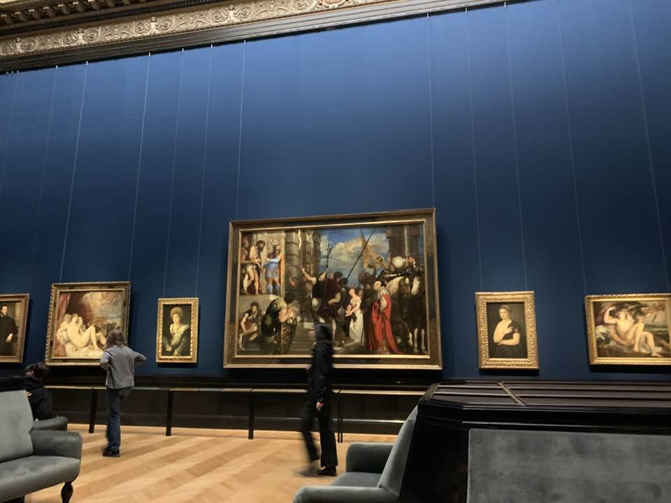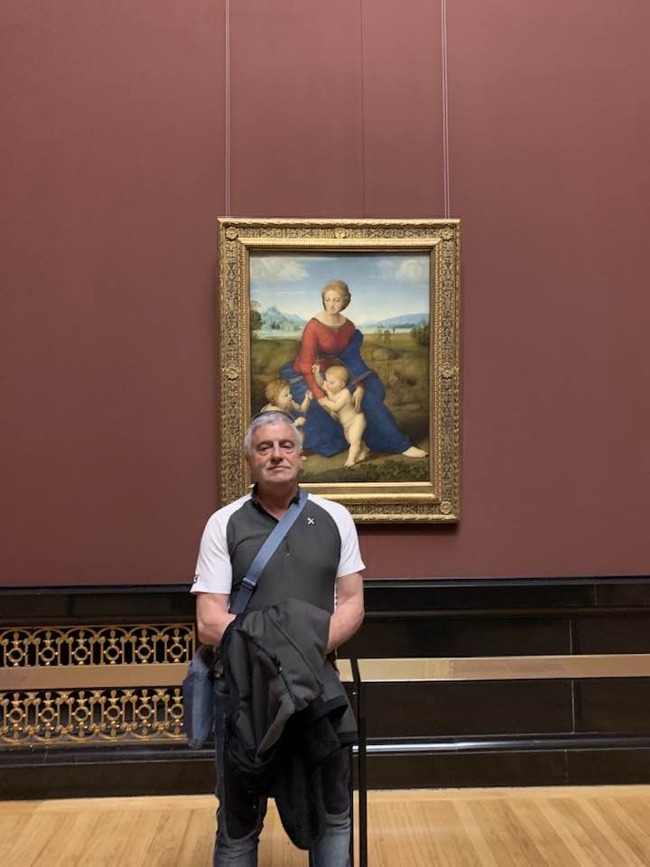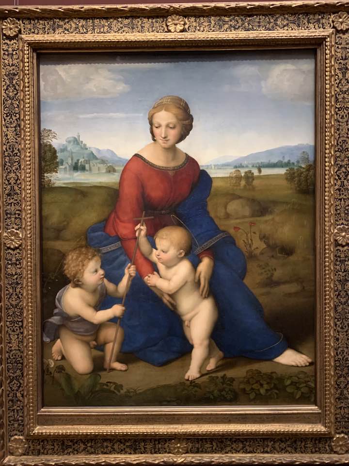 Opera del 1506, questa è la data posta sulla veste della Madonna appena riportata sull’orlo. La tavola misura cm 113 x 88, è definita Madonna con il Bambino e san Giovannino. Dipinta con il busto appena girato, le spalle appena prospettiche che danno a quel lieve movimento con la testa leggermente reclinata che guarda san Giovannino, la delicata scenica pittorica, soffice, leggera e naturalistica senza errore, sì senza errore nella plastica rappresentazione di Raffaello che non ha rivali, chiamato il “Divino”. Il Bambino gioca con san Giovannino, il cugino, è sembrano divertiti dalla croce astile che mantengono. La tavola è impostata su una forma geometrica triangolare, il punto di vista dell’osservatore è rialzato per avere uno sguardo prospettico sul paesaggio lagunare, alle spalle dei tre personaggi, appena lambito dalla foschia, con il borgo e la campagna ondulata. Il piede della Madonna fuoriesce dalla sua veste: un enigma di un simbolo, forse, oppure per controbilanciare le nudità dei due bambini. Il volto della Vergine è nell’atto di evidenziare un tenue sorriso. La pittura è calma, serena, l’armonia dei colori e le tonalità chiaroscurali sui piani pittorici sono dialoganti tra loro.
