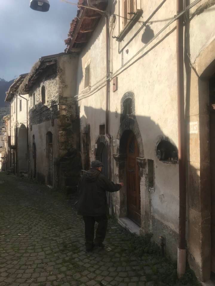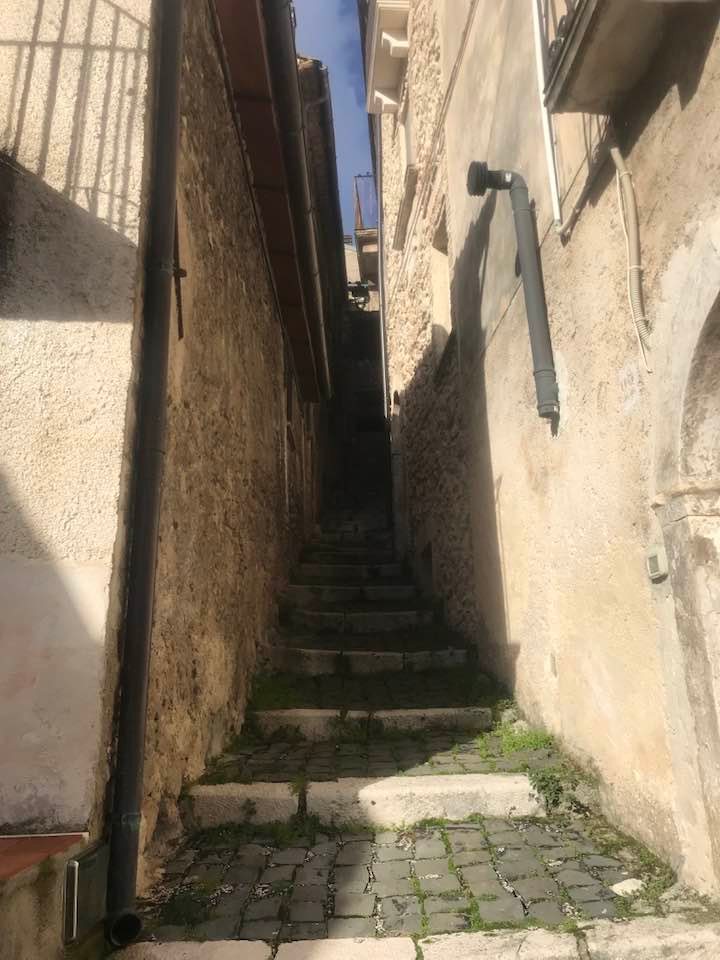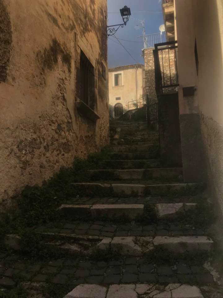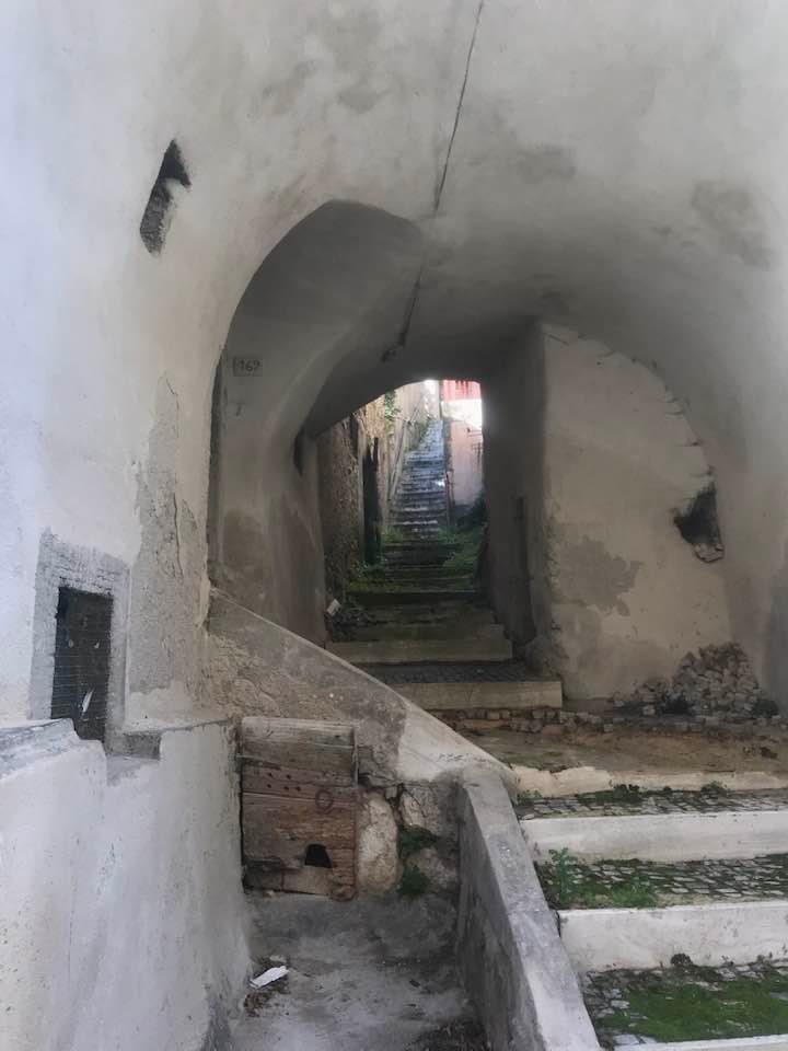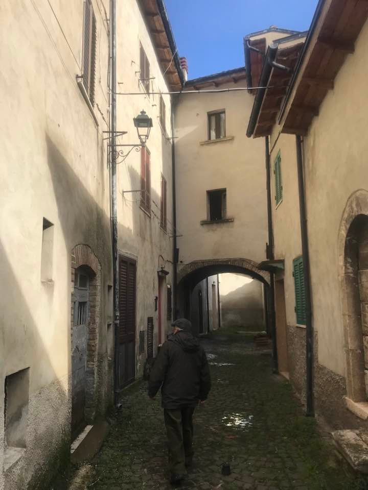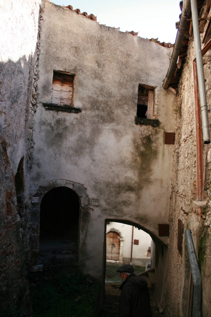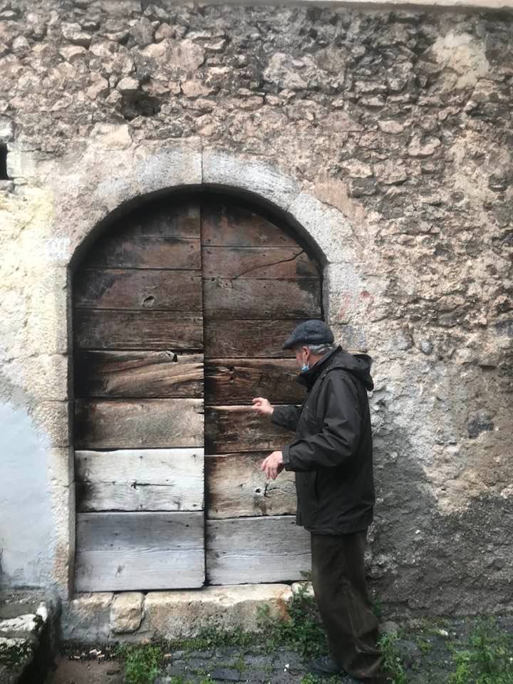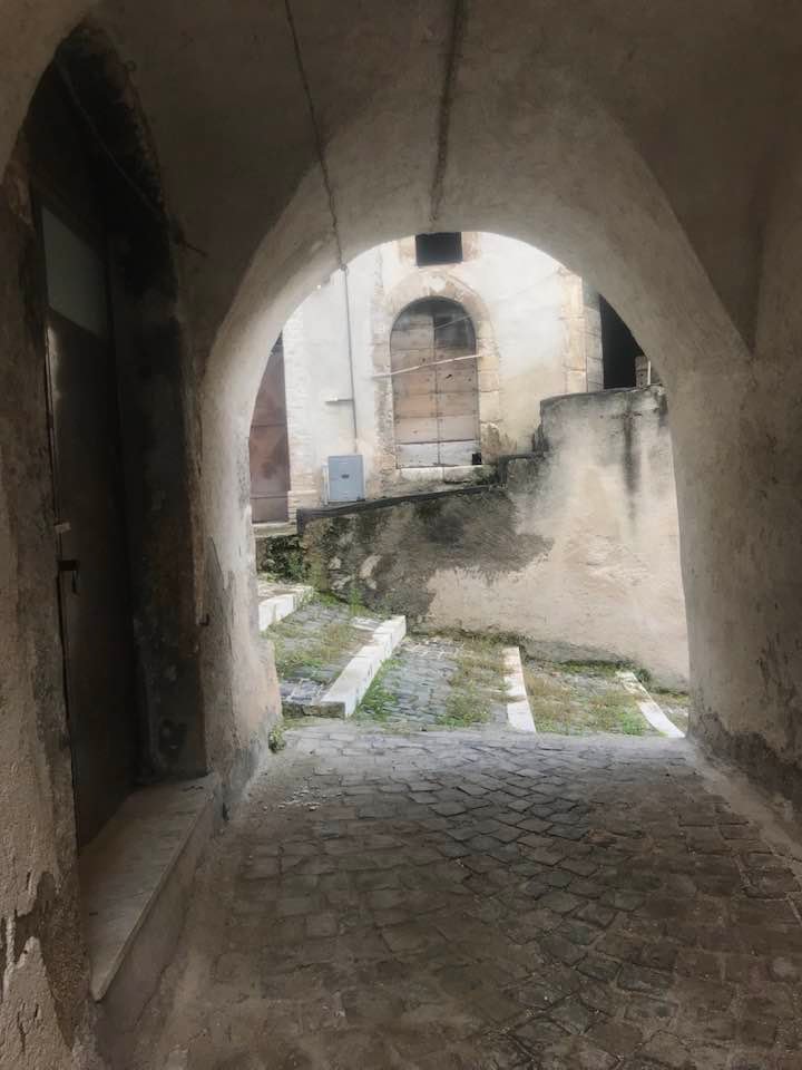 Dalla sommità del borgo la chiesa di San Nicola di Bari. Scendiamo con Luigino Barbati dentro i vicoli, le strade cordonate, gli accessi stretti, i sottopassi e gli slarghi del borgo di Secinaro.