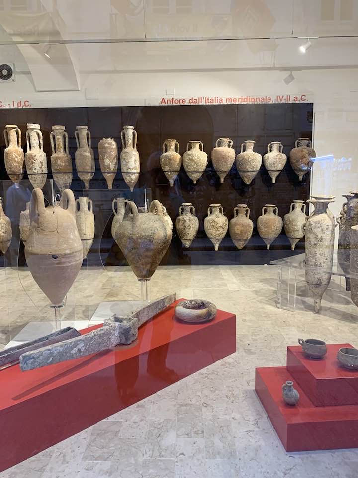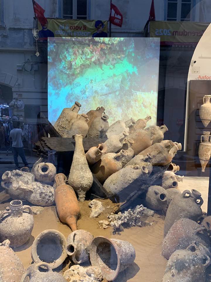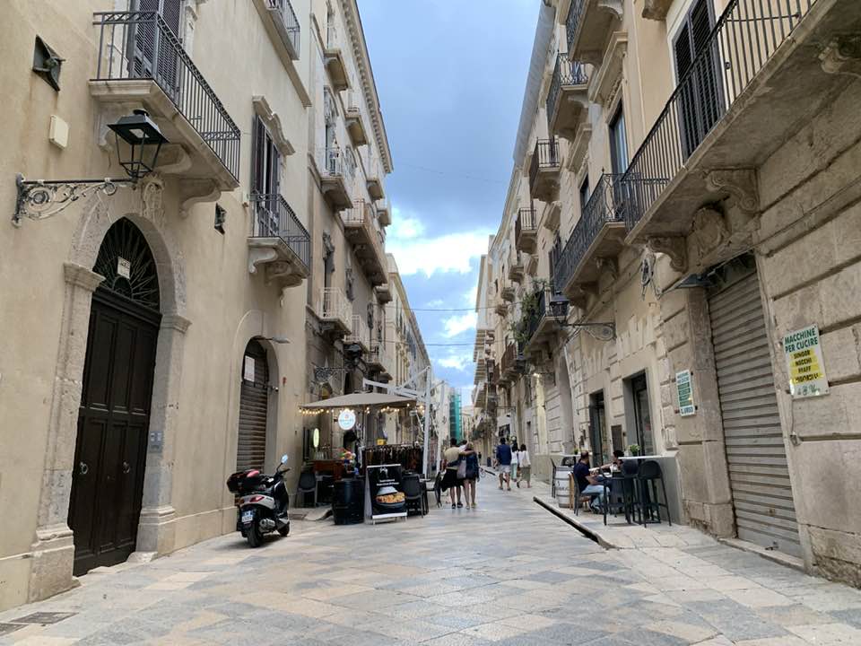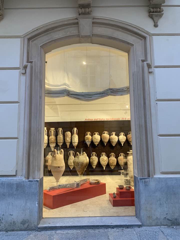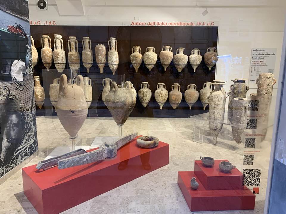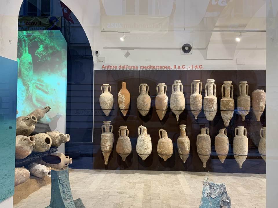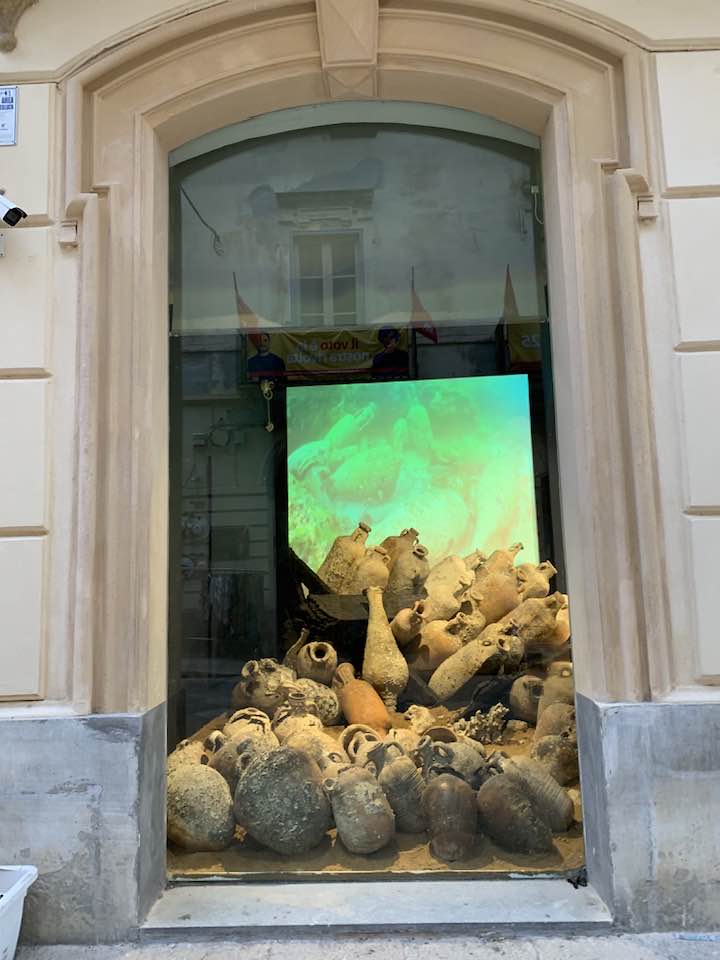 Via Garibaldi invece, con le chiese barocche sull’impronta siciliana e per questo con linee sinuose, ornamenti decorativi, fregi, cornici e volumi architettonici imponenti e ricchi, che si flettono nella facciata in un gioco di luci e ombre, e poi le quinte dei palazzi del “Gattopardo” di Visconti… In tre vetrine espositive dell’Assessorato ai Beni Culturali, lungo la via, un allestimento multimediale visualizza i reperti archeologici. Nelle sale esposte davanti alle vetrine le anfore, ma soprattutto i rostri sulle prue romane per speronare, poiché nelle battaglie navali facevano la differenza, squarciando i remi e le fiancate delle navi cartaginesi, in un lembo di mare teatro della battaglia navale prospicente la citta di Trapani. Poi, esposti, anche gli elmi punici, le ancore e gli oggetti delle imbarcazioni militari. Sullo sfondo delle sale espositive i video girati sui fondali mostrano la ricerca subacquea nel “catalogo” dei rinvenimenti sulle sabbie del mare e il recupero, quindi, dei reperti archeologici a ottanta metri di profondità intorno a Levanzo, l’isola che fronteggia Trapani. Davanti alle vetrine, sulla via basolata, e sul marciapiede opposto, a terra, sdraiati, i venditori nordafricani con gli oggetti improbabili sui loro teli allineati richiamano l’attenzione – e, con una immagine plastica, una iperbole metaforica, proviamo a pensare – quasi a voler fronteggiare in un confronto quelle vetrine in via Garibaldi di Roma Repubblicana. Certo, Roma in quel tempo, tutto il mondo conosciuto, bisognava guardarlo con gli occhi di Roma –  e l’Urbe inoltre si  fregiò con lo sviluppo della filosofia e la penetrazione, la diffusione del pensiero greco. La presenza sempre a Roma di filosofi greci, e la rielaborazione della filosofia greca in lingua latina. Ma se non fosse stata battaglia, cruenta e drammatica che cosa saremmo diventati noi, e quale sarebbe stato il nostro tempo, e il nostro destino…? Si, la battaglia dura che evolse a favore di Roma Repubblicana, le sue mire di espansione, la difesa delle rotte e delle coste, e l’opposizione quindi a una cultura completamente diversa, in tutto. Ma un’altra battaglia, intimista, e neorealista della città di Trapani, è stata condotta da Leonardo Sciascia, il suo spirituale dell’arte nel saper guardare il tempo e andare oltre: “esilio dall’interno, pur restando in Sicilia…”, un’ansia sopita dello scrittore siciliano e una ribellione antropica, simbolo del decadimento, dell’effimero o del caos nei suoi scritti illuminanti sulla realtà siciliana, mentre Roma, da qui, non misurabile, è impercettibile, distinta e distante, un’espressione geografica e nulla più, nel “Continente…”.