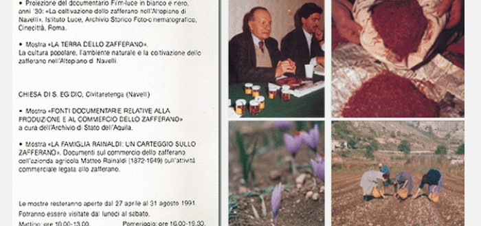 In occasione della presentazione della pubblicazione “La terra dello zafferano”, seconda monografia della collana “Uomo-Ambiente”, l’autore del volume Vincenzo Battista ha curato, ordinato e selezionato le mostre documentarie e archivistiche “La terra dello zafferano”, “La famiglia Rainaldi”, e il film d’epoca dell’Istituto Luce “La coltivazione dello zafferano” degli anni Trenta.