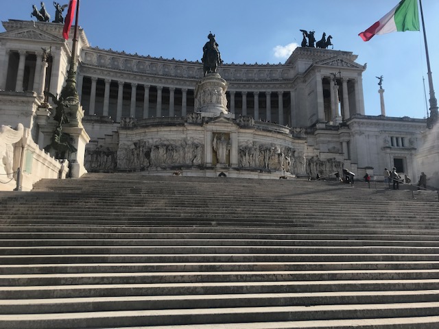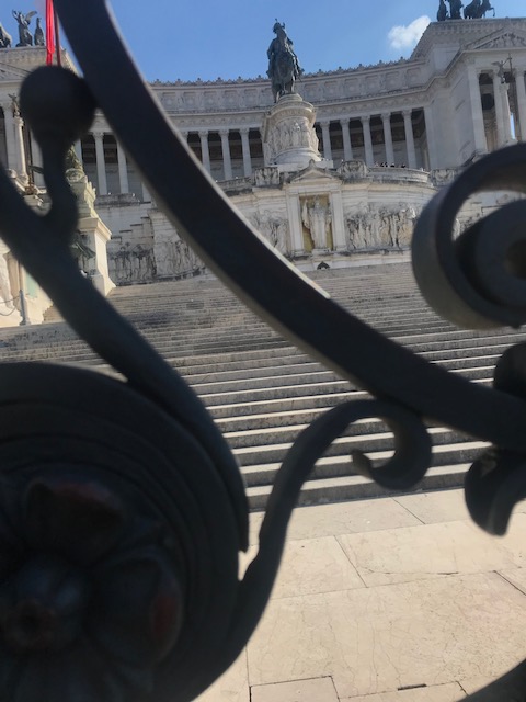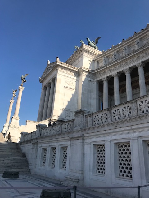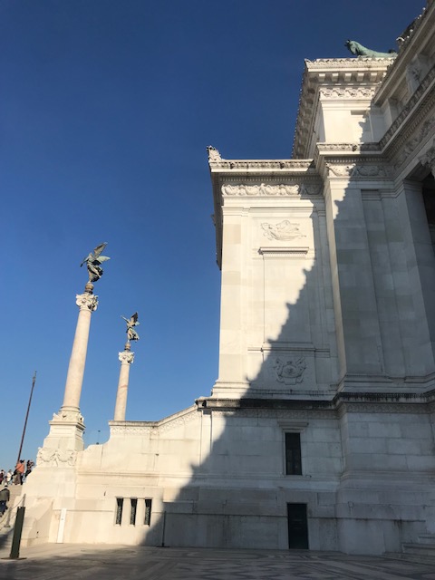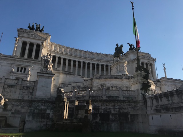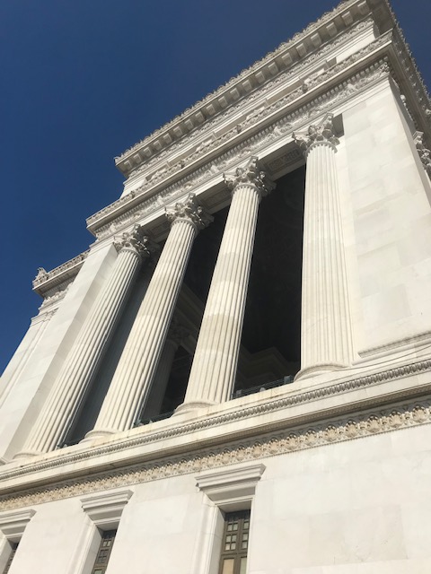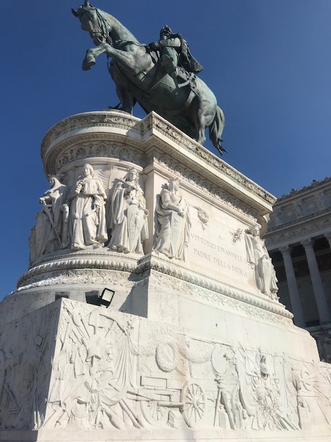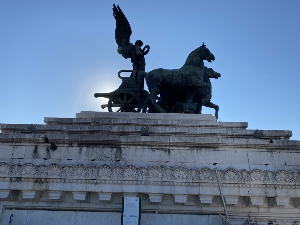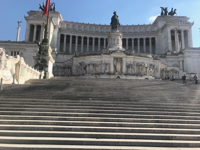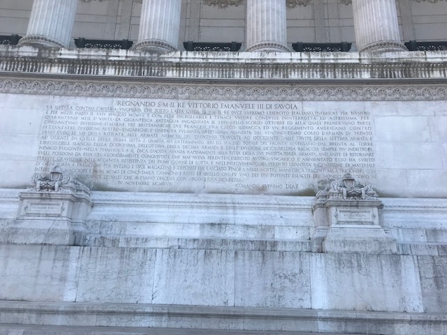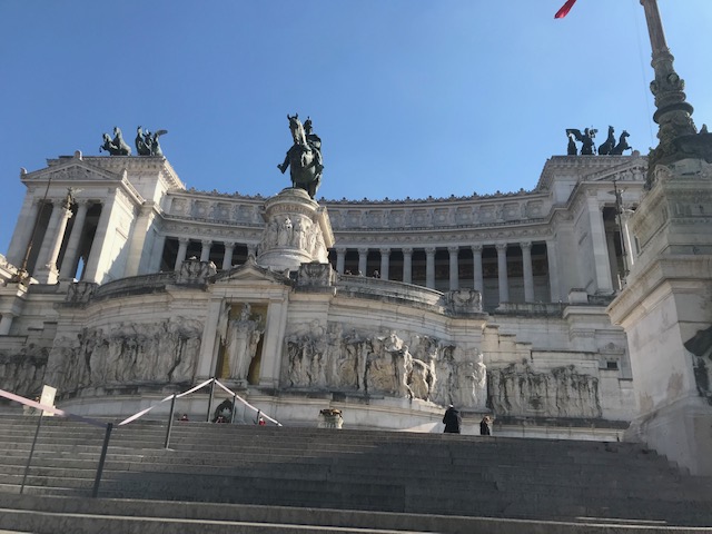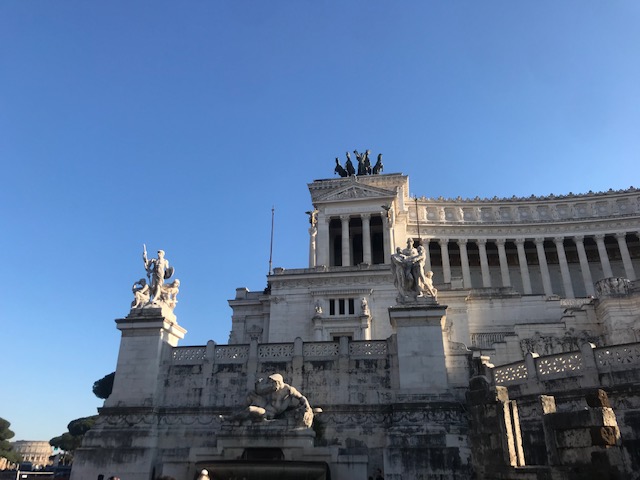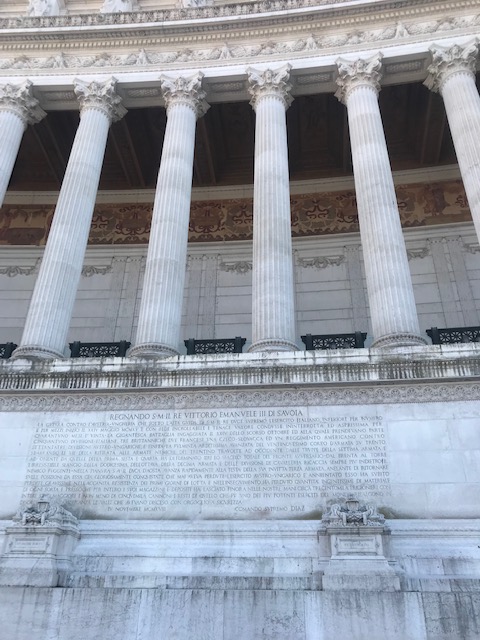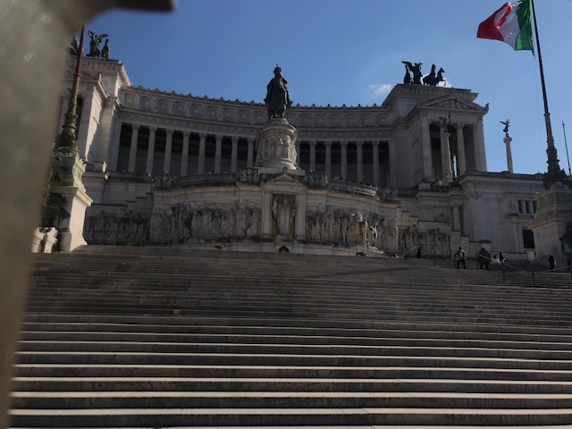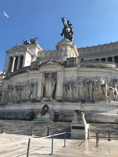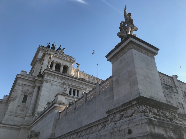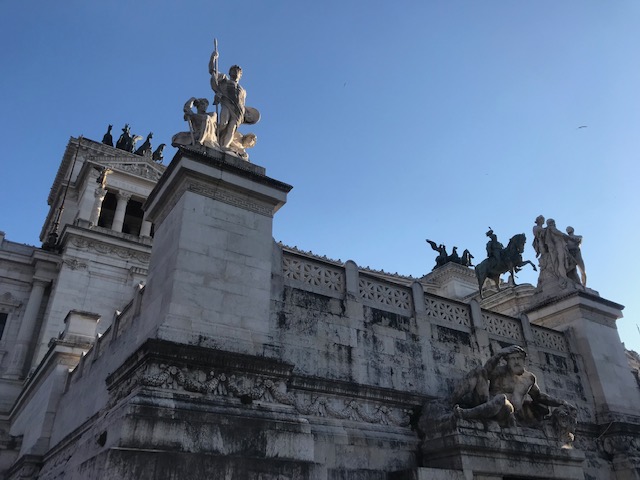 Il Vittoriano o Altare della Patria, monumento nazionale, fu costruito nel 1885 è terminato con gli ultimi interventi urbanistici nel 1935. Architettura ispirata al foro romano, una piazza greca, l’agora costruita su tre livelli. Portico, scalinate, colonnati rappresentano il sacello dove è posto il Milite Ignoto centrale a tutto il complesso architettonico. Sotto il regno di Vittorio Emanuele II di Savoia, il Vittoriano, opera dell’architetto Giuseppe Sacconi, celebra la valenza simbolica, le virtù, l’amor di Patria: un tempio laico al sacrificio e alle presunte virtù della patria come nell’Altare di Pergamo esposto al Permamonmuseum. Contiguo al Foro romano, il Vittoriano si è “poggiato” sulle memorie della storia dell’Urbe, nascondendo per sempre i sedimenti costitutivi, la topografia appunto della Roma Imperiale, come accadrà alcuni decennio dopo con l’apertura dell’asse stradale di Via dei Fori Imperiali nel periodo fascista.