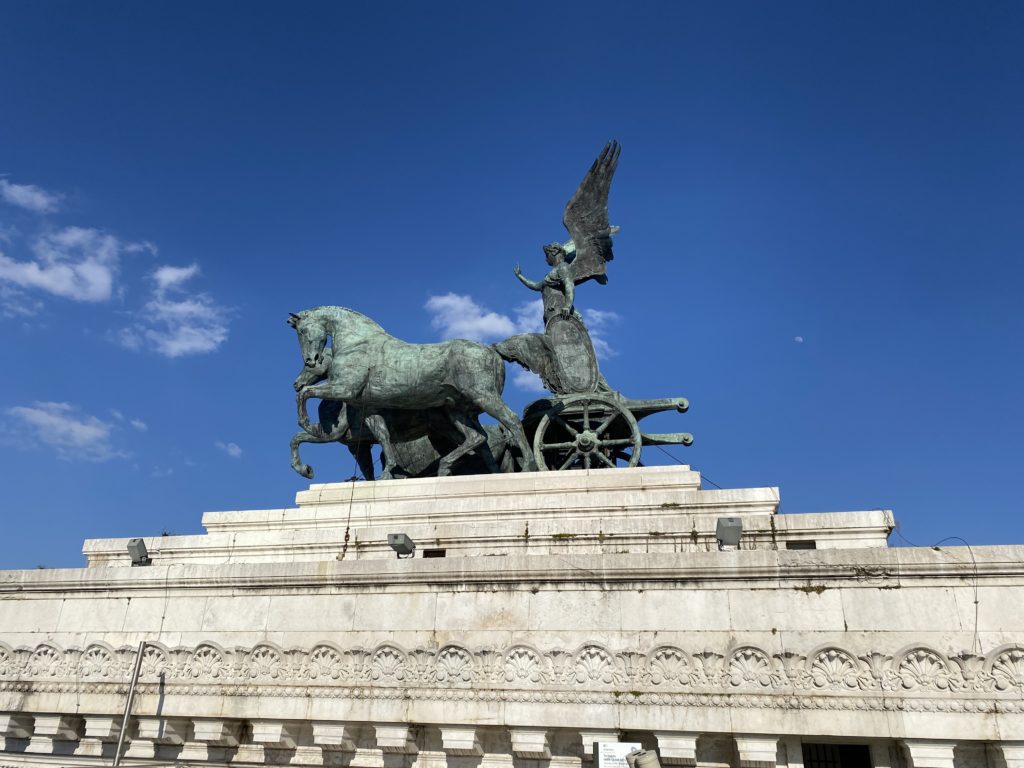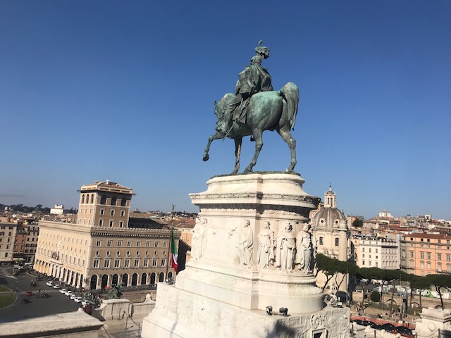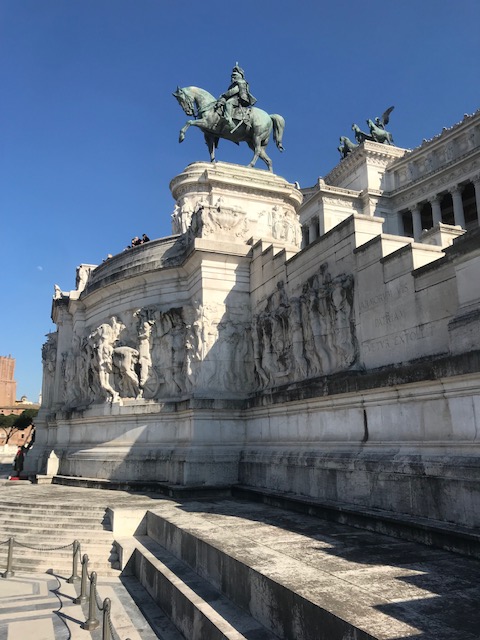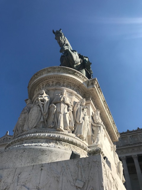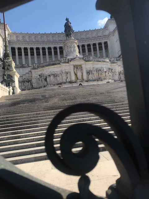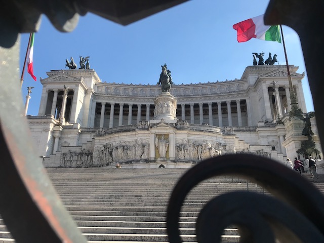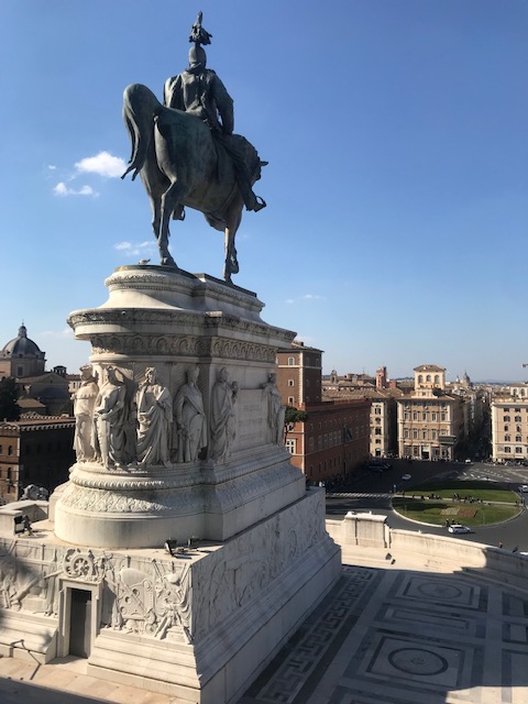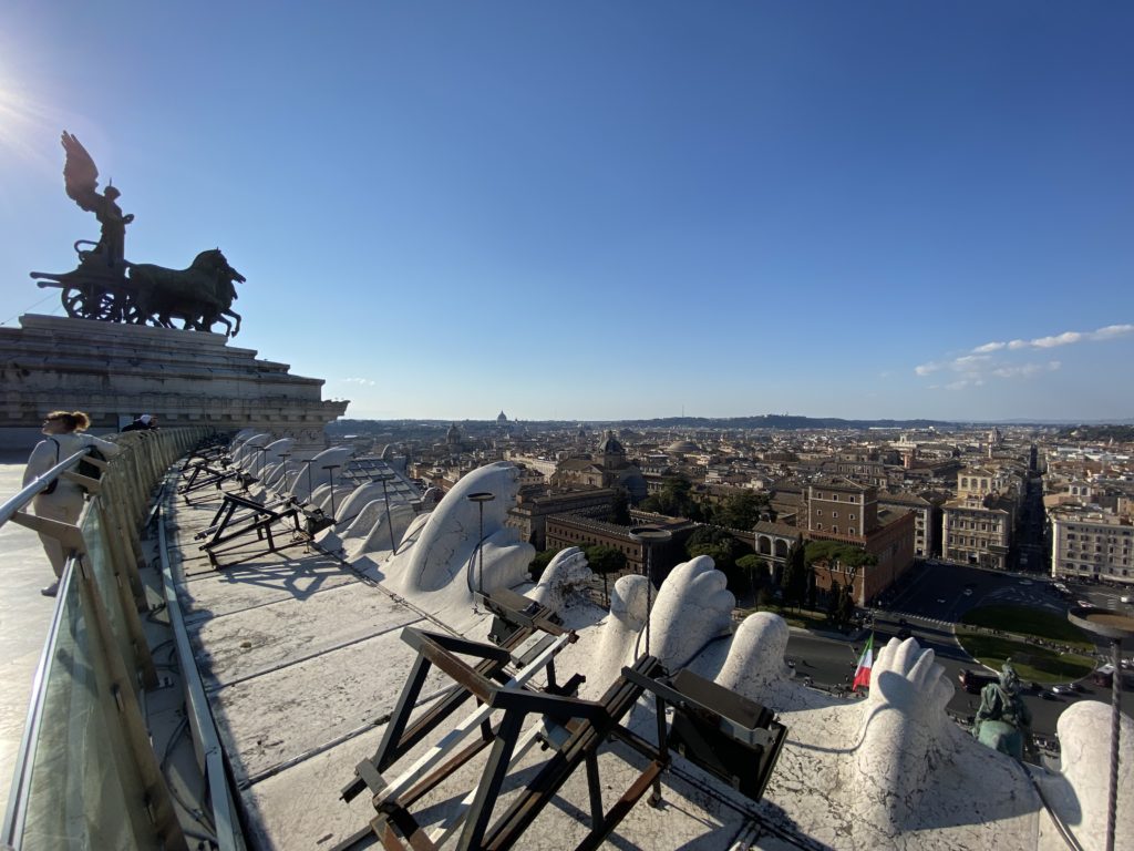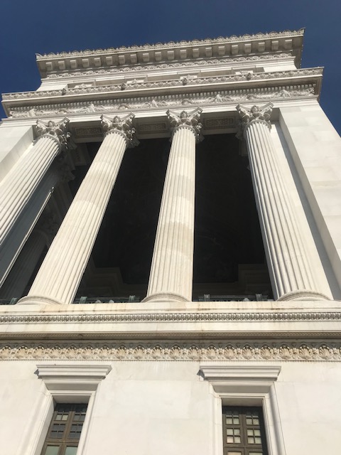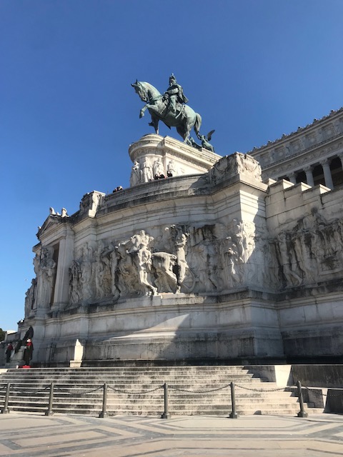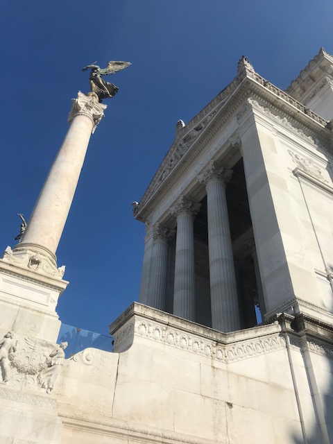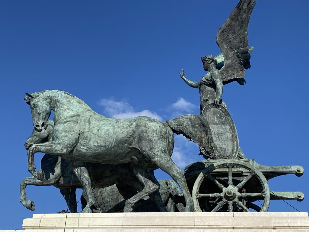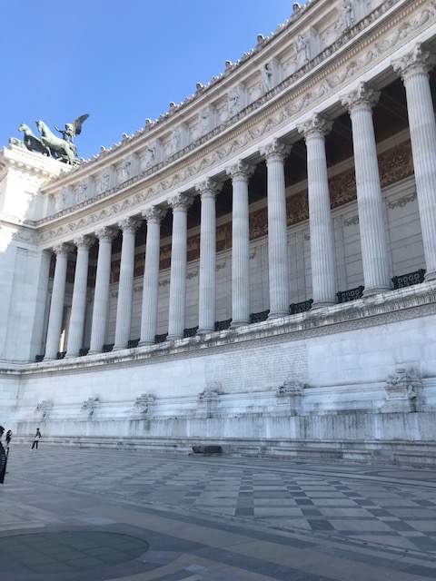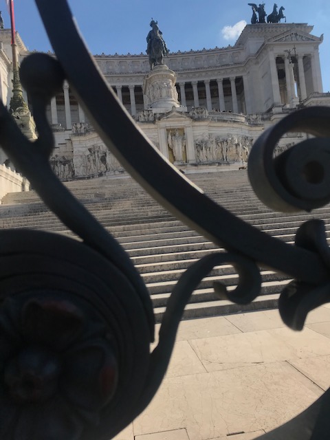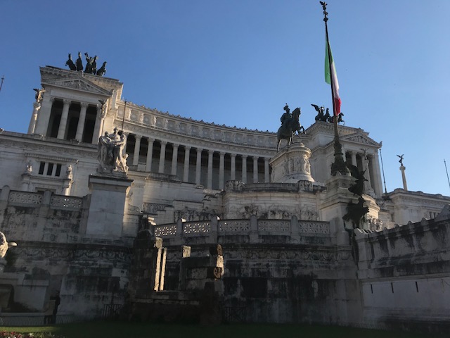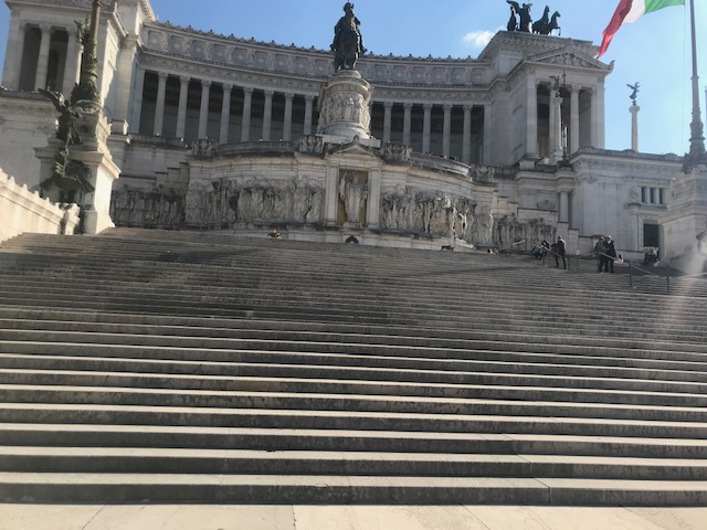 Il Vittoriano o Altare della Patria, monumento nazionale, fu costruito nel 1885 è terminato con gli ultimi interventi urbanistici nel 1935. Architettura ispirata al foro romano, una piazza greca, l’agora costruita su tre livelli. Portico, scalinate, colonnati rappresentano il sacello dove è posto il Milite Ignoto centrale a tutto il complesso architettonico. Sotto il regno di Vittorio Emanuele II di Savoia, il Vittoriano, opera dell’architetto Giuseppe Sacconi, celebra la valenza simbolica, le virtù, l’amor di Patria: un tempio laico al sacrificio e alle presunte virtù della patria come nell’Altare di Pergamo esposto al Permamonmuseum. Contiguo al Foro romano, il Vittoriano si è “poggiato” sulle memorie della storia dell’Urbe, nascondendo per sempre i sedimenti costitutivi, la topografia appunto della Roma Imperiale, come accadrà alcuni decennio dopo con l’apertura dell’asse stradale di Via dei Fori Imperiali nel periodo fascista.