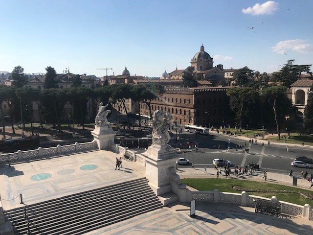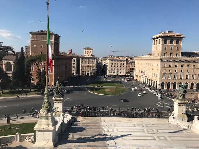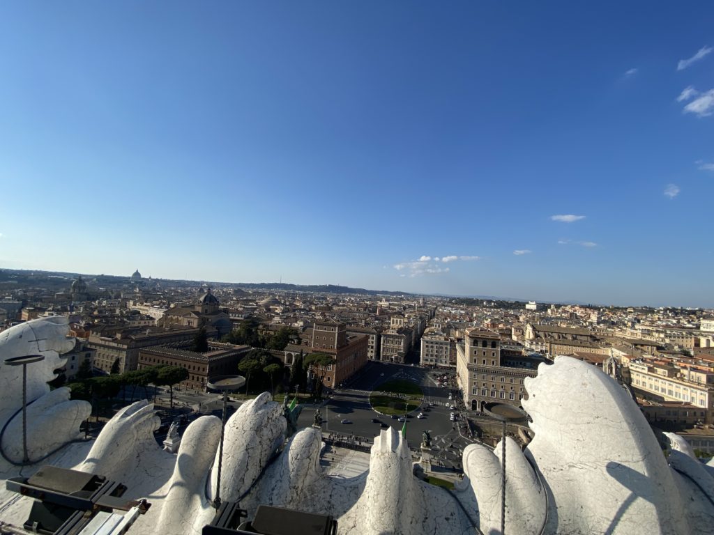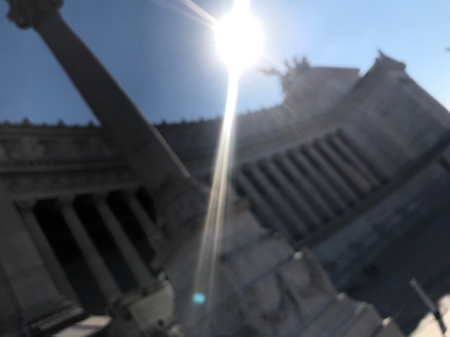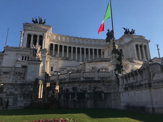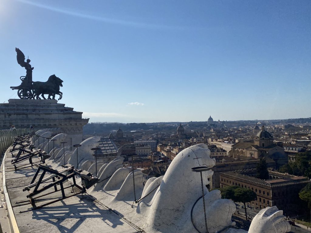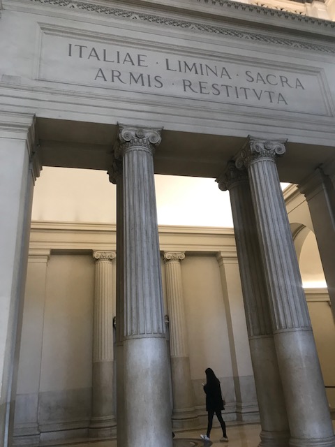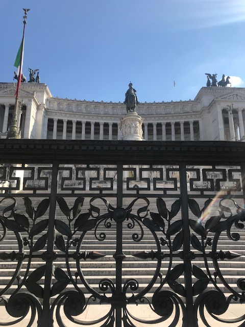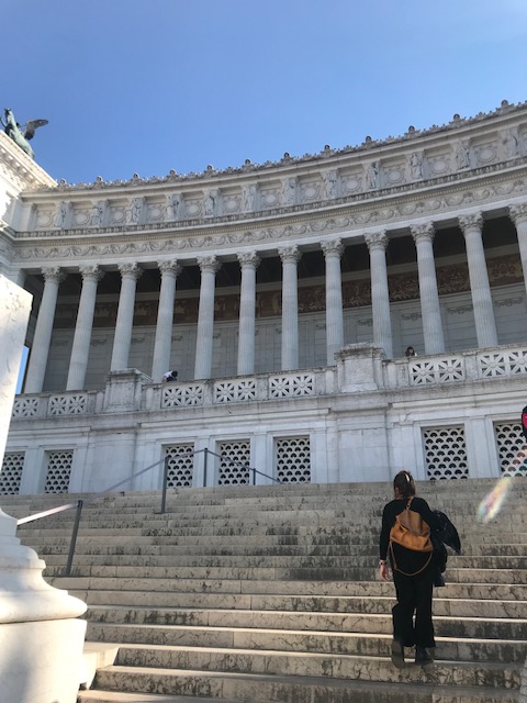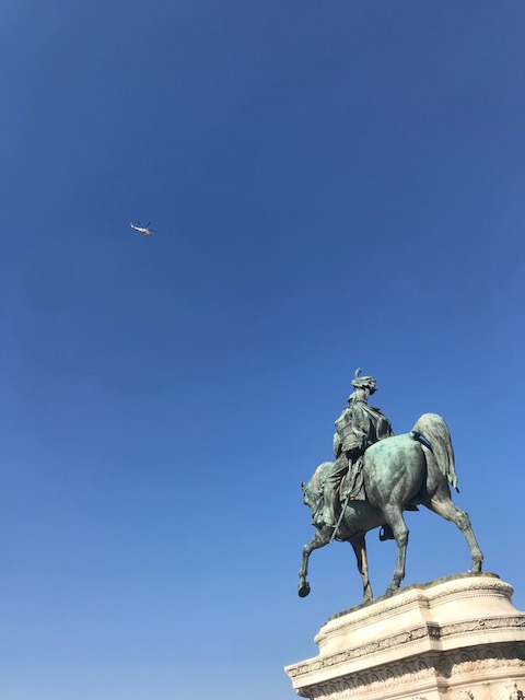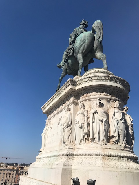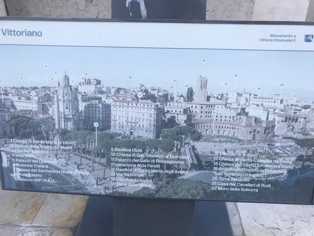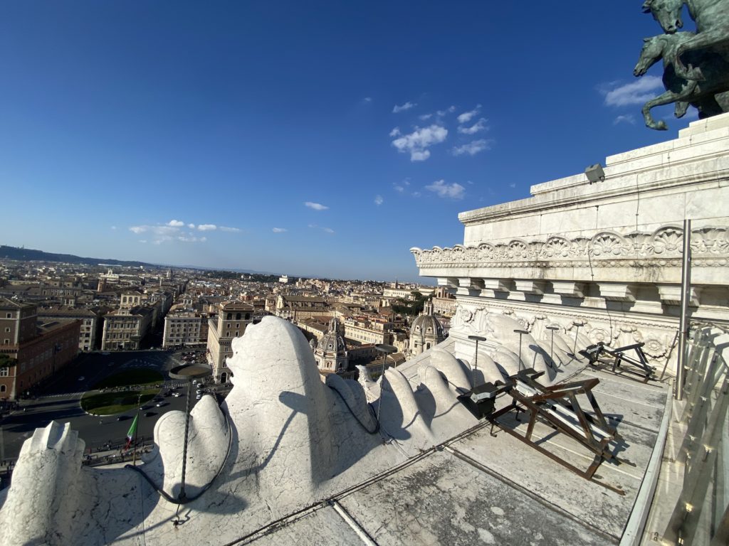 Il Vittoriano o Altare della Patria, monumento nazionale, fu costruito nel 1885 è terminato con gli ultimi interventi urbanistici nel 1935. Architettura ispirata al foro romano, una piazza greca, l’agora costruita su tre livelli. Portico, scalinate, colonnati rappresentano il sacello dove è posto il Milite Ignoto centrale a tutto il complesso architettonico. Sotto il regno di Vittorio Emanuele II di Savoia, il Vittoriano, opera dell’architetto Giuseppe Sacconi, celebra la valenza simbolica, le virtù, l’amor di Patria: un tempio laico al sacrificio e alle presunte virtù della patria come nell’Altare di Pergamo esposto al Permamonmuseum. Contiguo al Foro romano, il Vittoriano si è “poggiato” sulle memorie della storia dell’Urbe, nascondendo per sempre i sedimenti costitutivi, la topografia appunto della Roma Imperiale, come accadrà alcuni decennio dopo con l’apertura dell’asse stradale di Via dei Fori Imperiali nel periodo fascista.