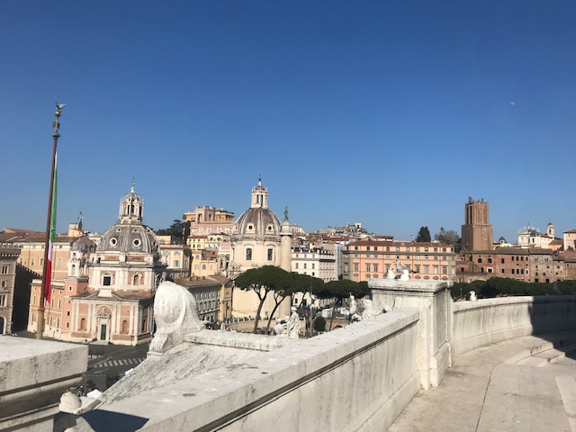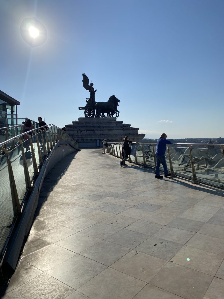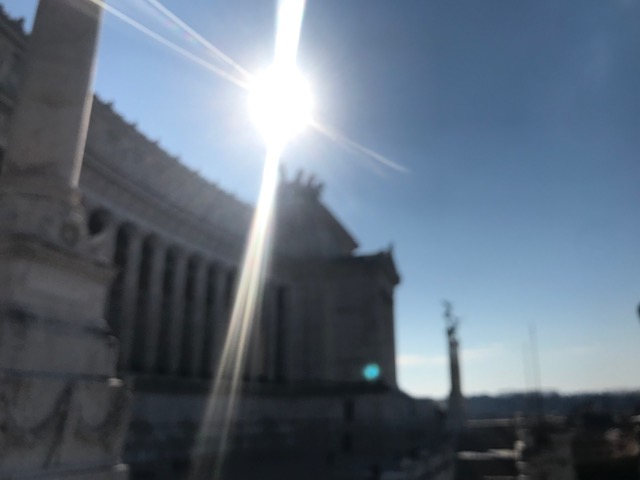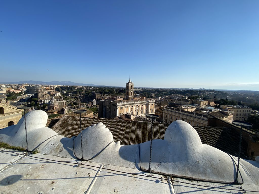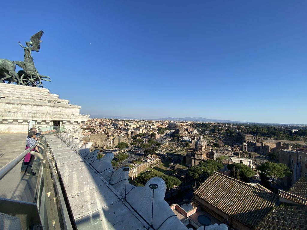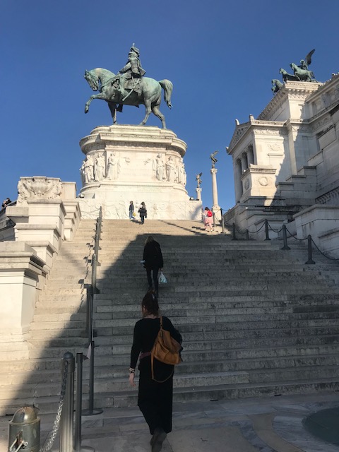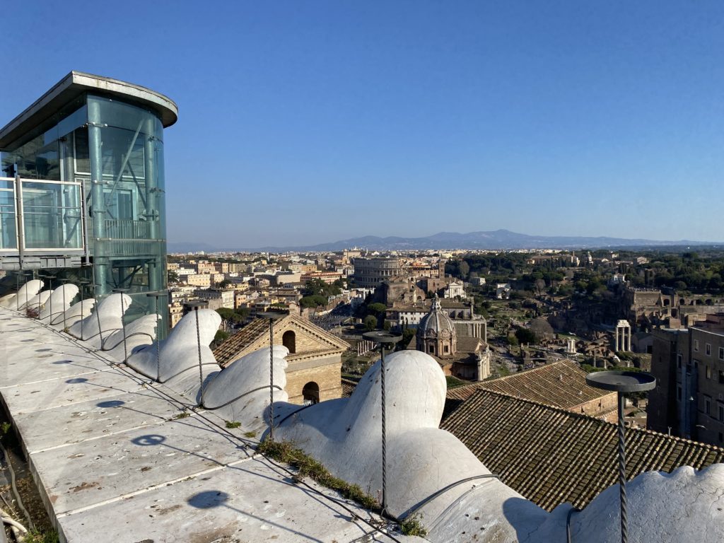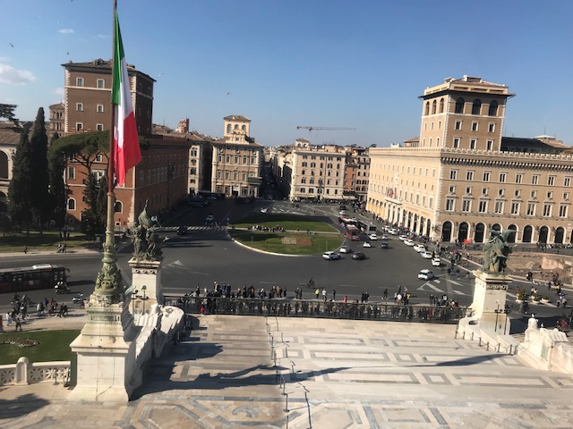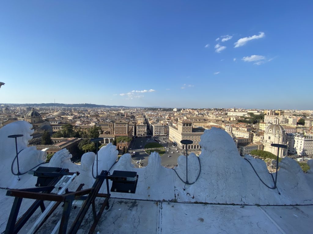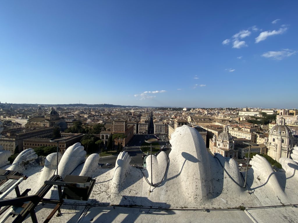 Il Vittoriano o Altare della Patria, monumento nazionale, fu costruito nel 1885 è terminato con gli ultimi interventi urbanistici nel 1935. Architettura ispirata al foro romano, una piazza greca, l’agora costruita su tre livelli. Portico, scalinate, colonnati rappresentano il sacello dove è posto il Milite Ignoto centrale a tutto il complesso architettonico. Sotto il regno di Vittorio Emanuele II di Savoia, il Vittoriano, opera dell’architetto Giuseppe Sacconi, celebra la valenza simbolica, le virtù, l’amor di Patria: un tempio laico al sacrificio e alle presunte virtù della patria come nell’Altare di Pergamo esposto al Permamonmuseum. Contiguo al Foro romano, il Vittoriano si è “poggiato” sulle memorie della storia dell’Urbe, nascondendo per sempre i sedimenti costitutivi, la topografia appunto della Roma Imperiale, come accadrà alcuni decennio dopo con l’apertura dell’asse stradale di Via dei Fori Imperiali nel periodo fascista.