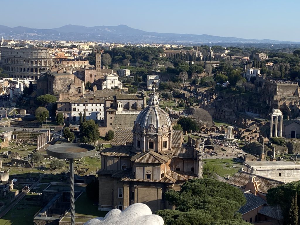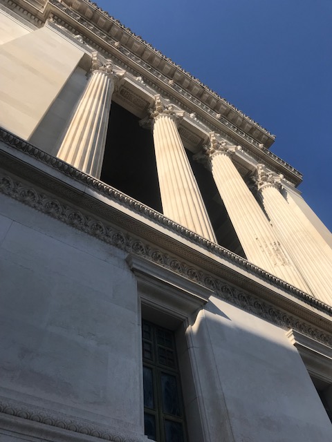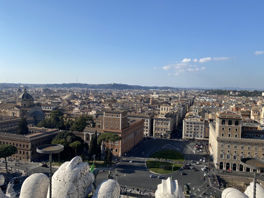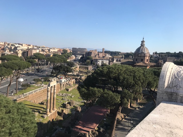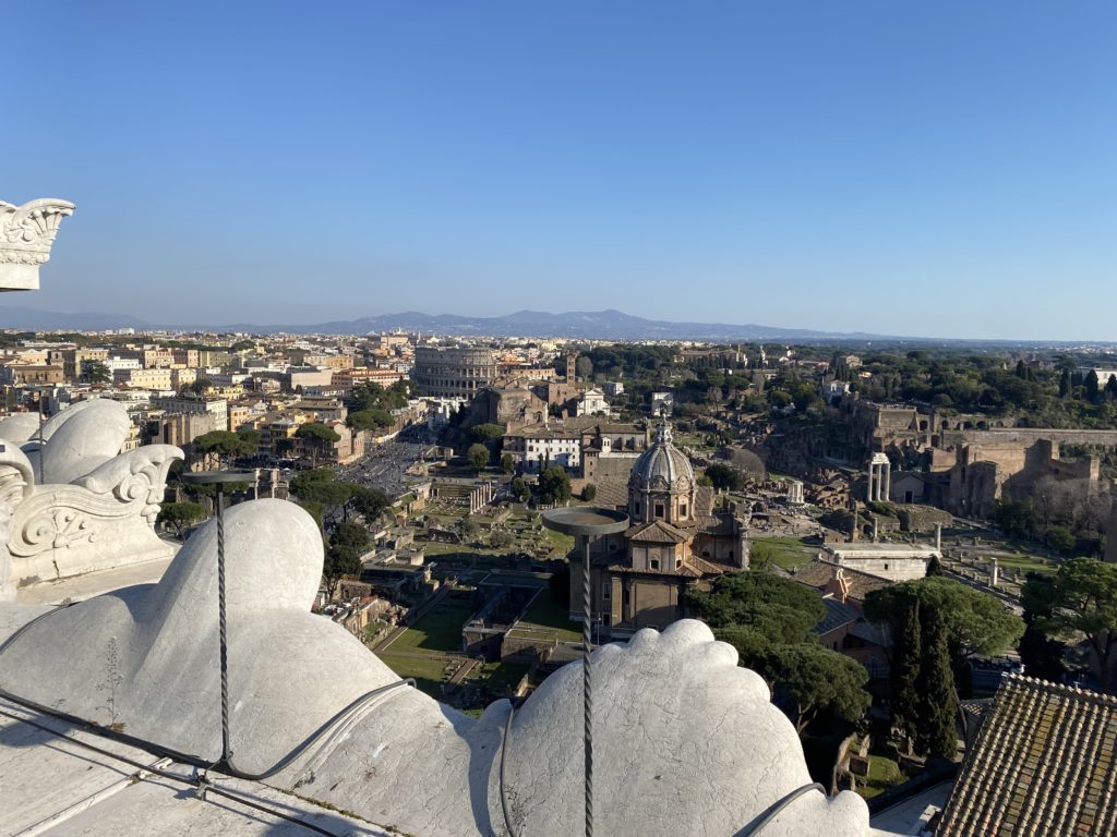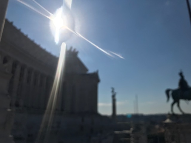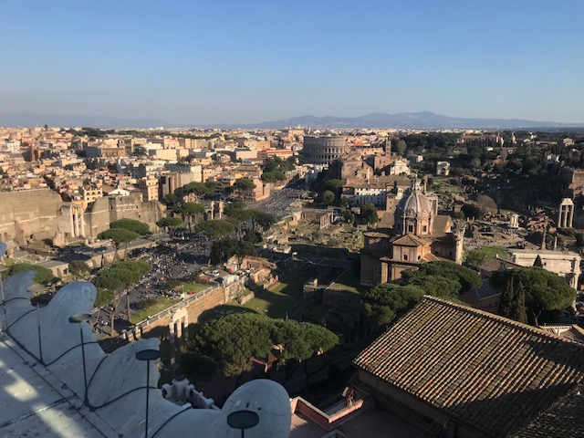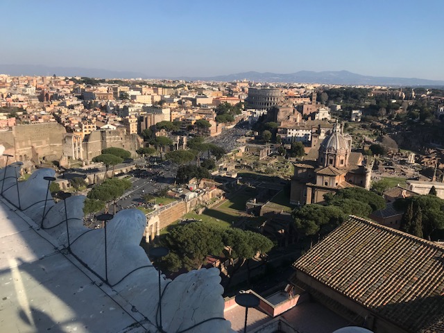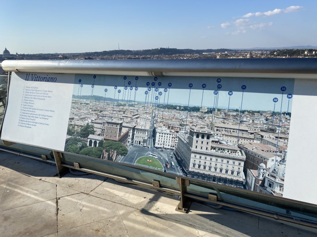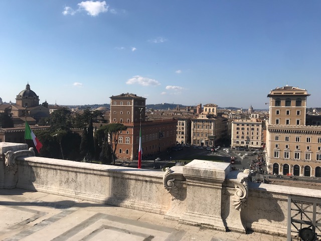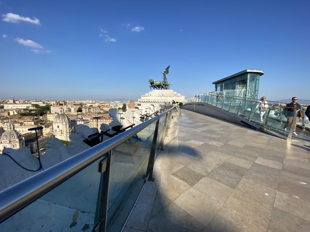 Il Vittoriano o Altare della Patria, monumento nazionale, fu costruito nel 1885 è terminato con gli ultimi interventi urbanistici nel 1935. Architettura ispirata al foro romano, una piazza greca, l’agora costruita su tre livelli. Portico, scalinate, colonnati rappresentano il sacello dove è posto il Milite Ignoto centrale a tutto il complesso architettonico. Sotto il regno di Vittorio Emanuele II di Savoia, il Vittoriano, opera dell’architetto Giuseppe Sacconi, celebra la valenza simbolica, le virtù, l’amor di Patria: un tempio laico al sacrificio e alle presunte virtù della patria come nell’Altare di Pergamo esposto al Permamonmuseum. Contiguo al Foro romano, il Vittoriano si è “poggiato” sulle memorie della storia dell’Urbe, nascondendo per sempre i sedimenti costitutivi, la topografia appunto della Roma Imperiale, come accadrà alcuni decennio dopo con l’apertura dell’asse stradale di Via dei Fori Imperiali nel periodo fascista.
