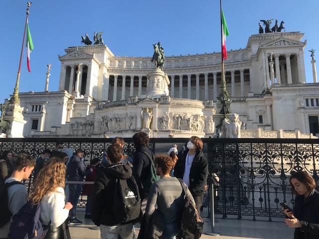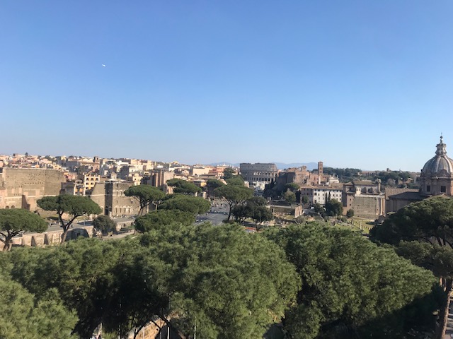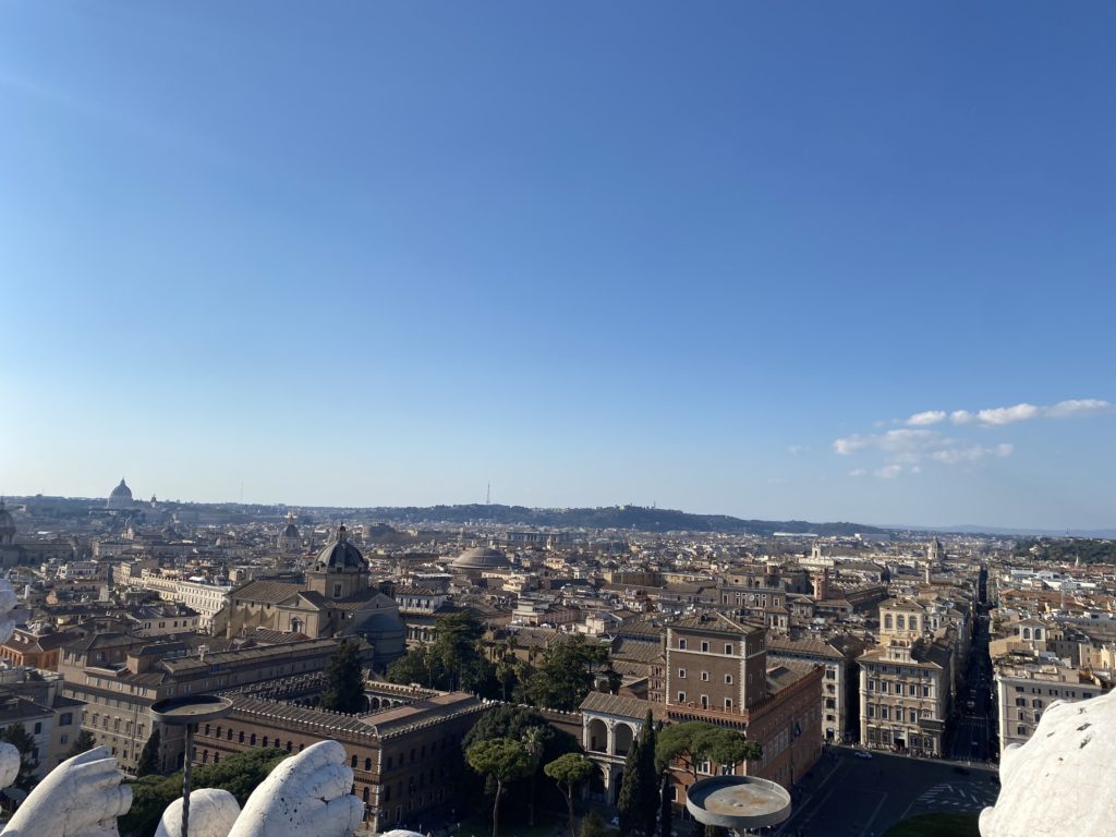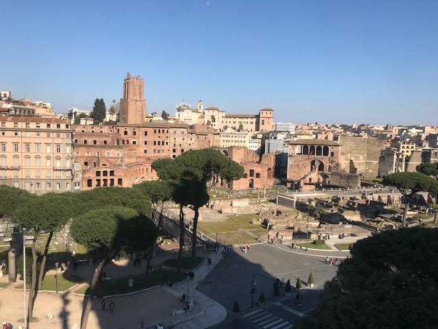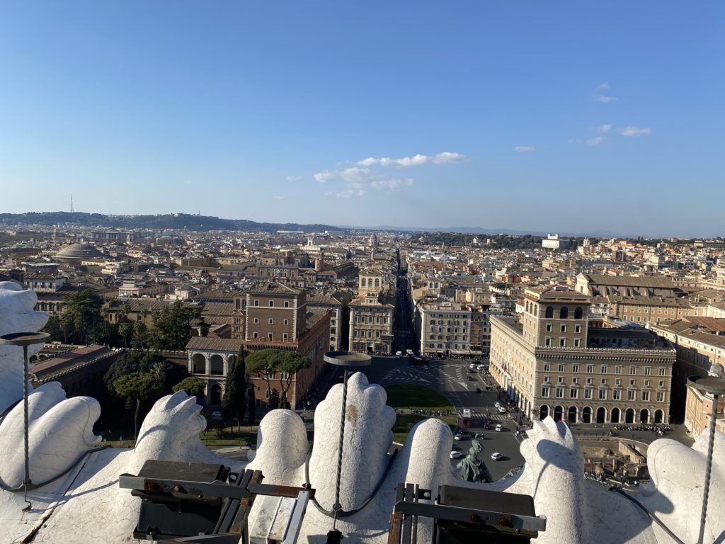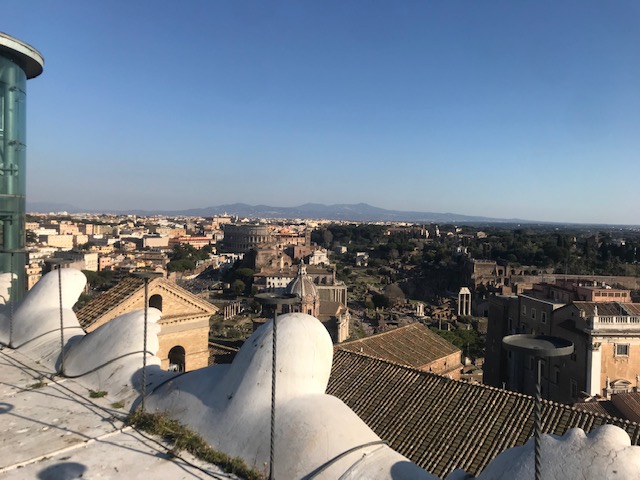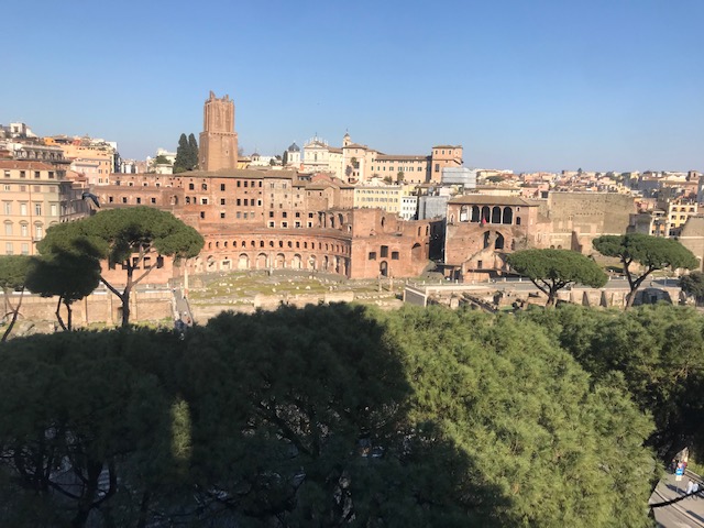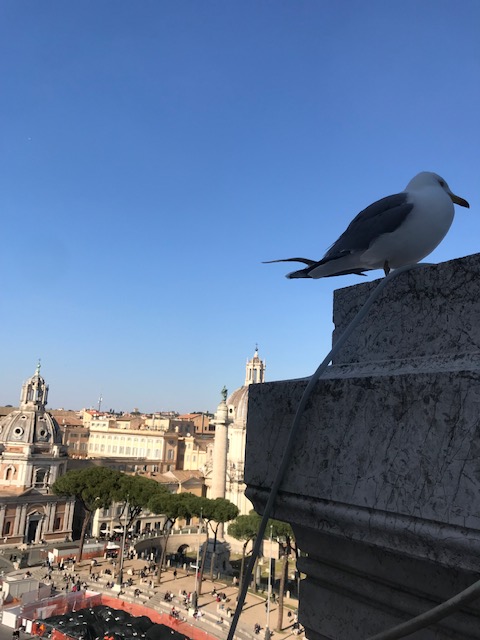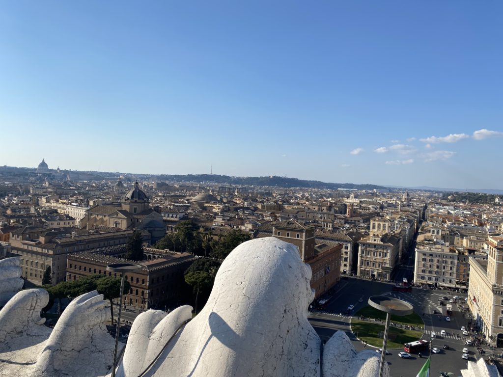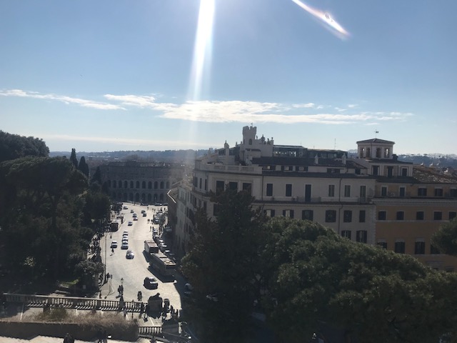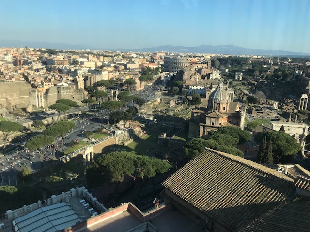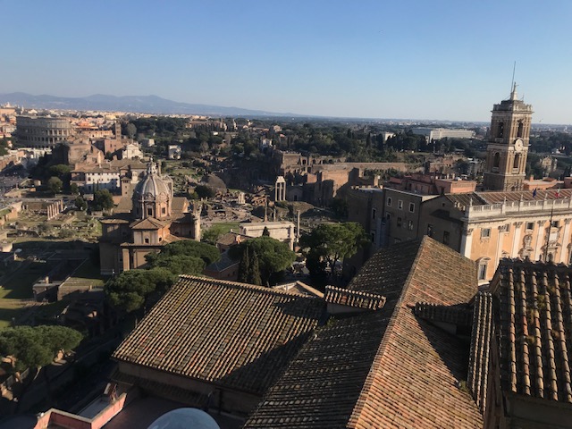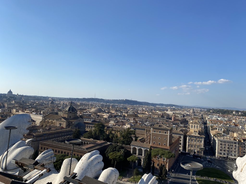 Il Vittoriano o Altare della Patria, monumento nazionale, fu costruito nel 1885 è terminato con gli ultimi interventi urbanistici nel 1935. Architettura ispirata al foro romano, una piazza greca, l’agora costruita su tre livelli. Portico, scalinate, colonnati rappresentano il sacello dove è posto il Milite Ignoto centrale a tutto il complesso architettonico. Sotto il regno di Vittorio Emanuele II di Savoia, il Vittoriano, opera dell’architetto Giuseppe Sacconi, celebra la valenza simbolica, le virtù, l’amor di Patria: un tempio laico al sacrificio e alle presunte virtù della patria come nell’Altare di Pergamo esposto al Permamonmuseum. Contiguo al Foro romano, il Vittoriano si è “poggiato” sulle memorie della storia dell’Urbe, nascondendo per sempre i sedimenti costitutivi, la topografia appunto della Roma Imperiale, come accadrà alcuni decennio dopo con l’apertura dell’asse stradale di Via dei Fori Imperiali nel periodo fascista.