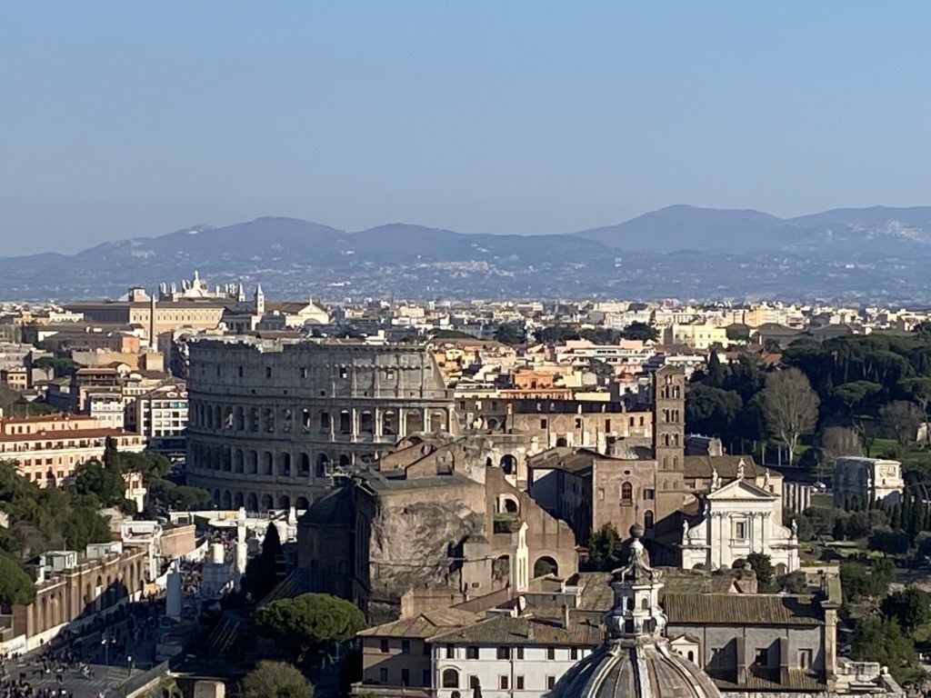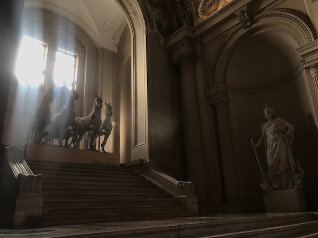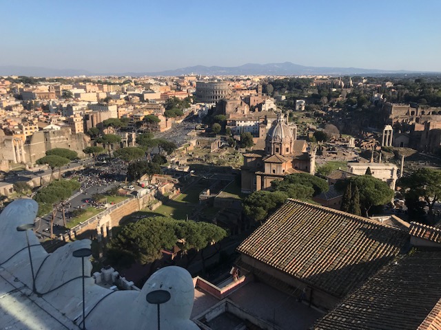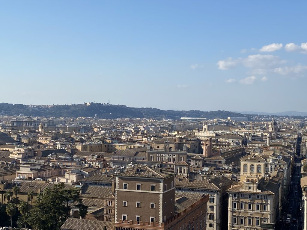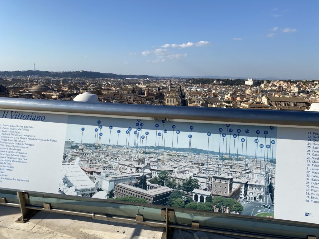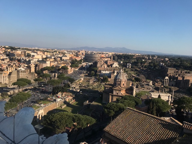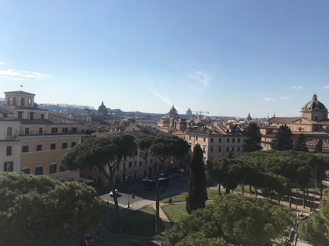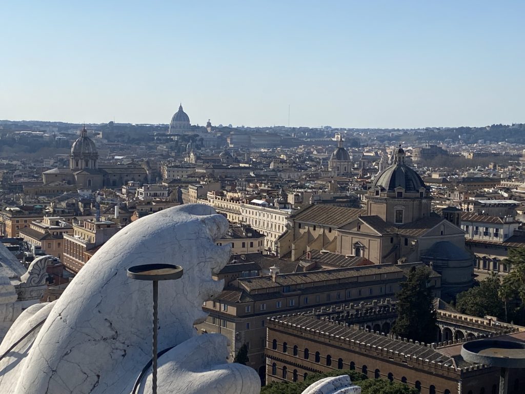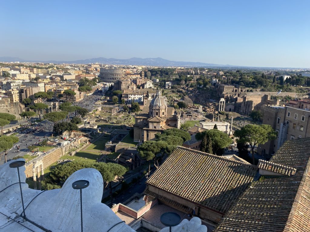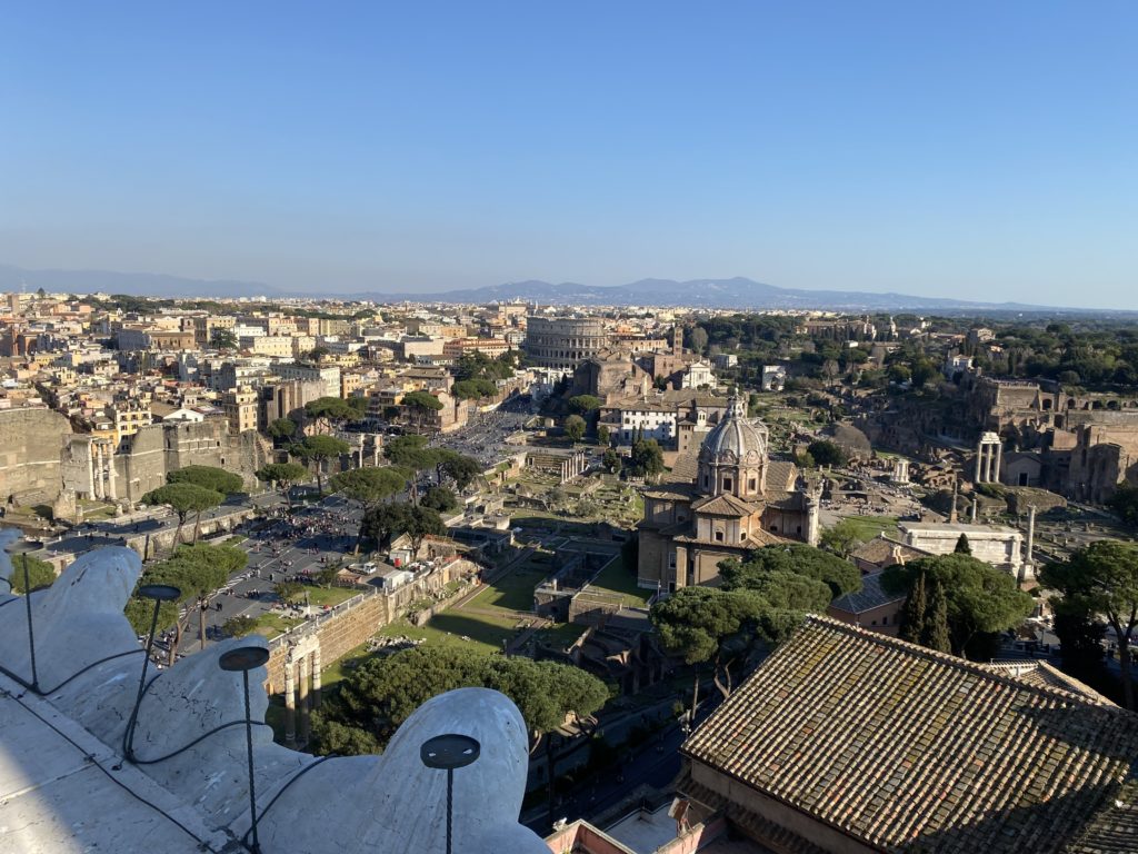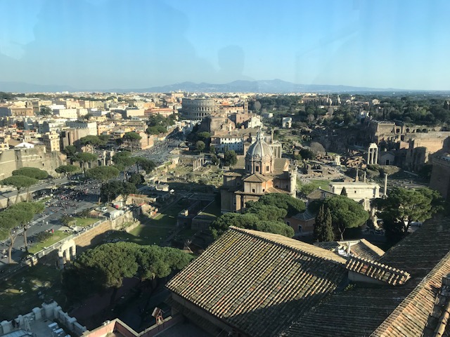 Il Vittoriano o Altare della Patria, monumento nazionale, fu costruito nel 1885 è terminato con gli ultimi interventi urbanistici nel 1935. Architettura ispirata al foro romano, una piazza greca, l’agora costruita su tre livelli. Portico, scalinate, colonnati rappresentano il sacello dove è posto il Milite Ignoto centrale a tutto il complesso architettonico. Sotto il regno di Vittorio Emanuele II di Savoia, il Vittoriano, opera dell’architetto Giuseppe Sacconi, celebra la valenza simbolica, le virtù, l’amor di Patria: un tempio laico al sacrificio e alle presunte virtù della patria come nell’Altare di Pergamo esposto al Permamonmuseum. Contiguo al Foro romano, il Vittoriano si è “poggiato” sulle memorie della storia dell’Urbe, nascondendo per sempre i sedimenti costitutivi, la topografia appunto della Roma Imperiale, come accadrà alcuni decennio dopo con l’apertura dell’asse stradale di Via dei Fori Imperiali nel periodo fascista.